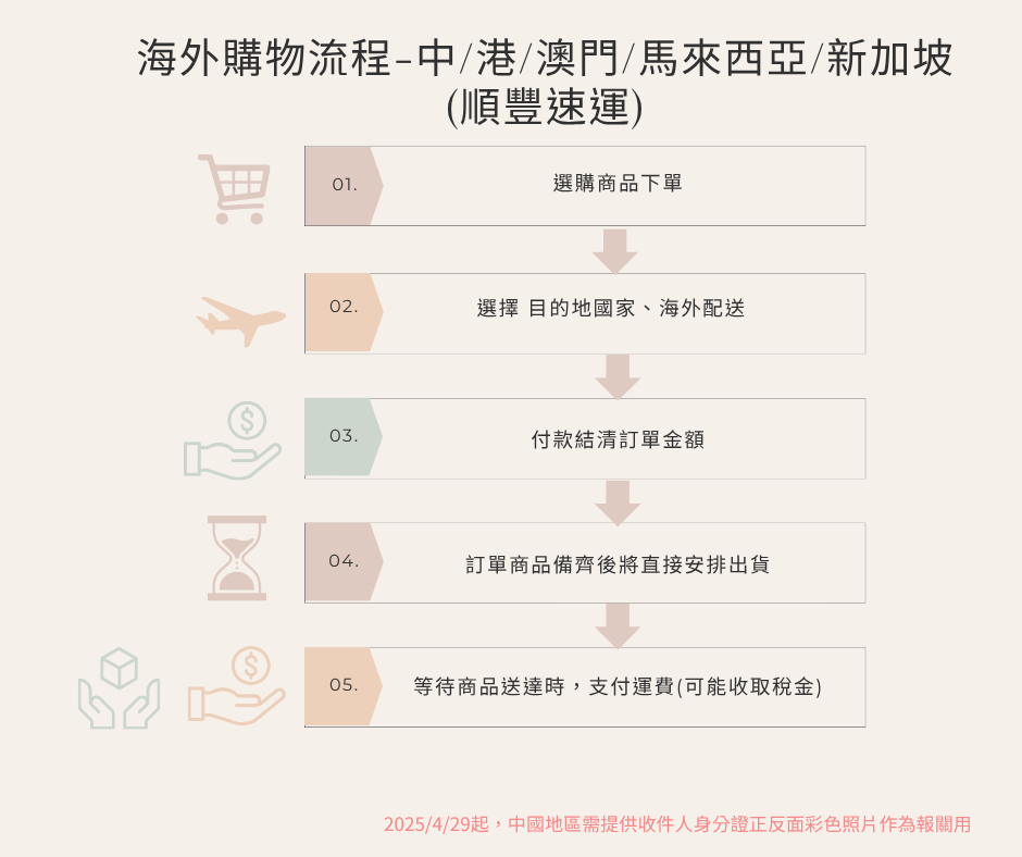 *2025/04/29起,中國地區 需提供收件人身分證正反面彩色照片,作為報關使用,請於訂單訊息內上傳;若收件方為公司行號,僅需提供公司名(清關抽查時須提供營業證照),無須提供個人證件*