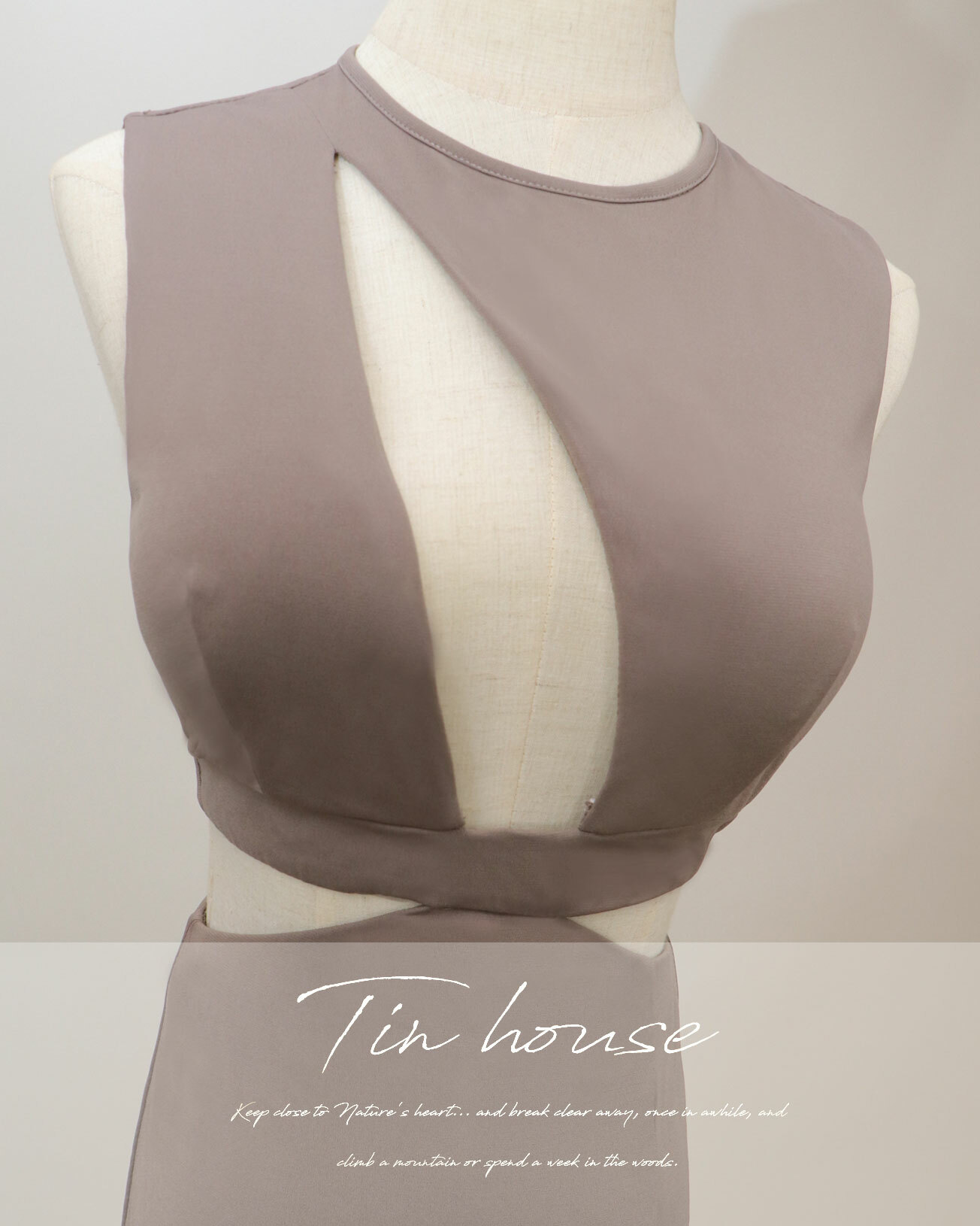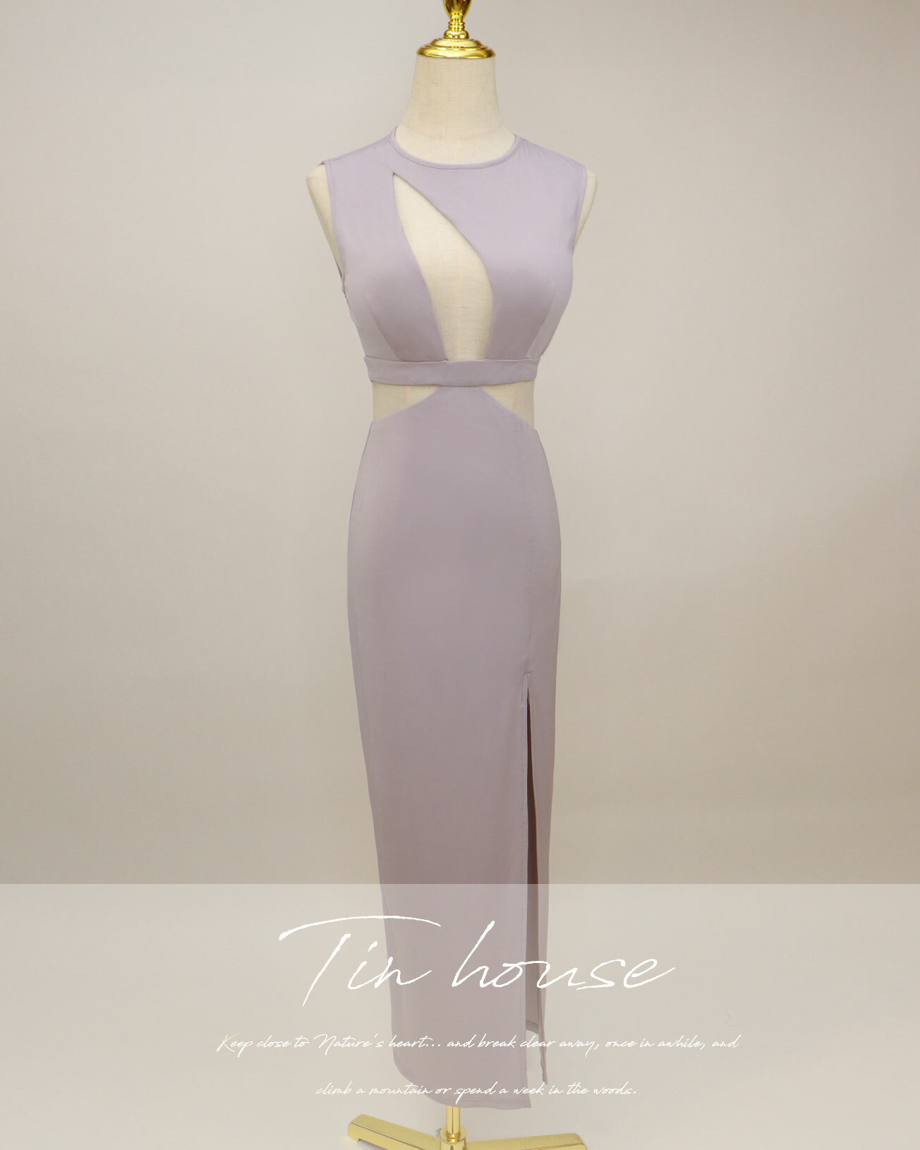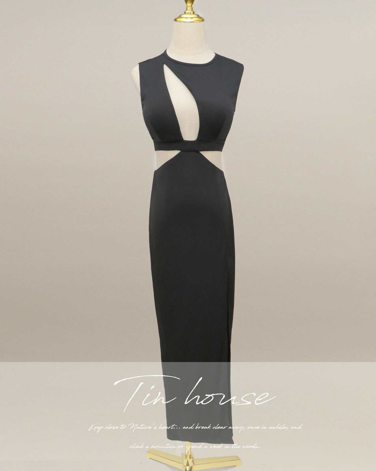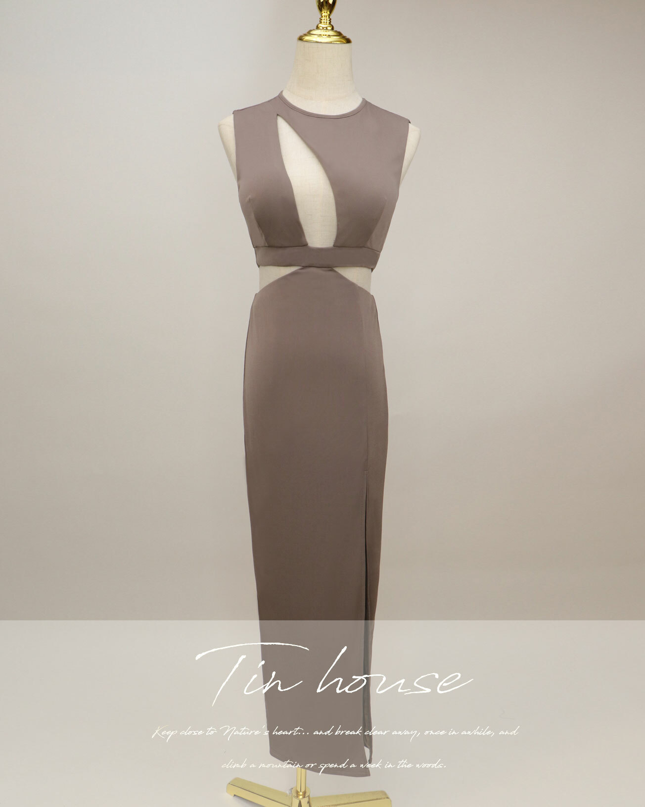 ⭒訂製-性感斜挖胸露腰側開衩長洋