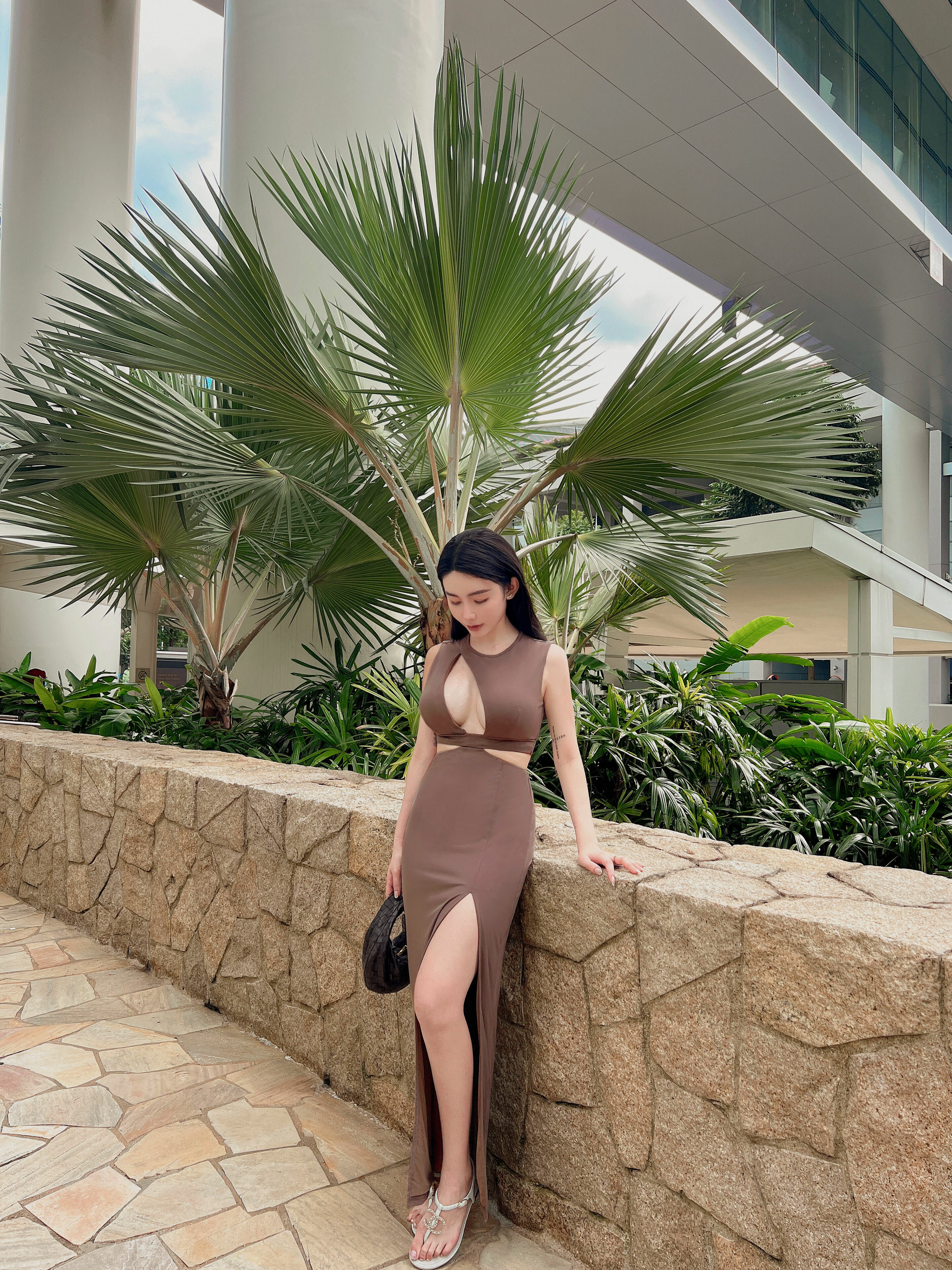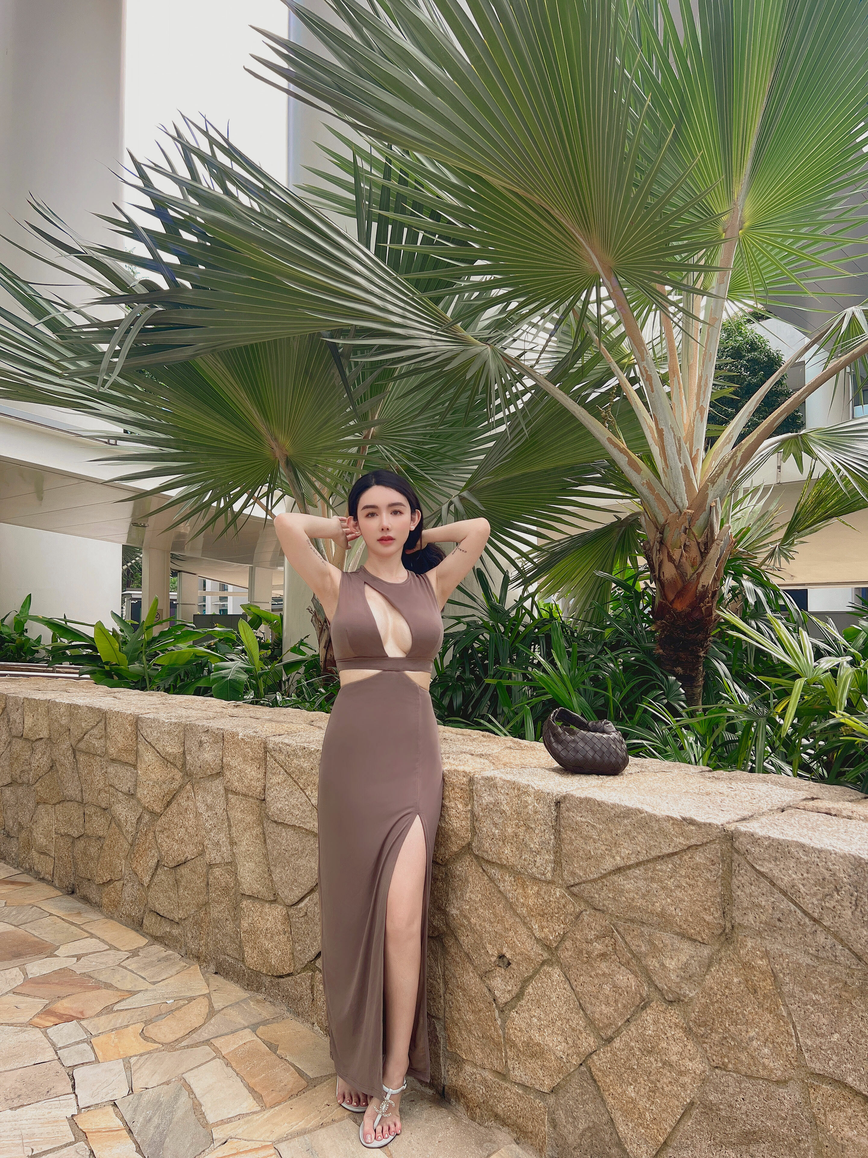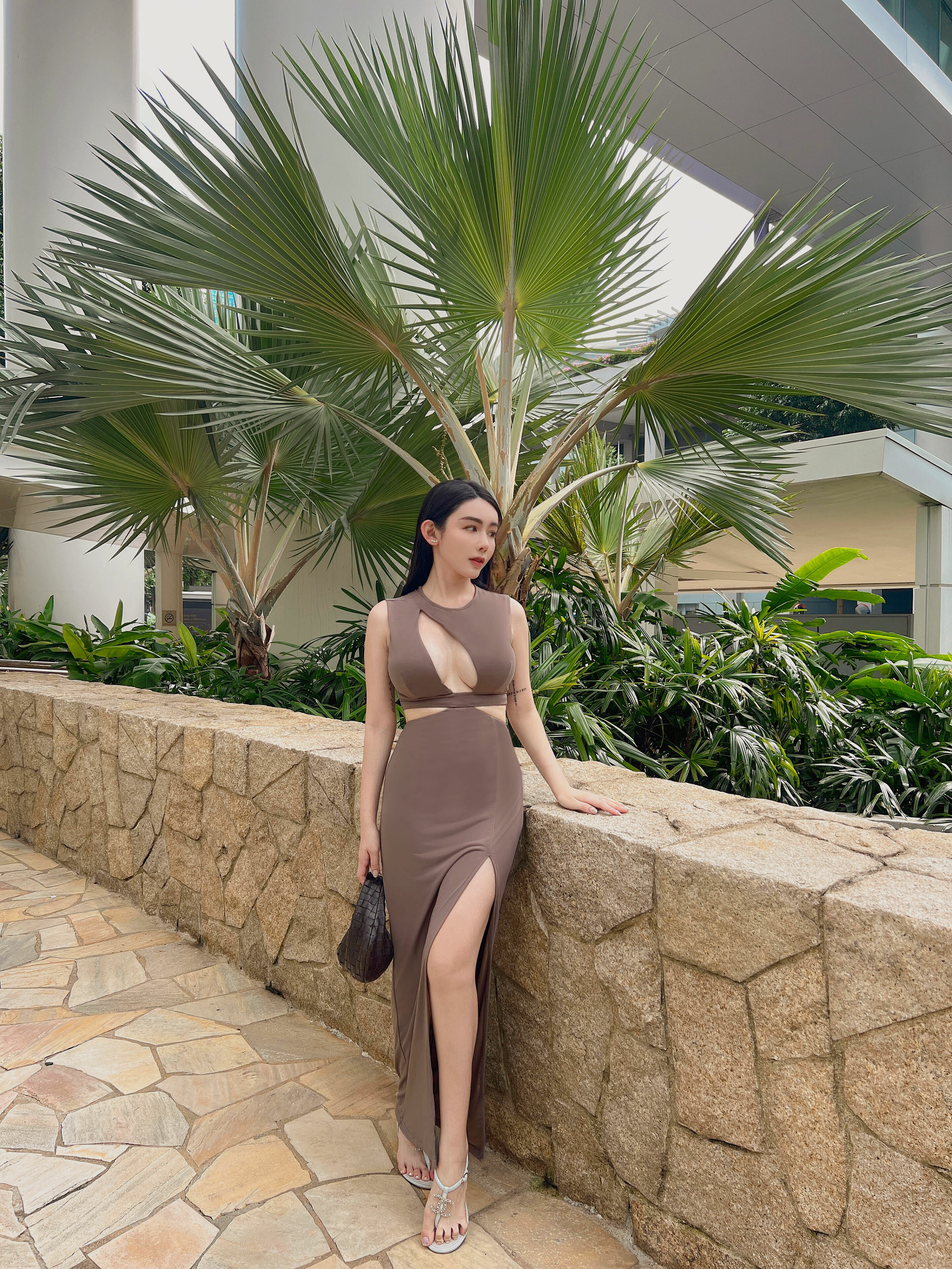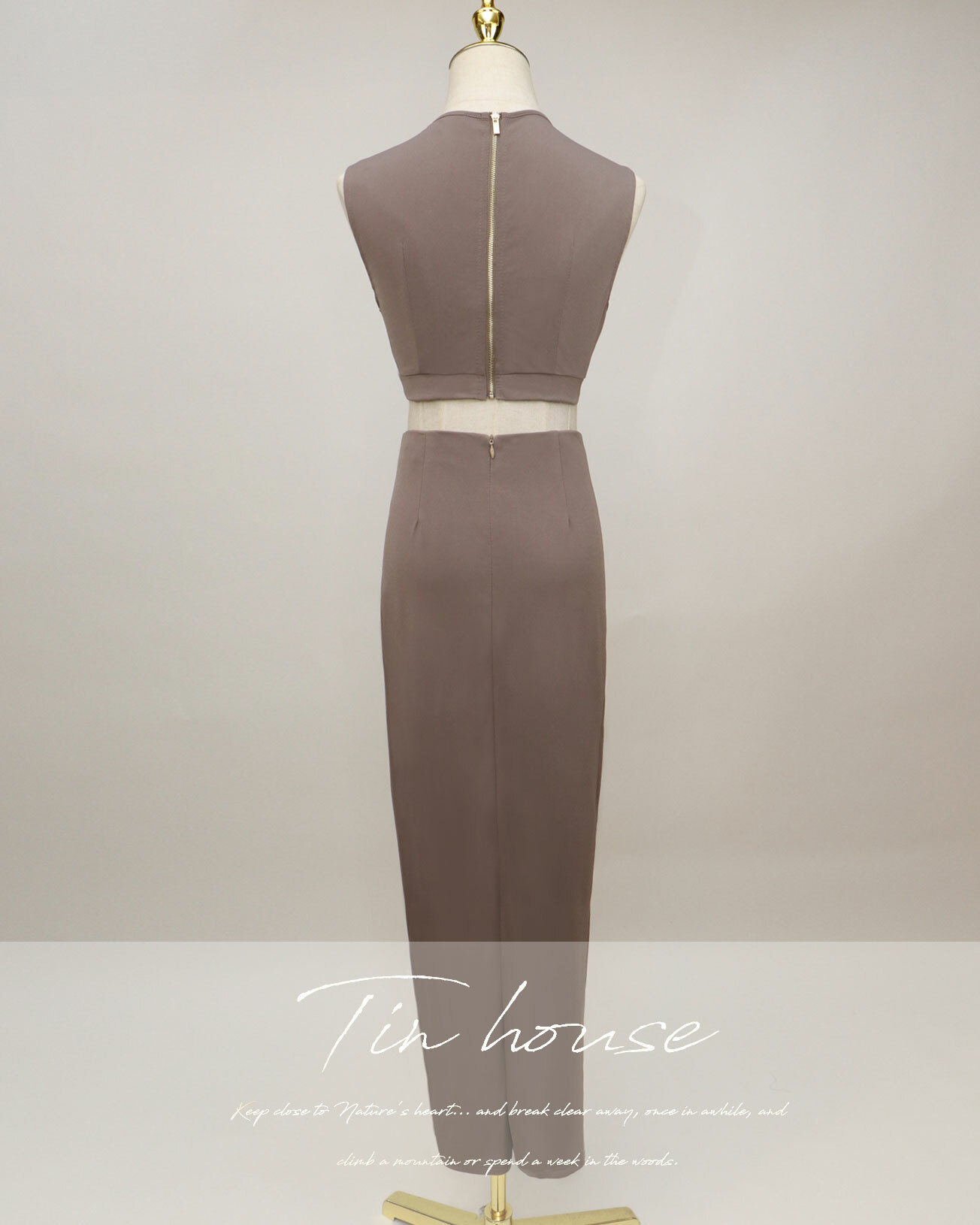 ⭒訂製-性感斜挖胸露腰側開衩長洋