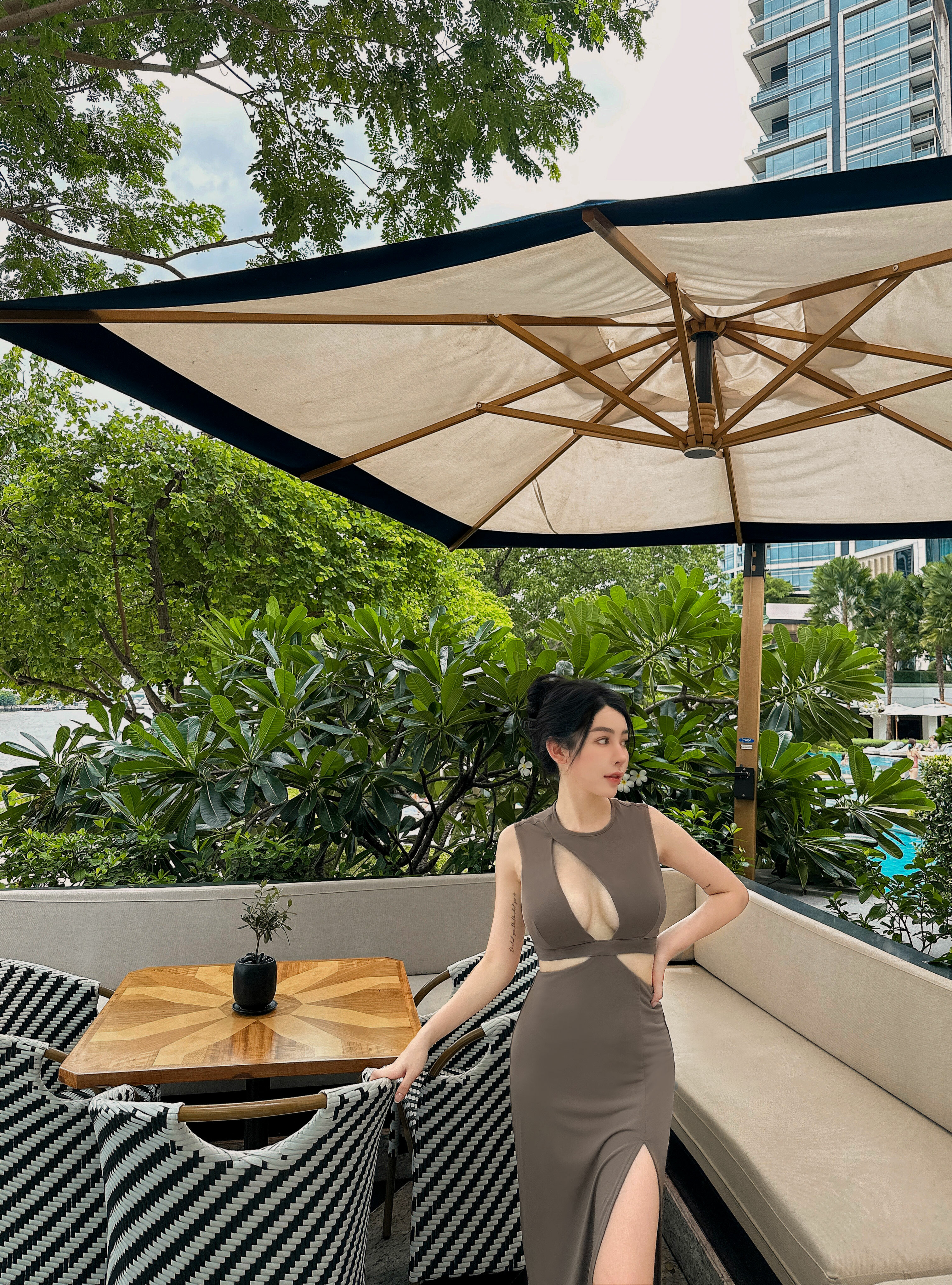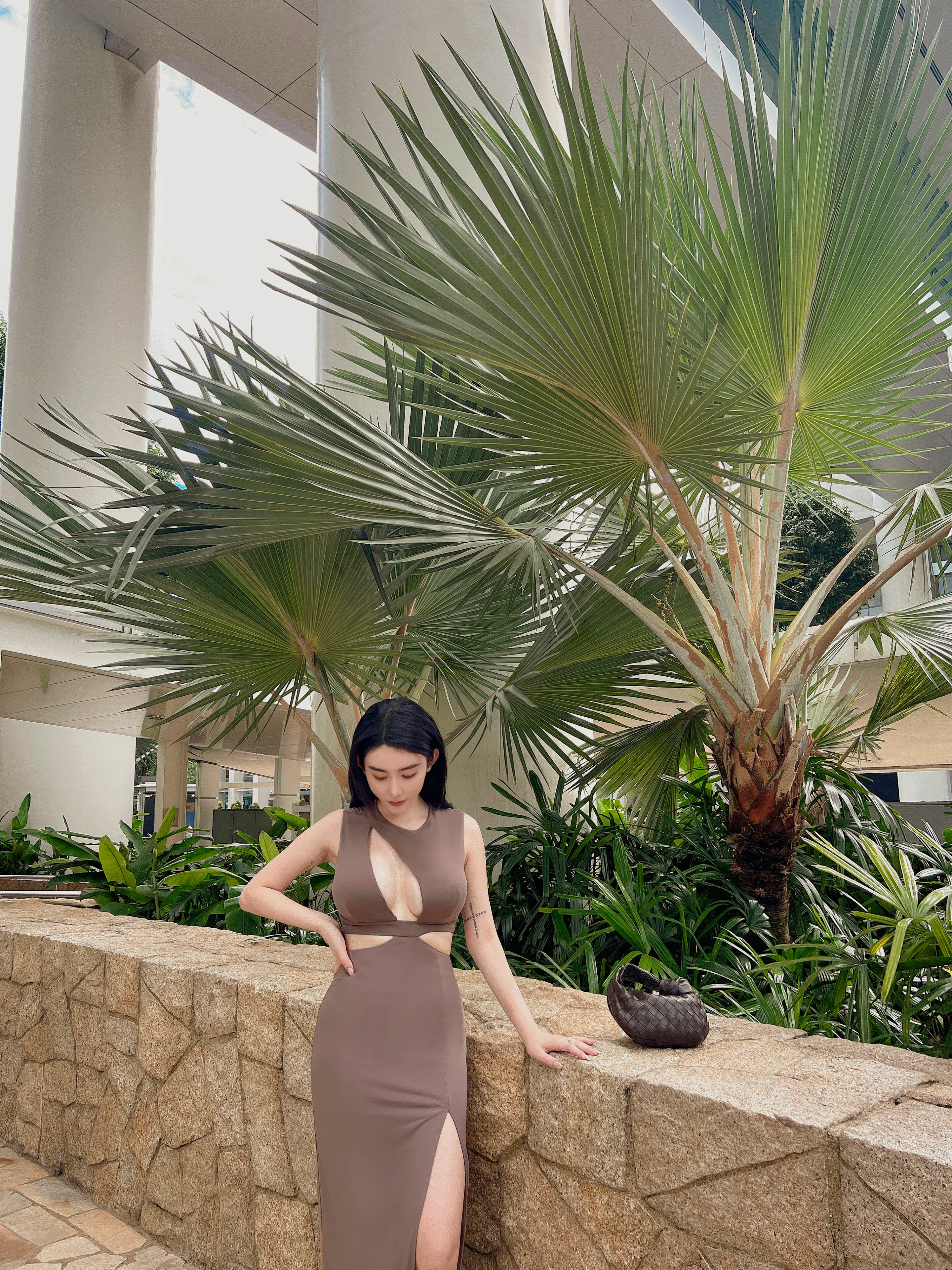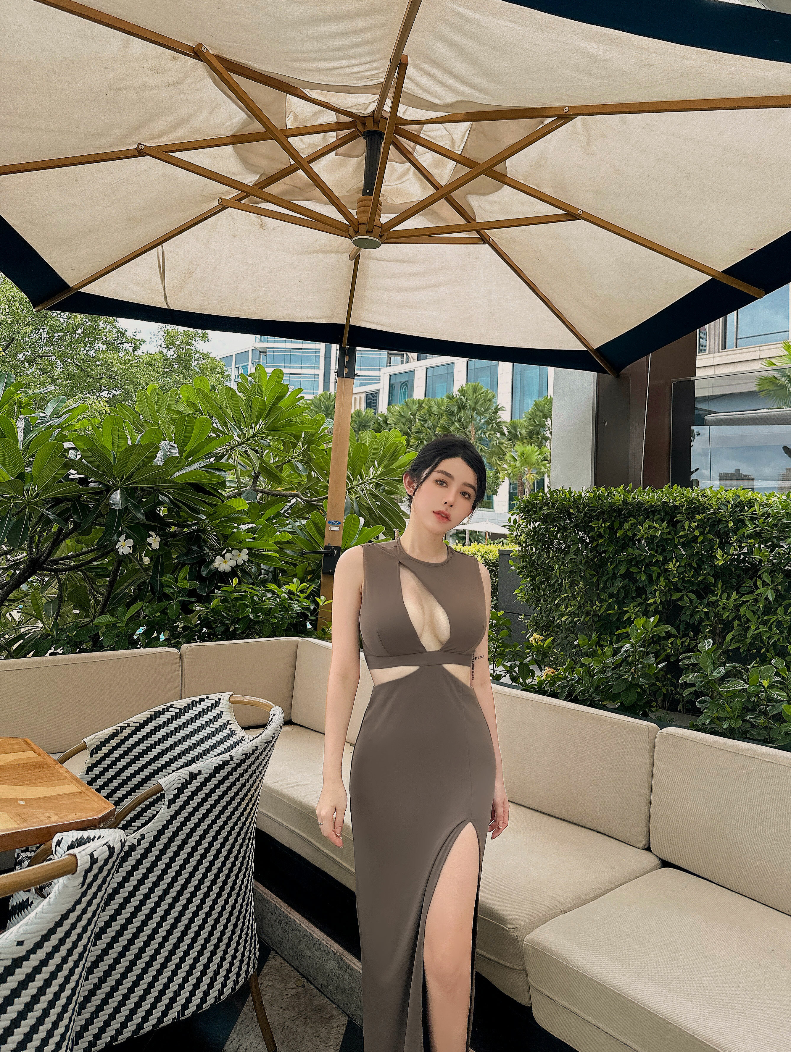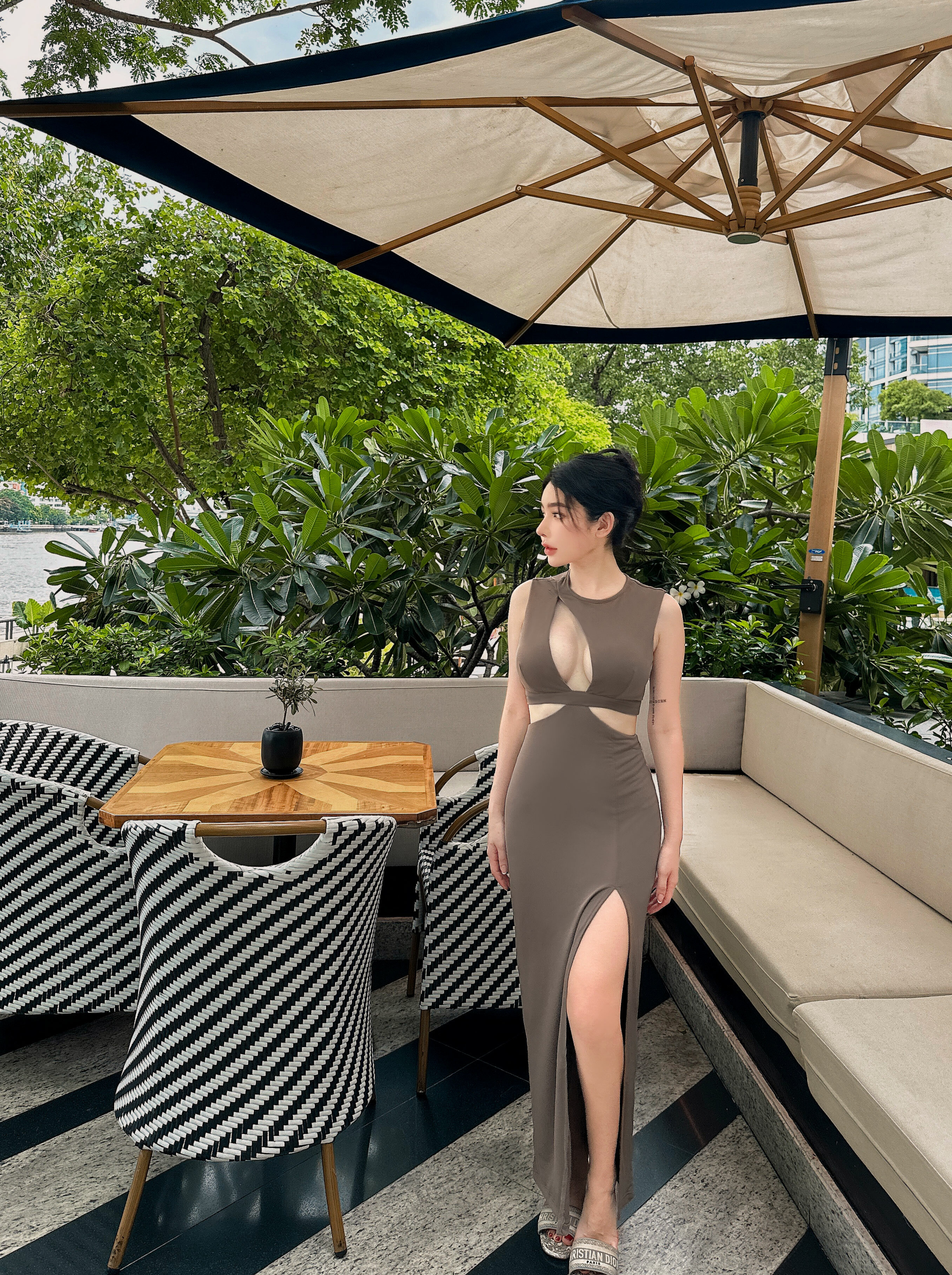 ⭒訂製-性感斜挖胸露腰側開衩長洋