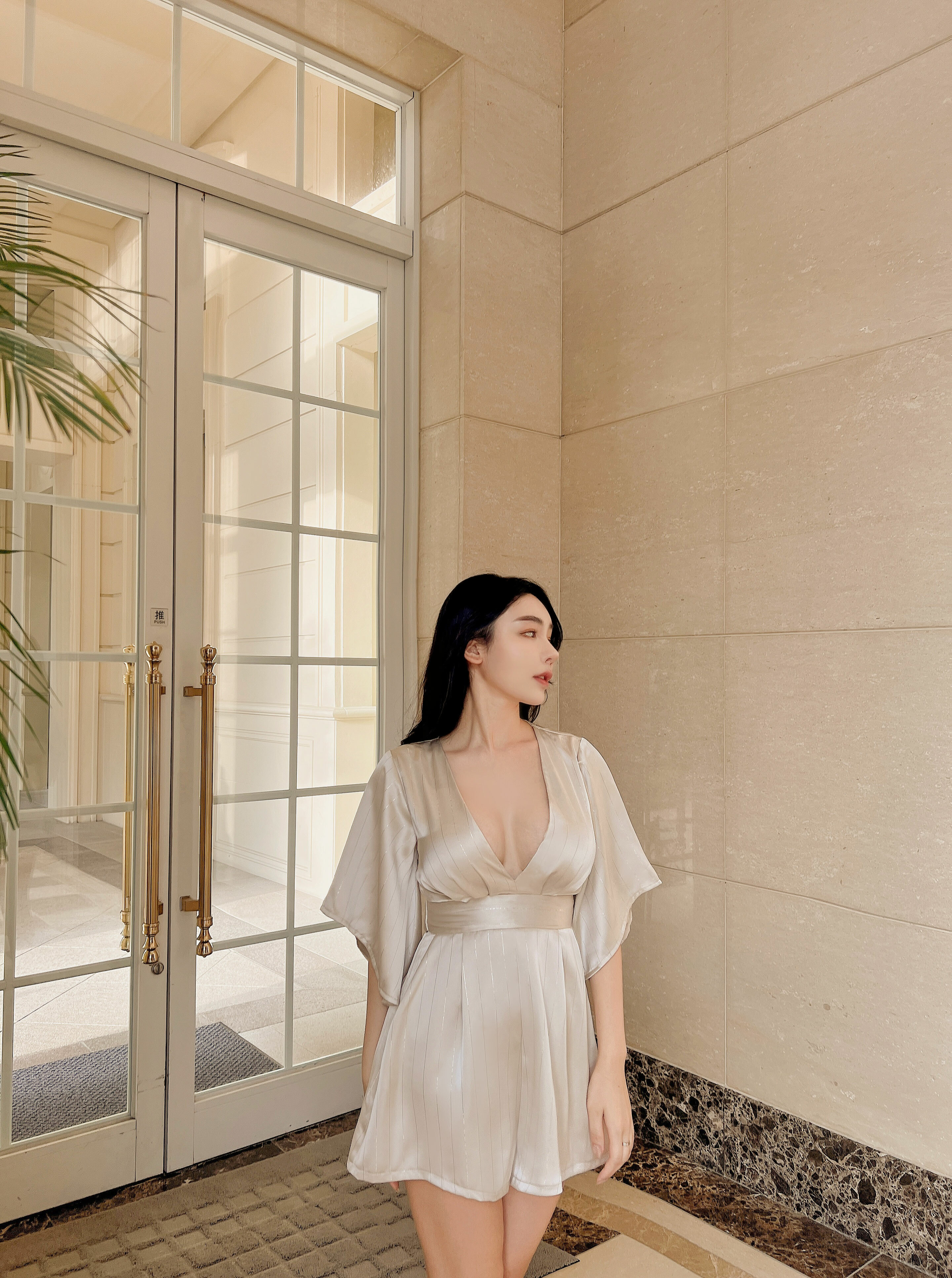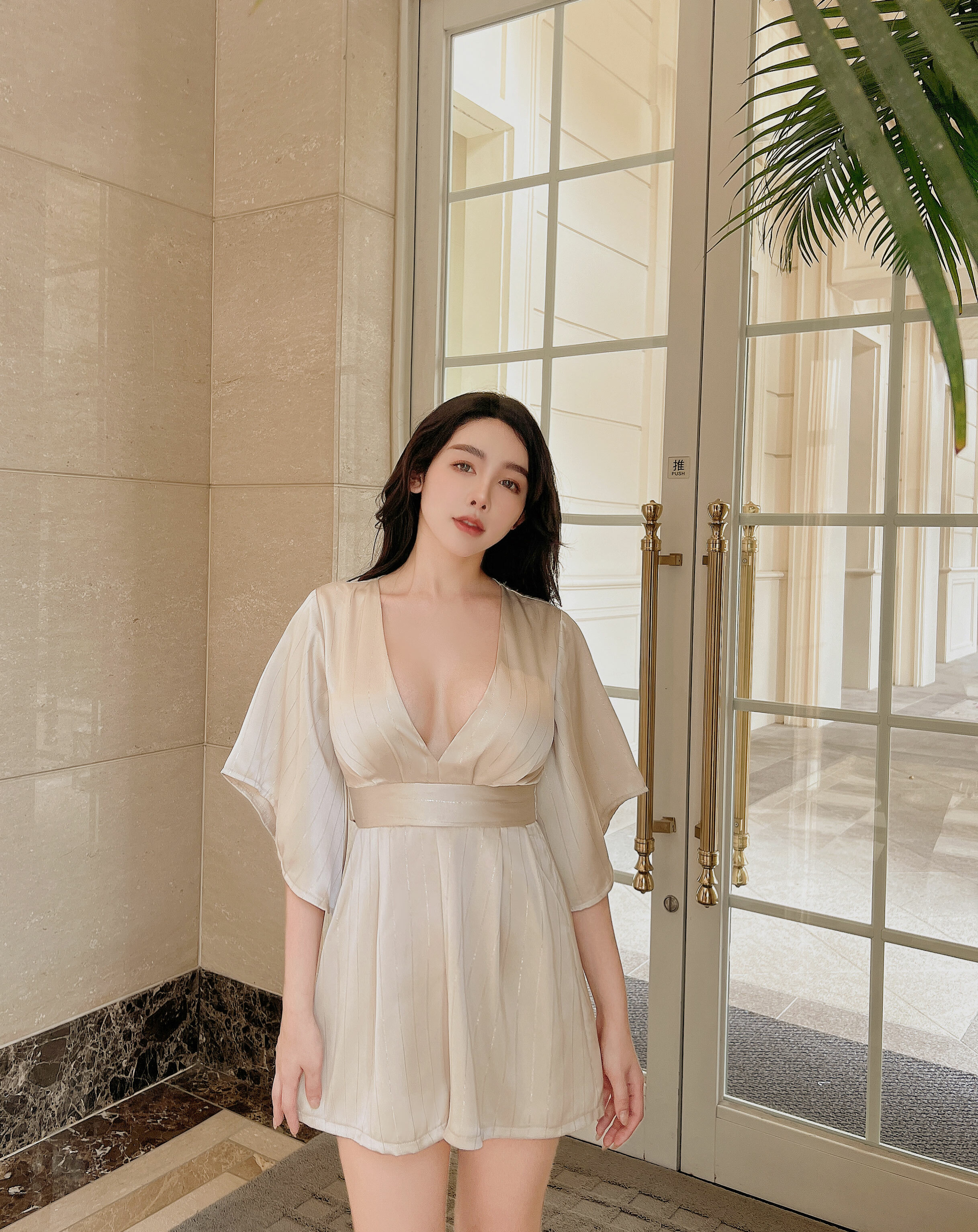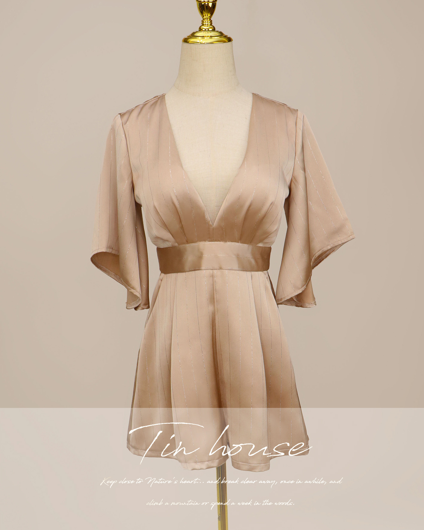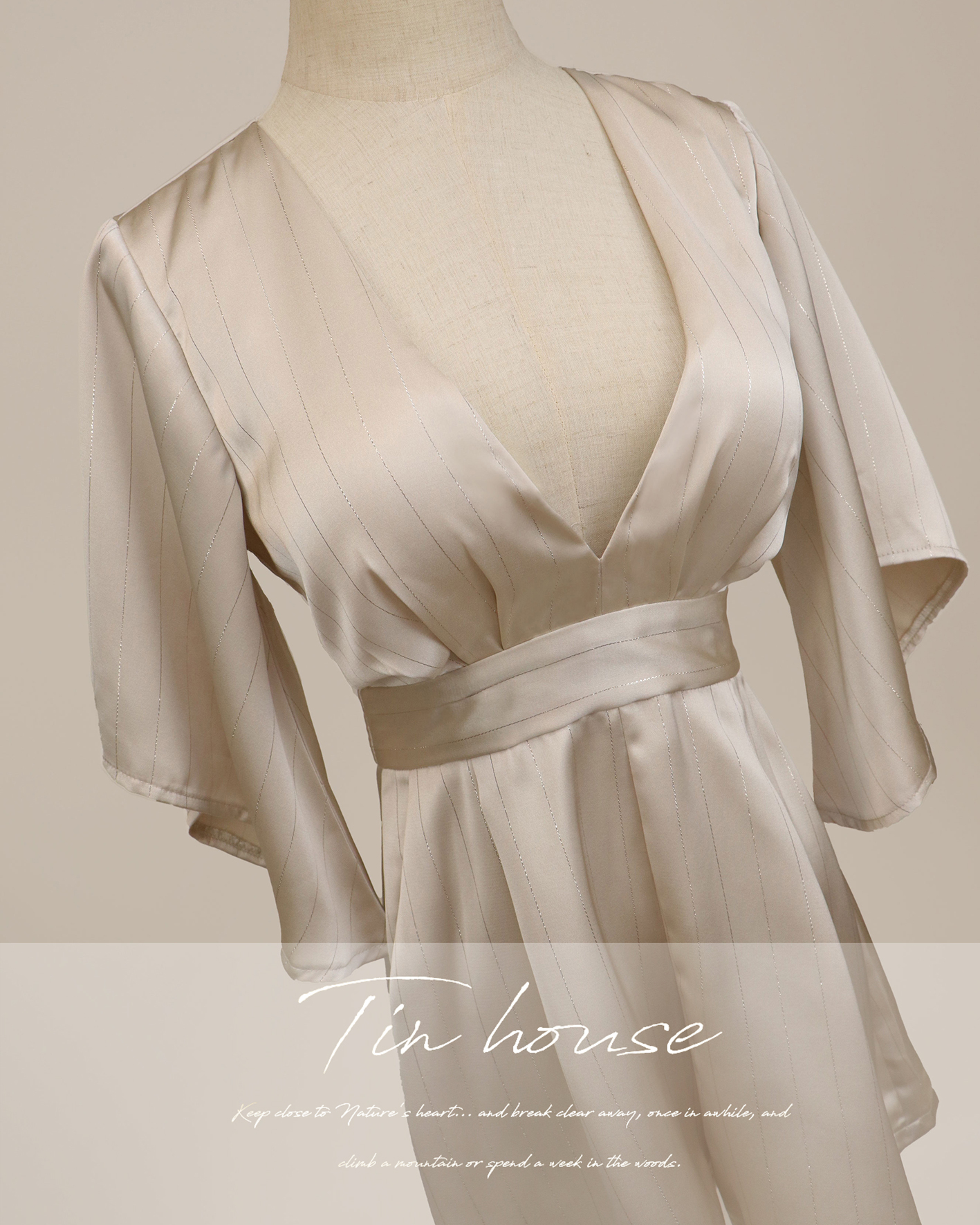 ⭒訂製-條紋緞面V領水袖連身褲裝