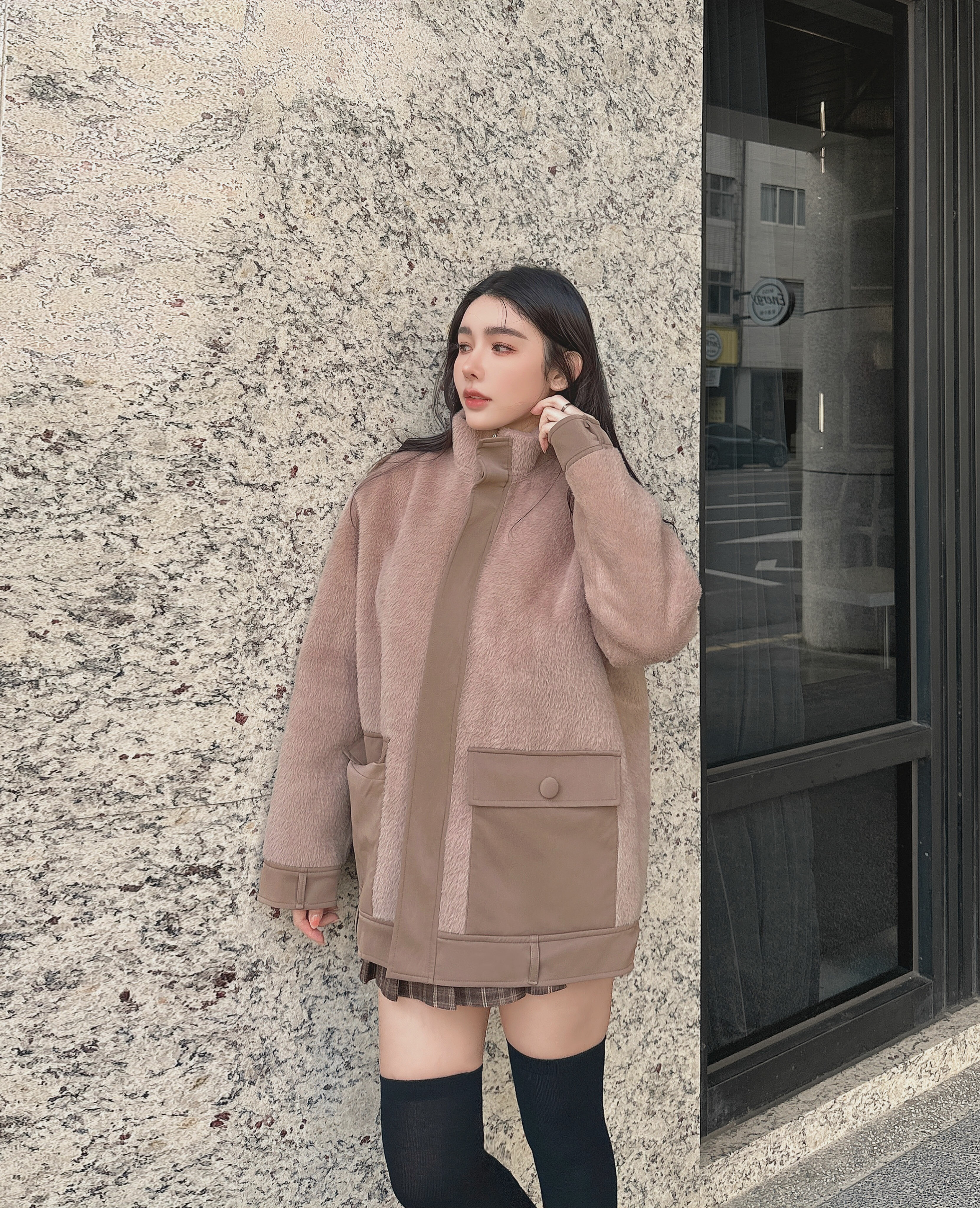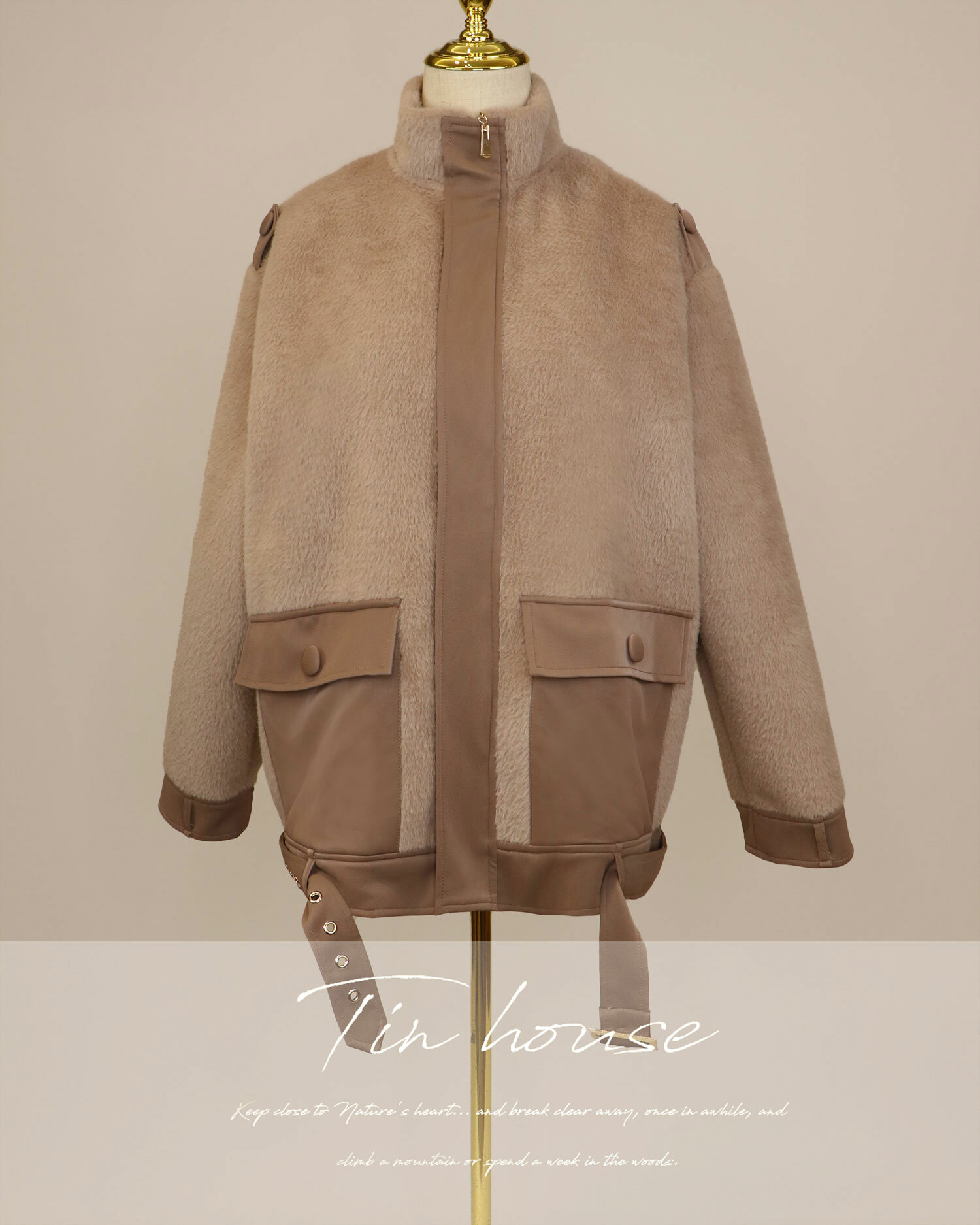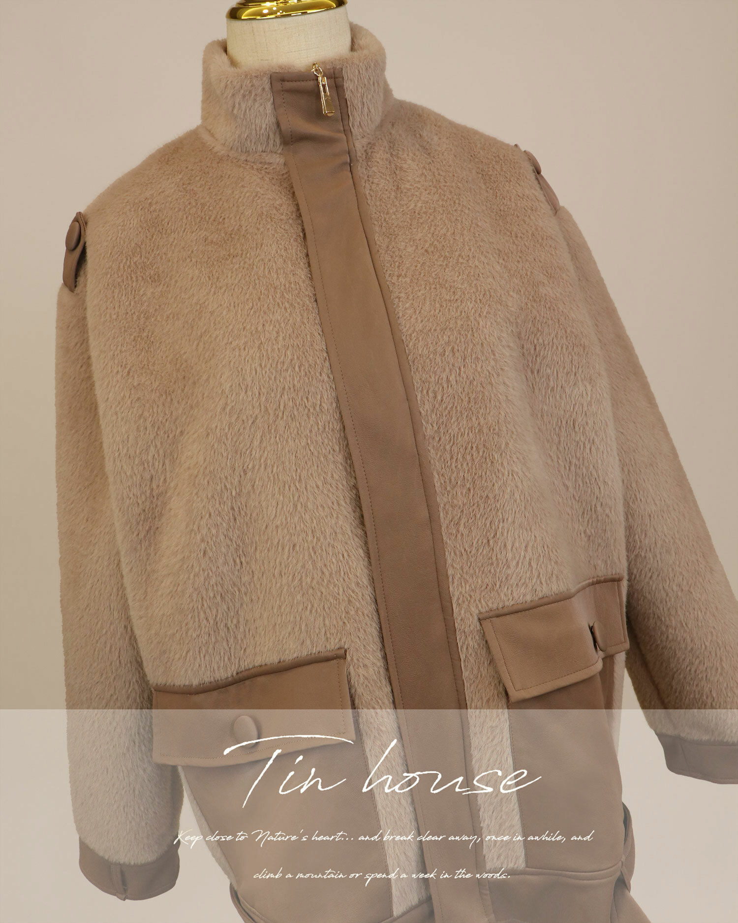 ⭒訂製-立領皮革拼接拉鍊毛毛外套