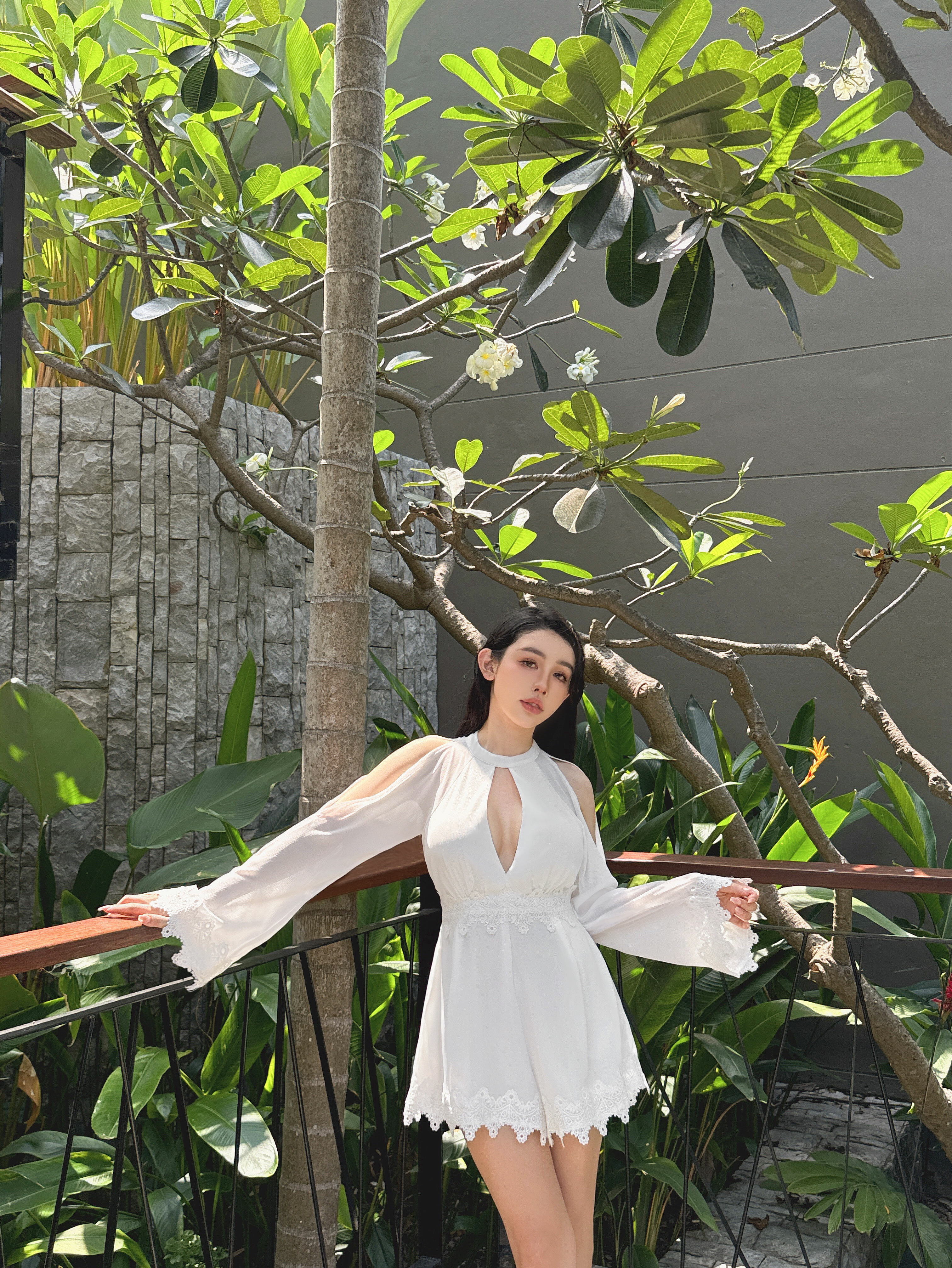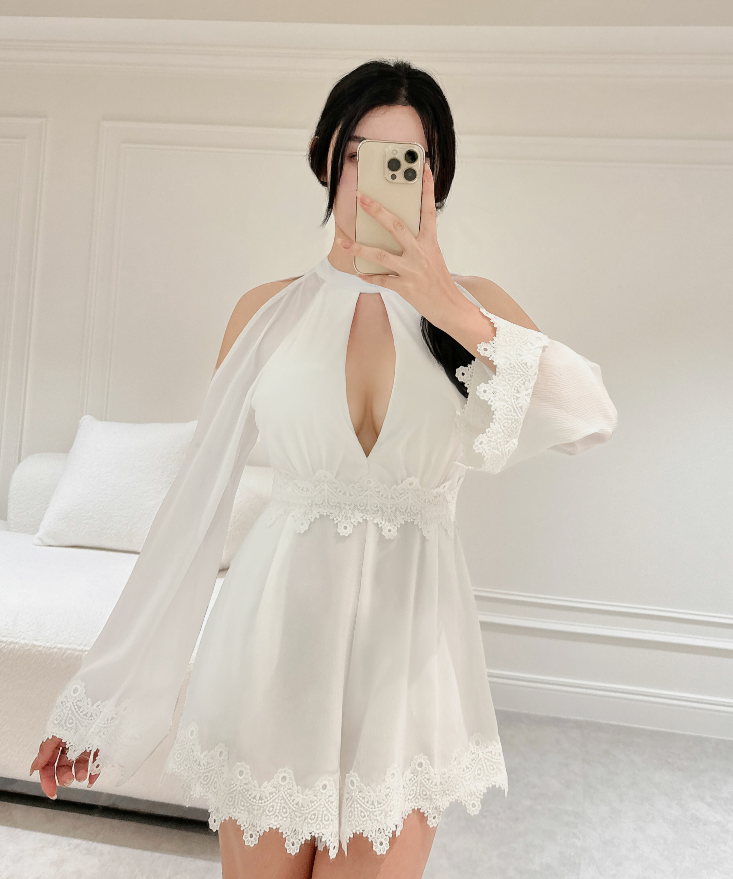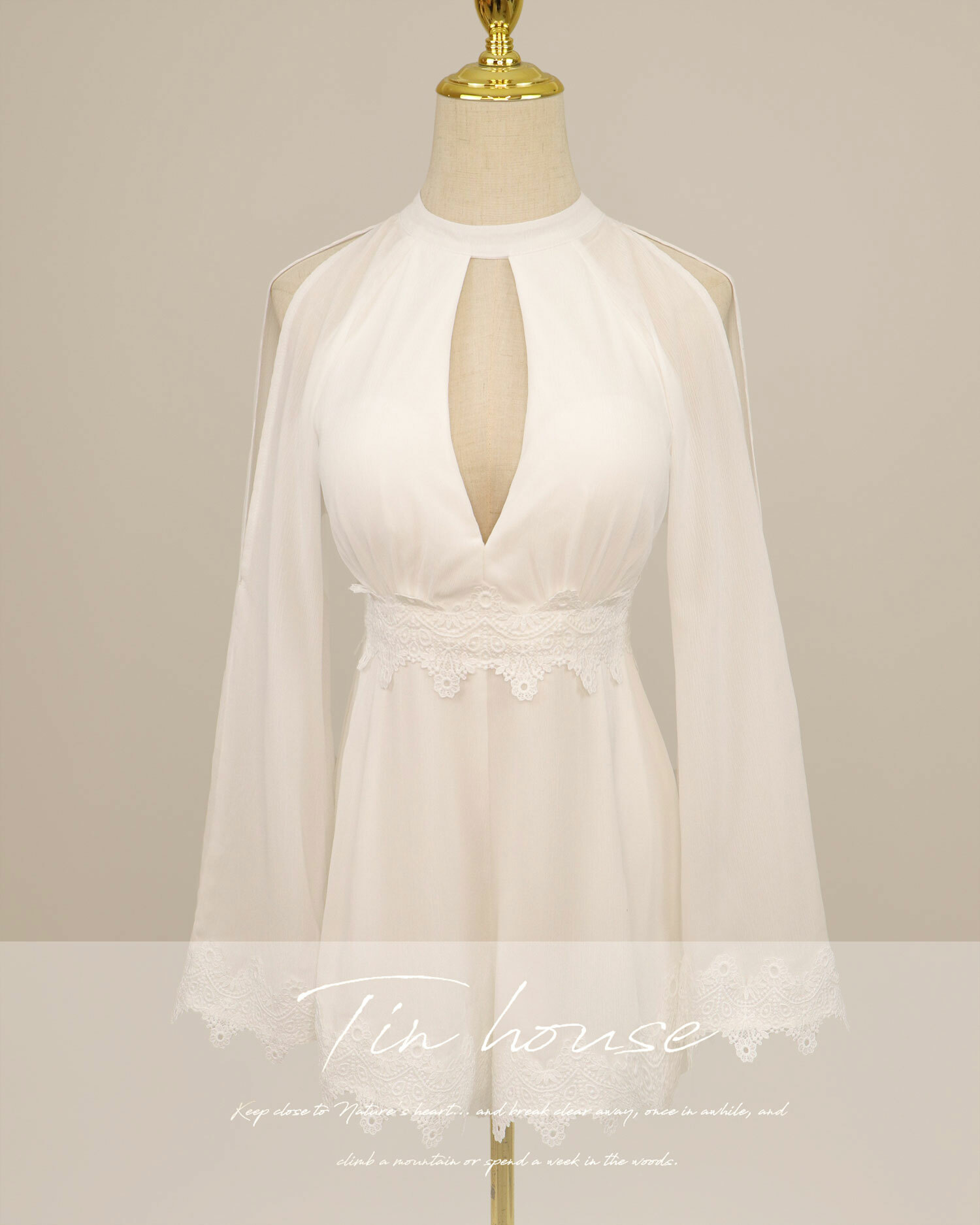 ⭒訂製-重工雕花露肩喇叭袖連身短褲
