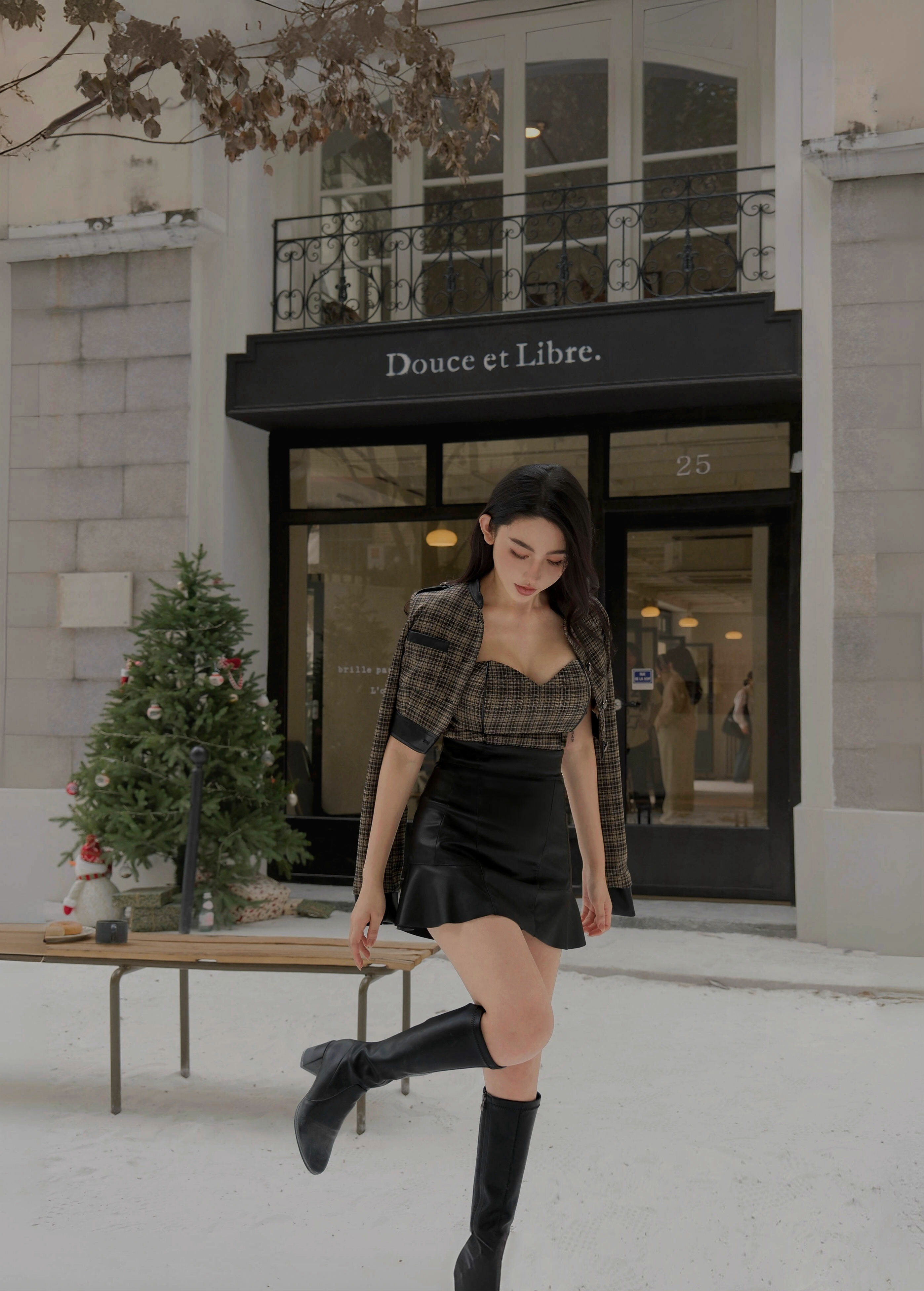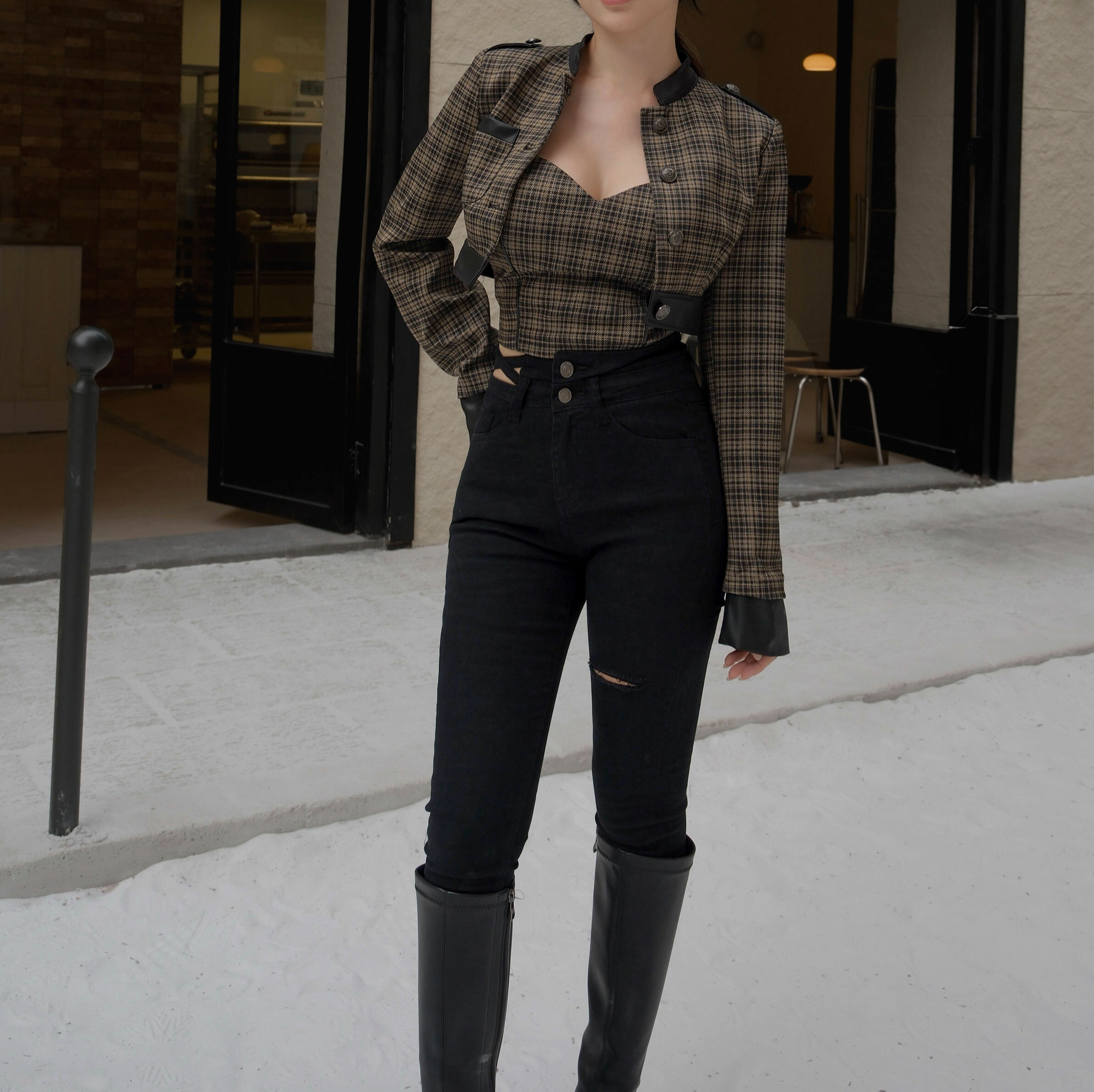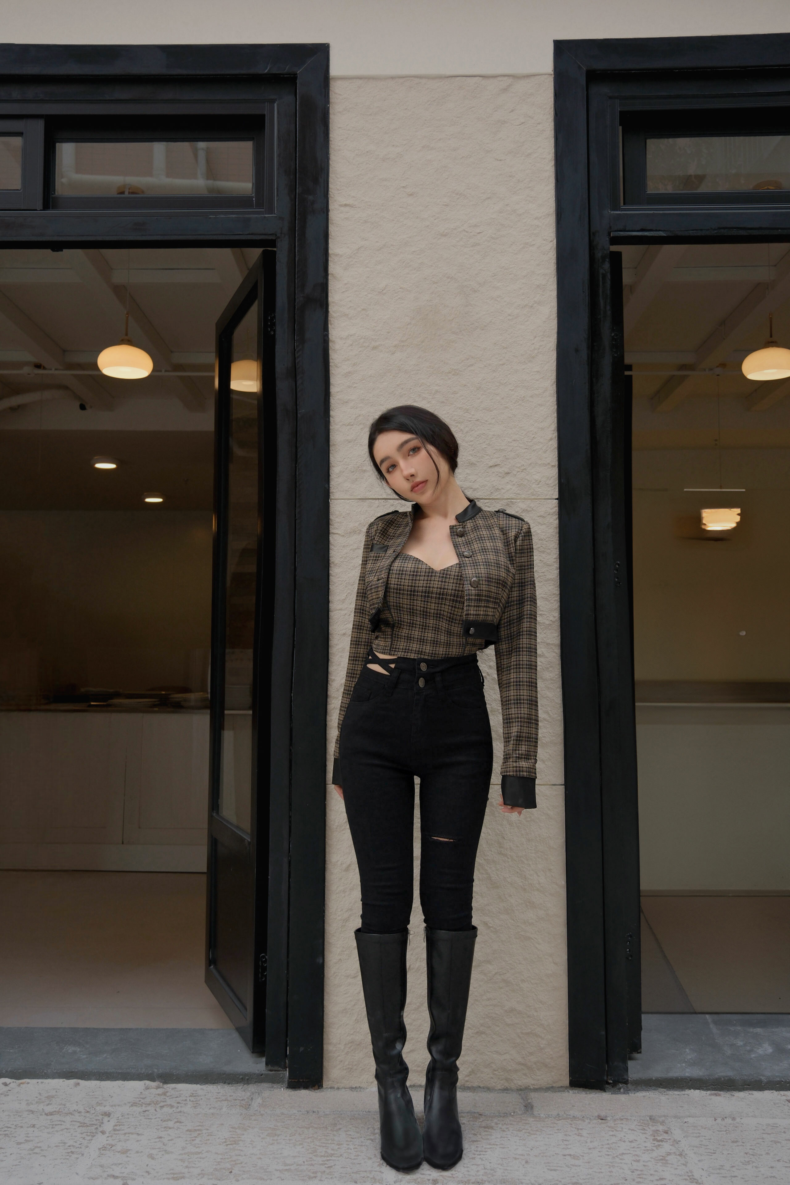 訂製-騎士格紋接皮立領馬甲套裝