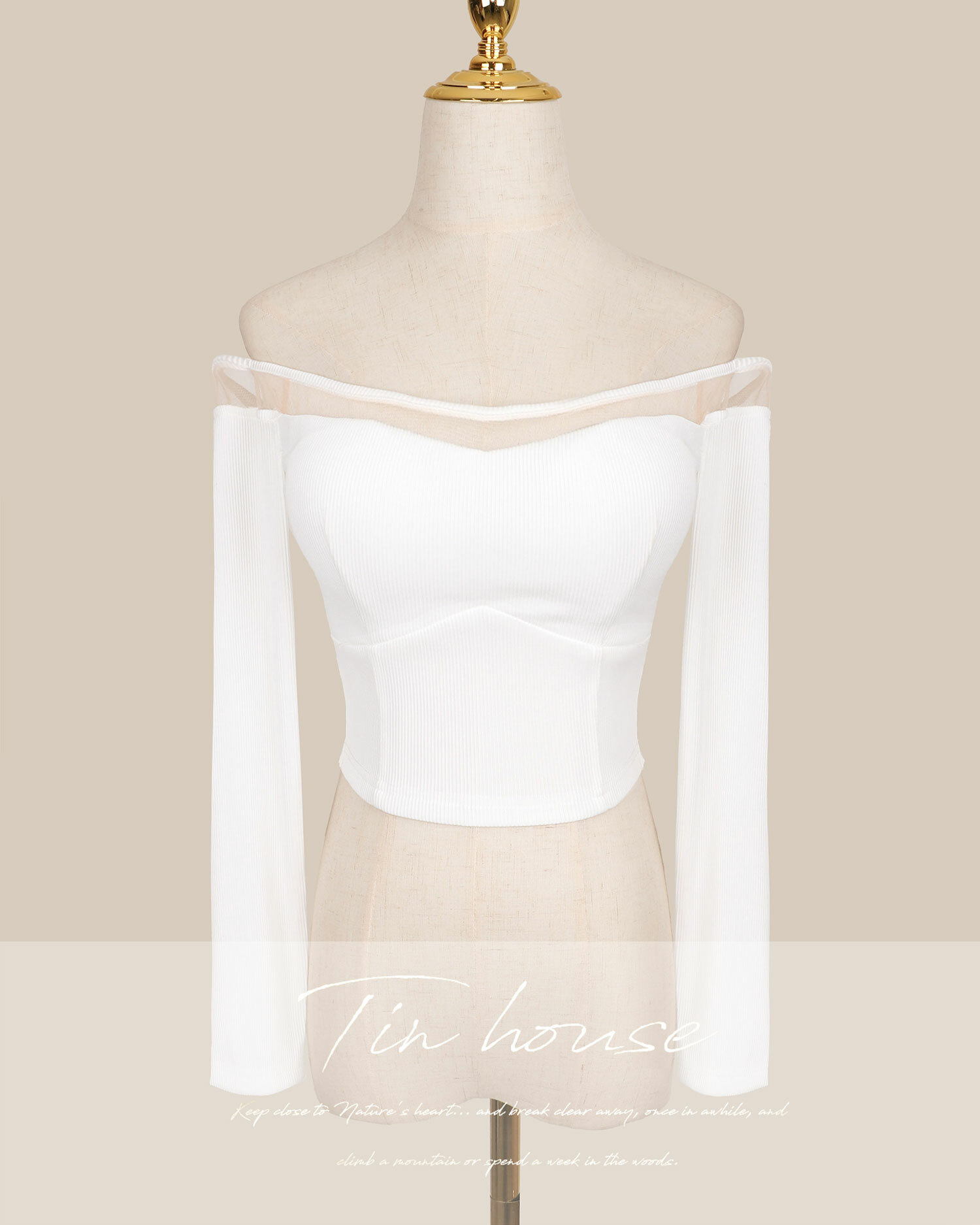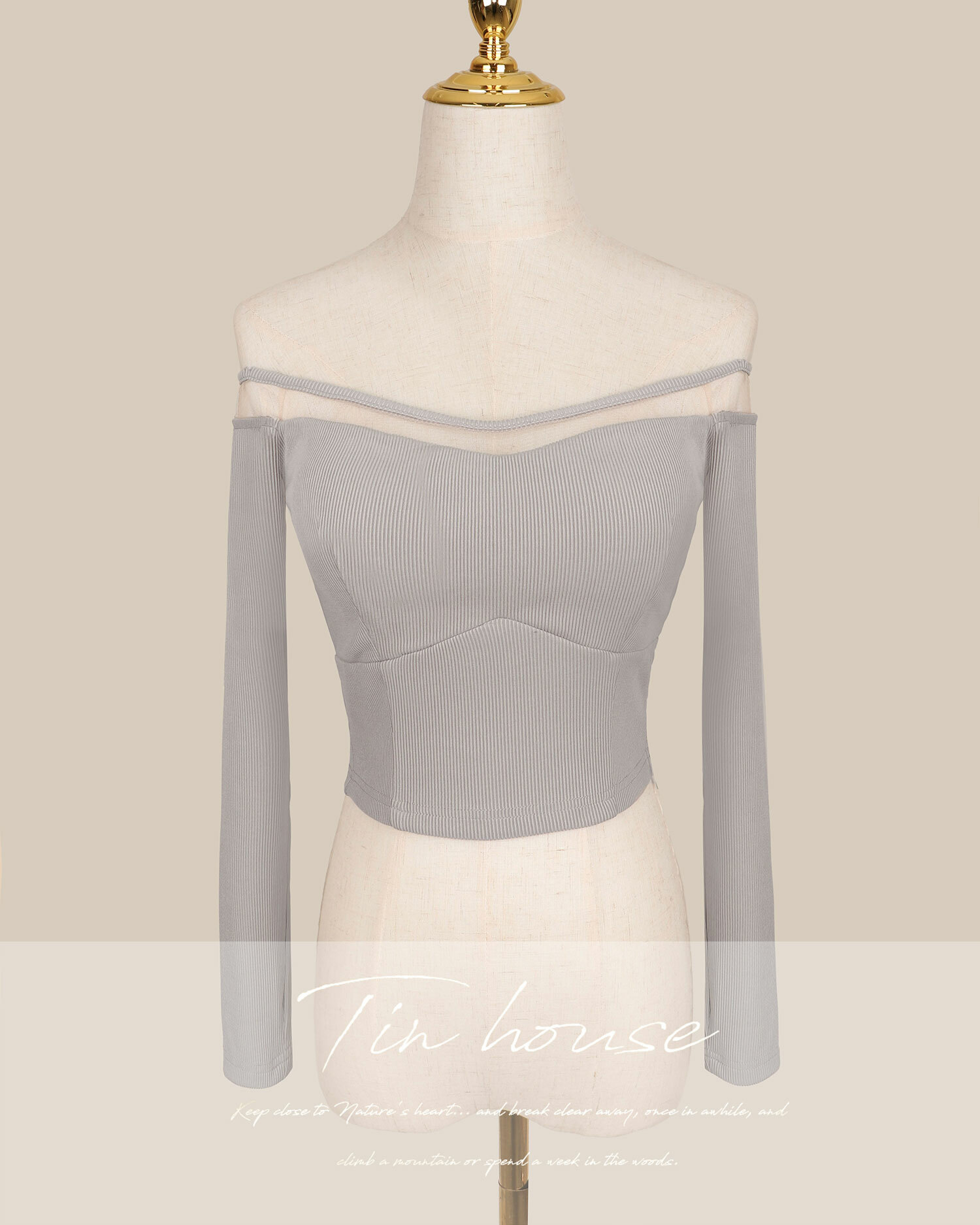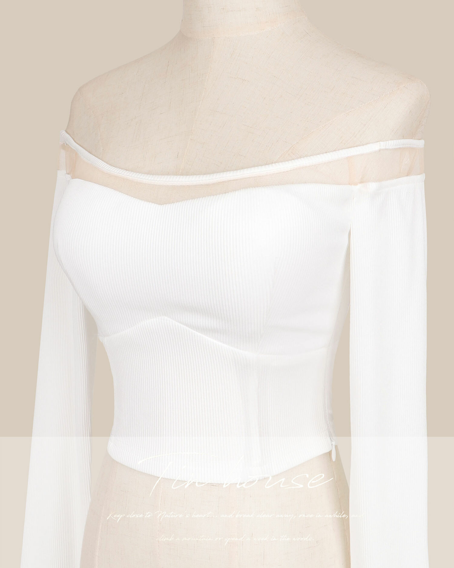 訂製-一字領拼接網紗坑條上衣