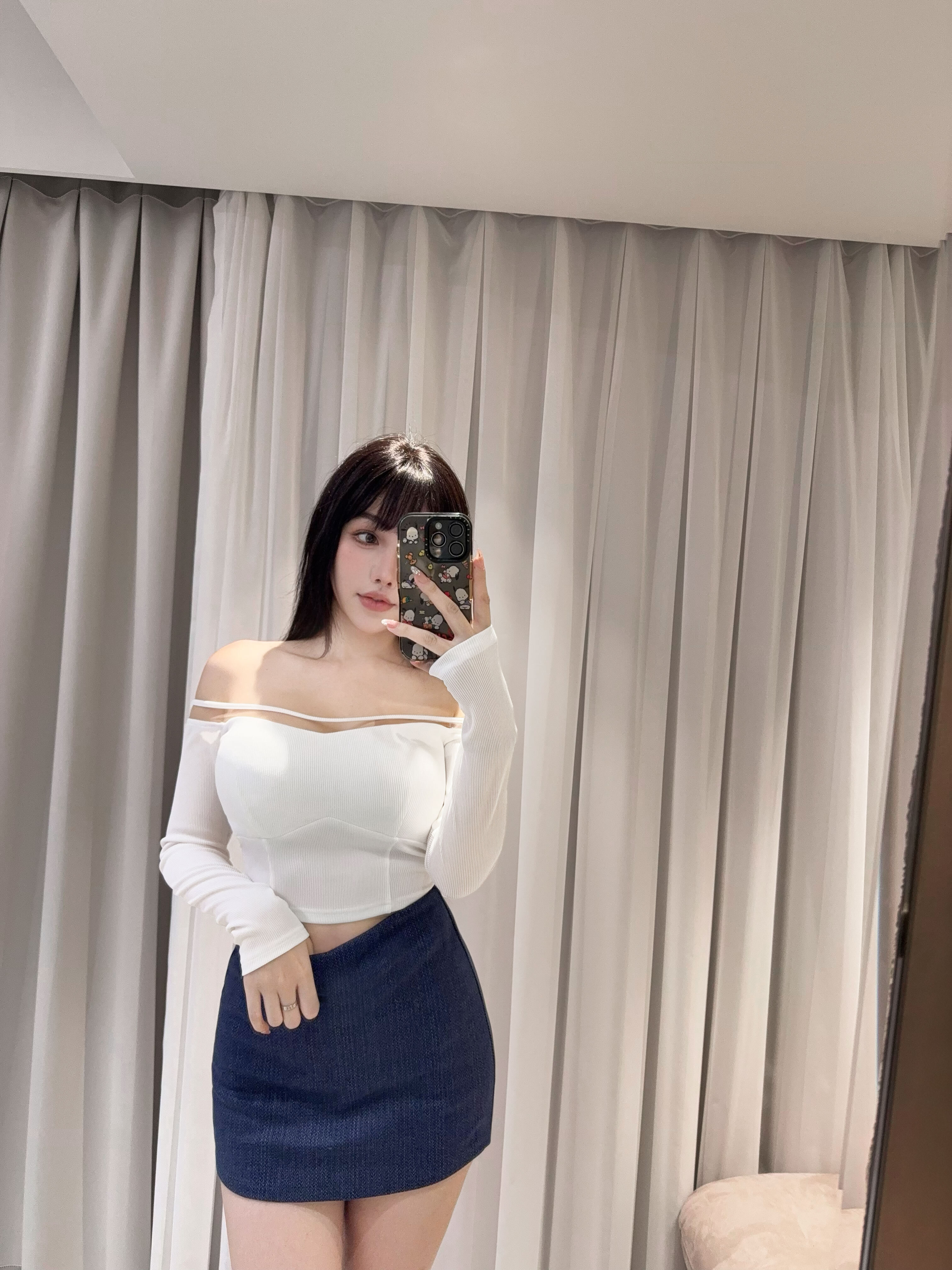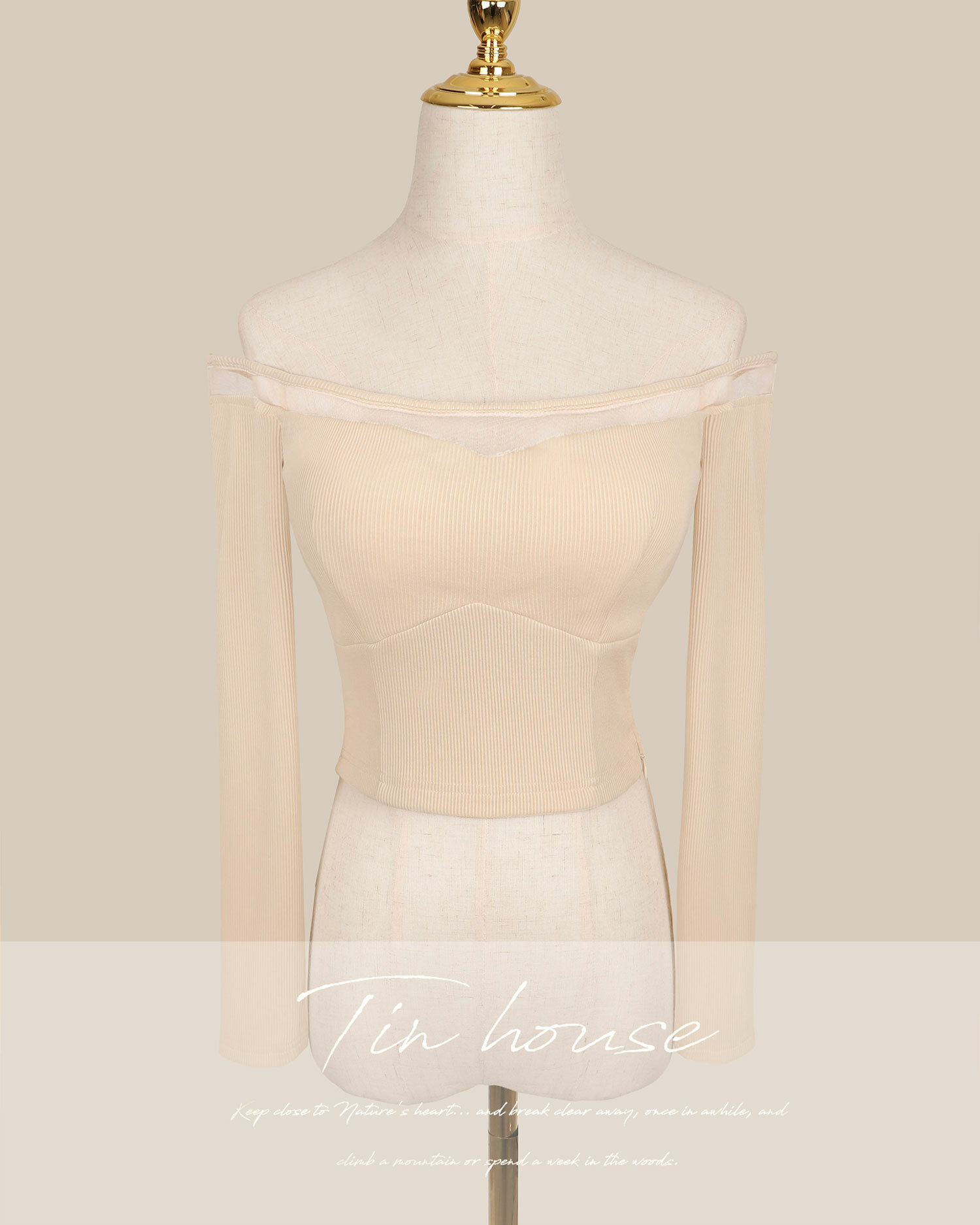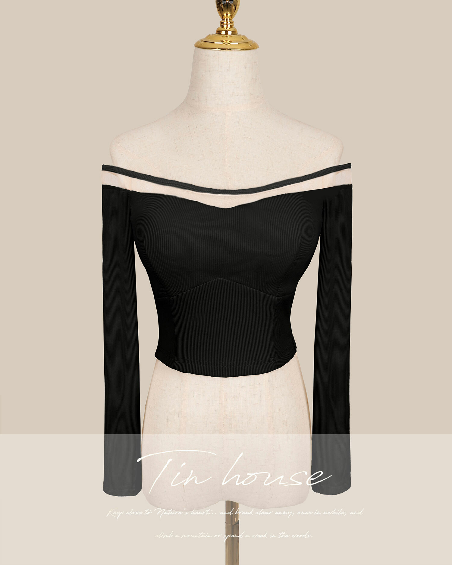 訂製-一字領拼接網紗坑條上衣