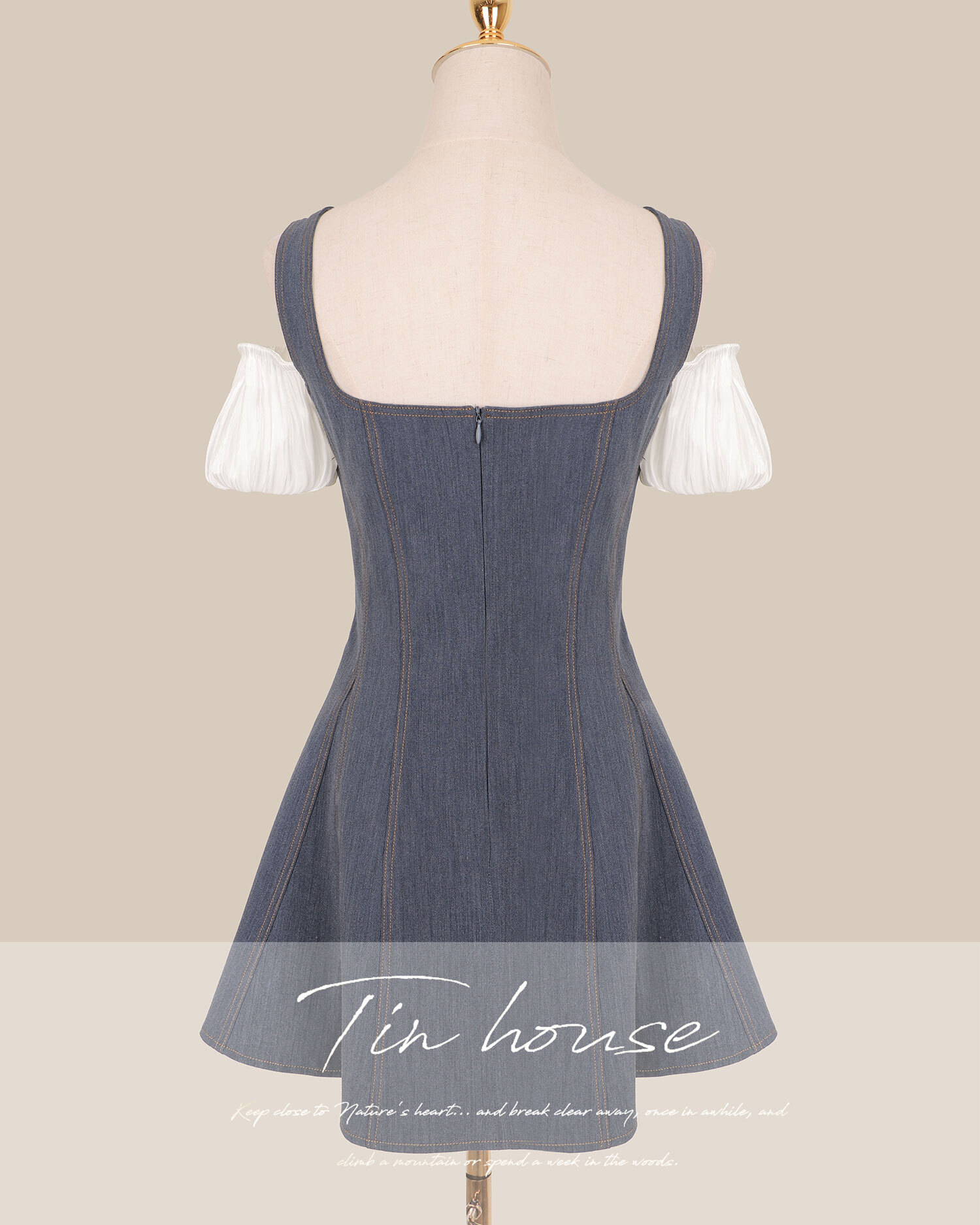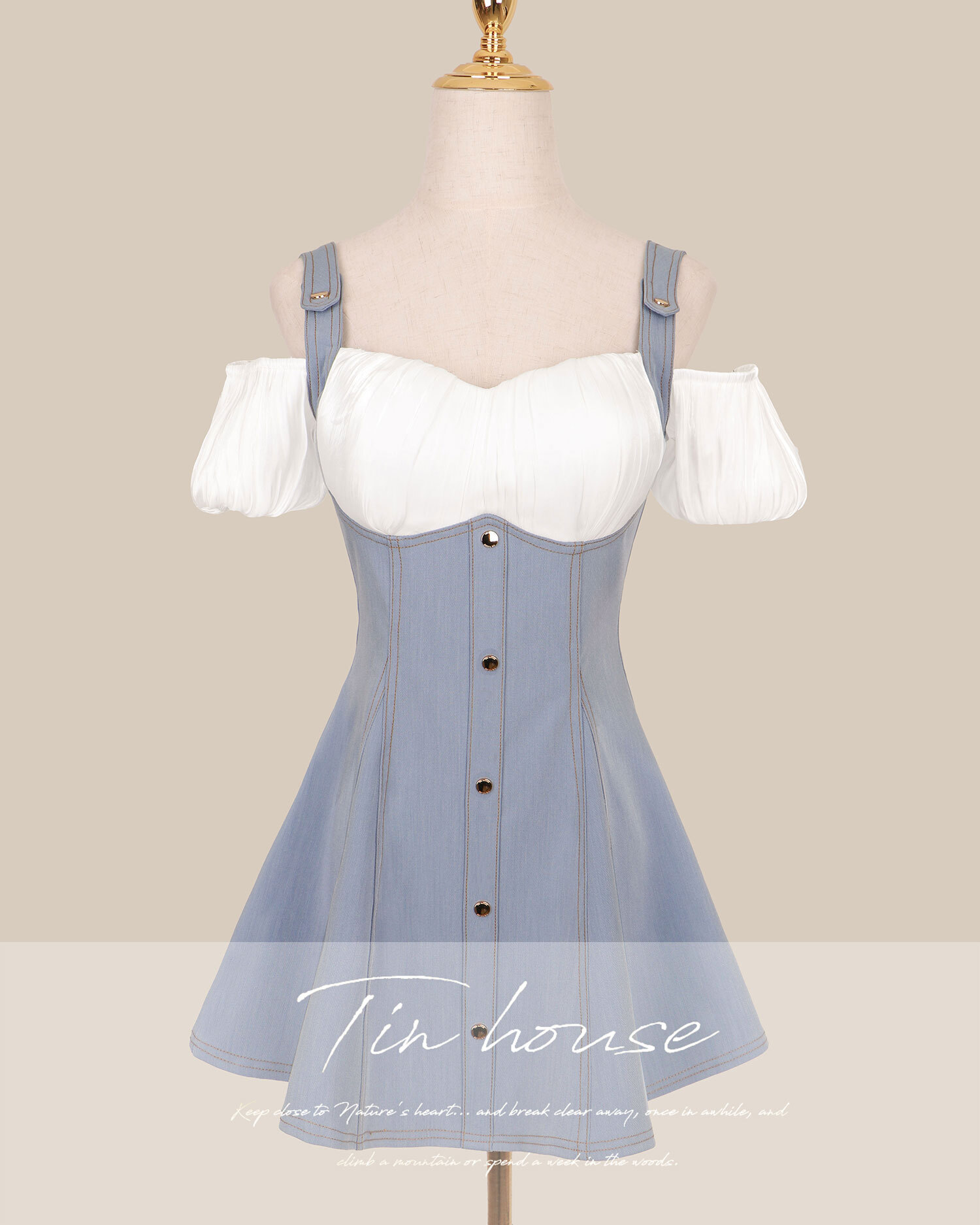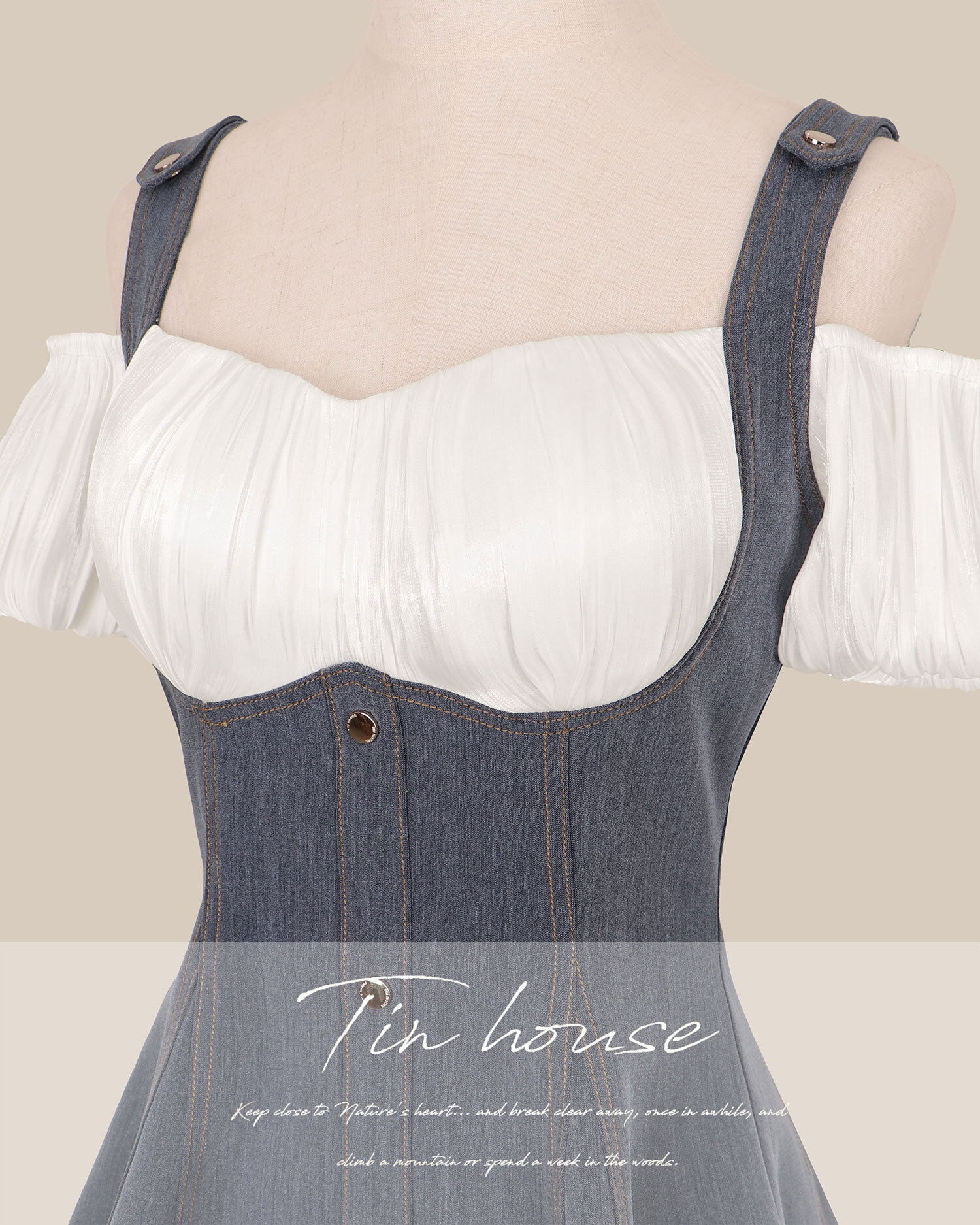 訂製-絲光一字領假兩件牛仔傘洋