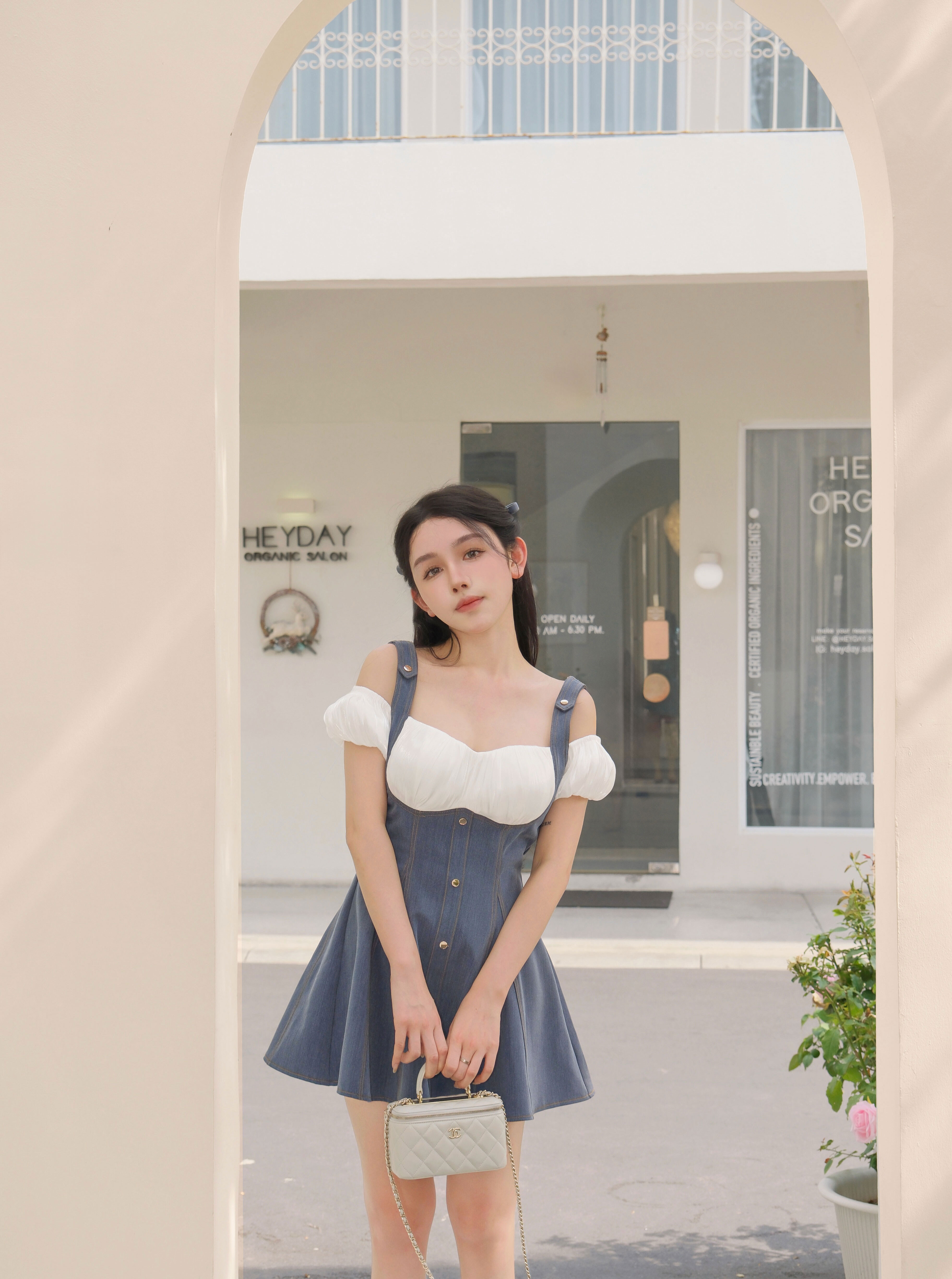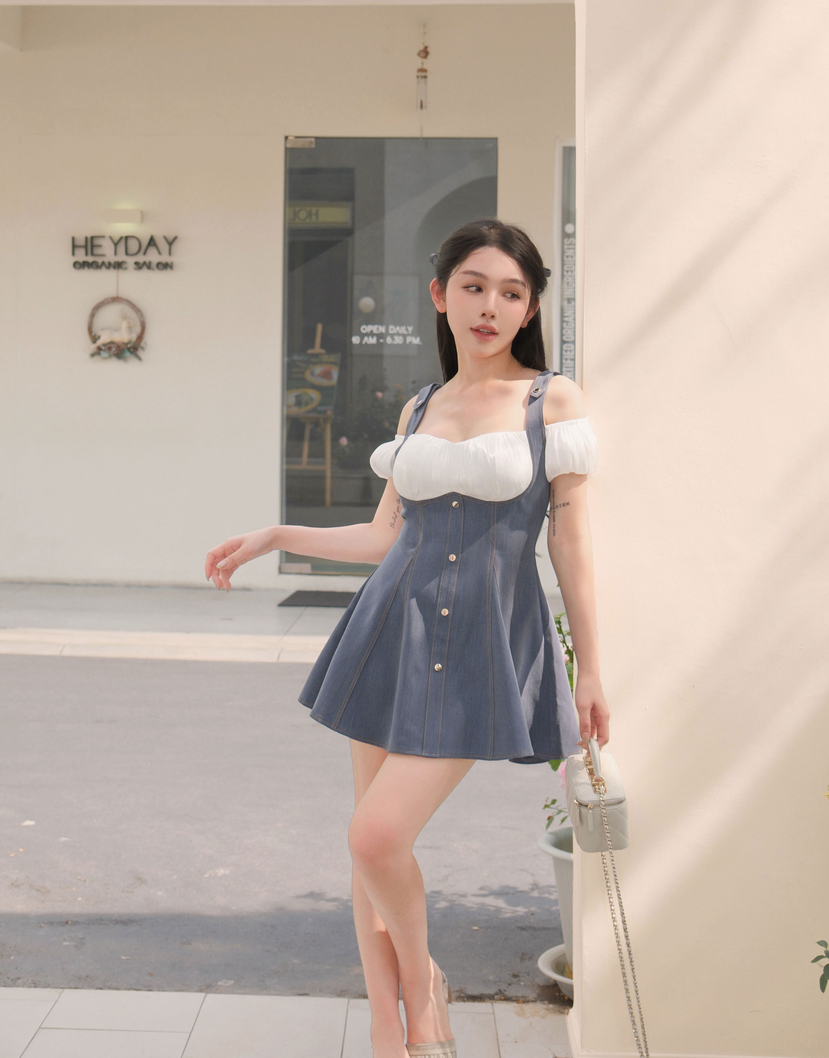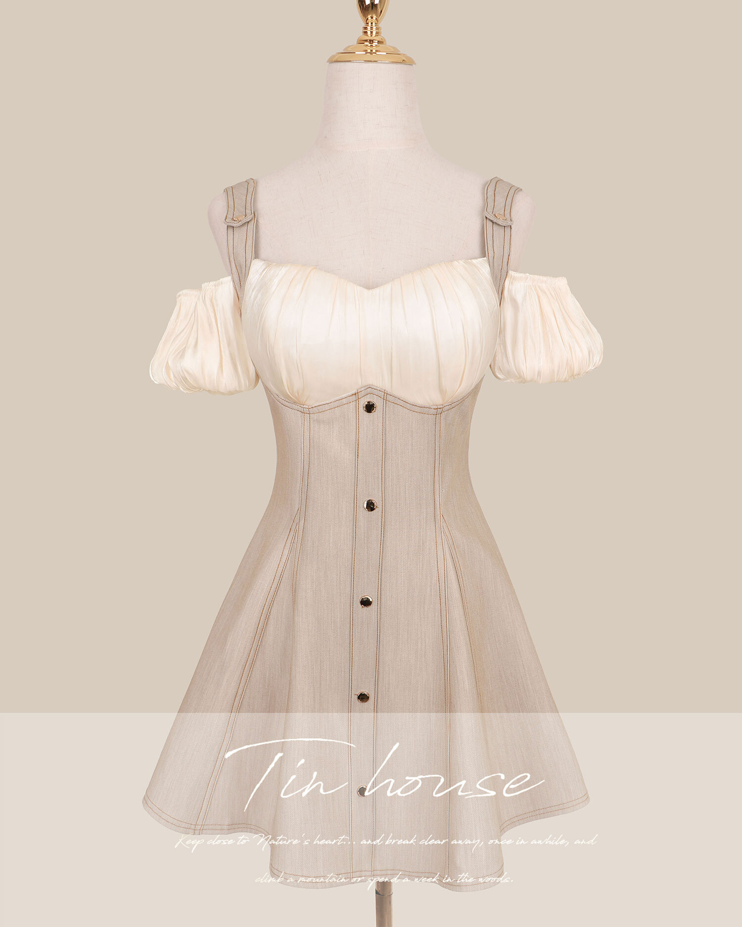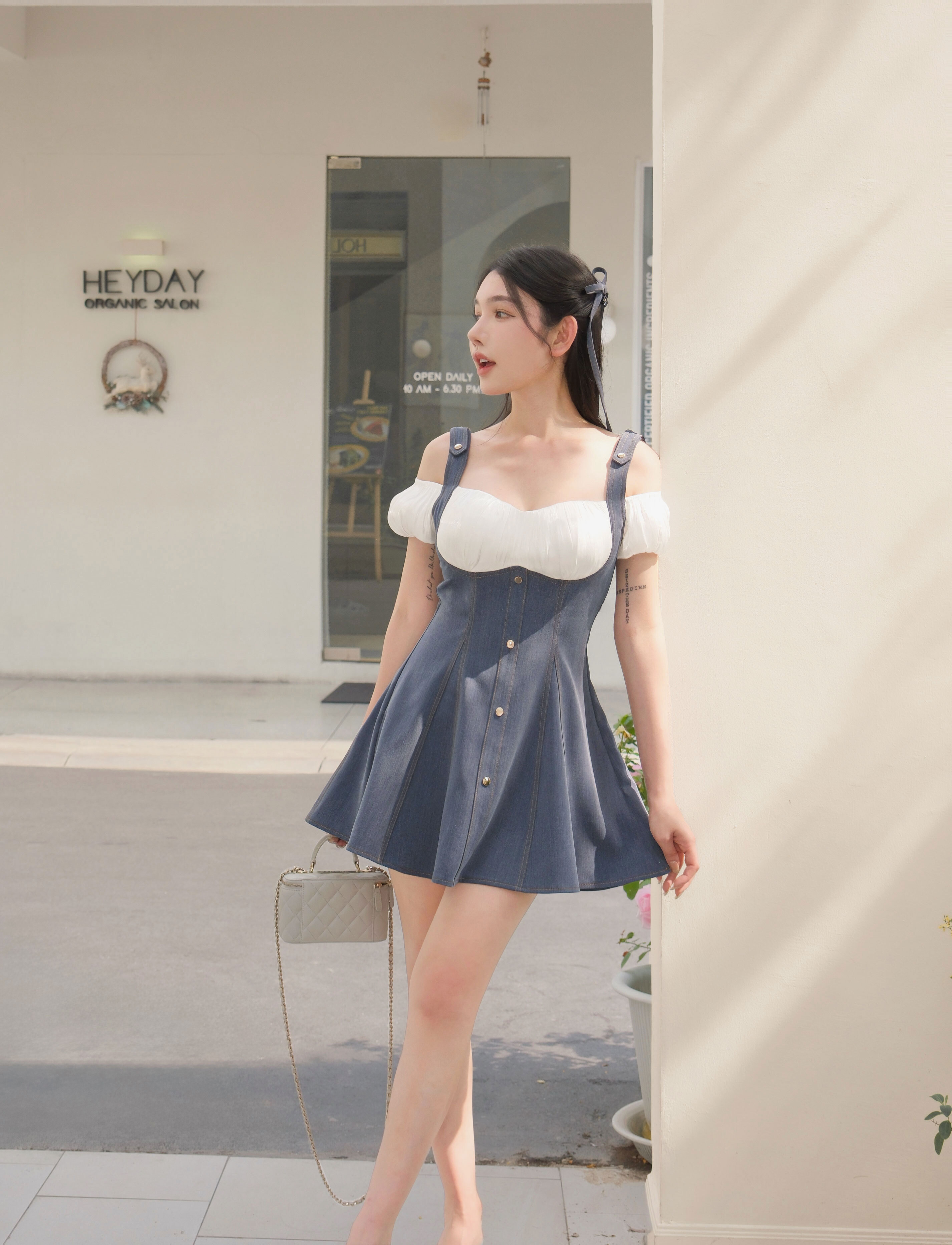 訂製-絲光一字領假兩件牛仔傘洋