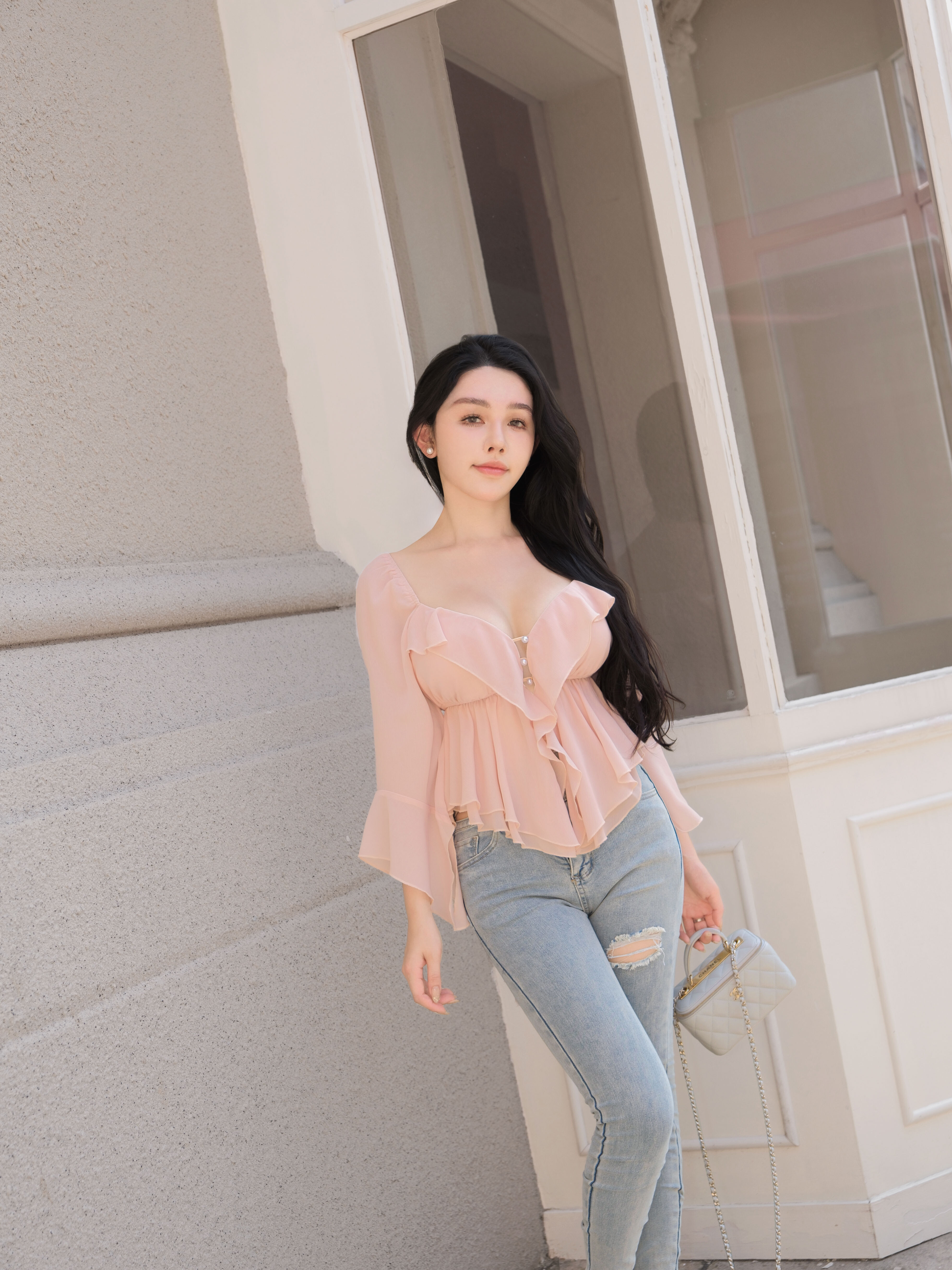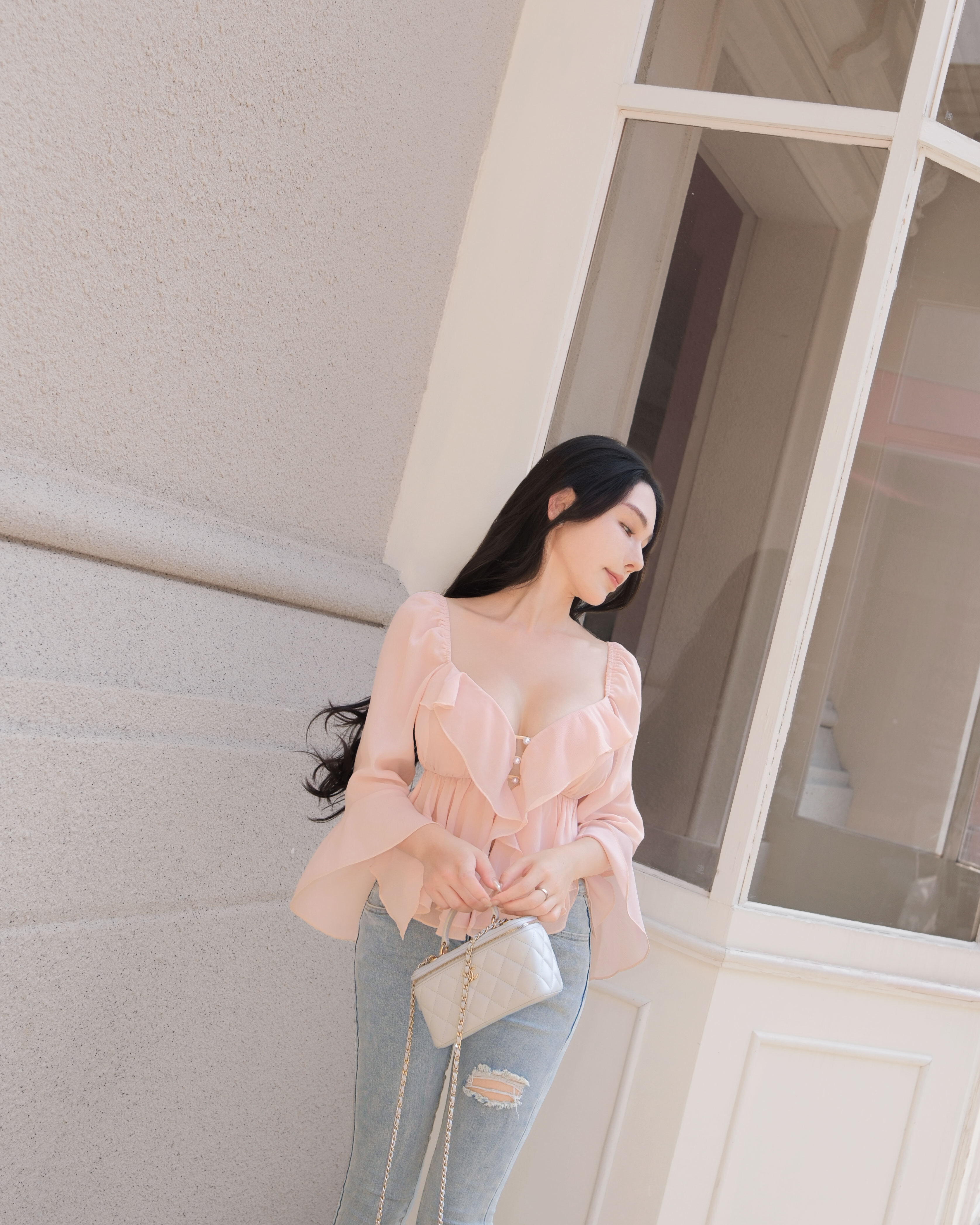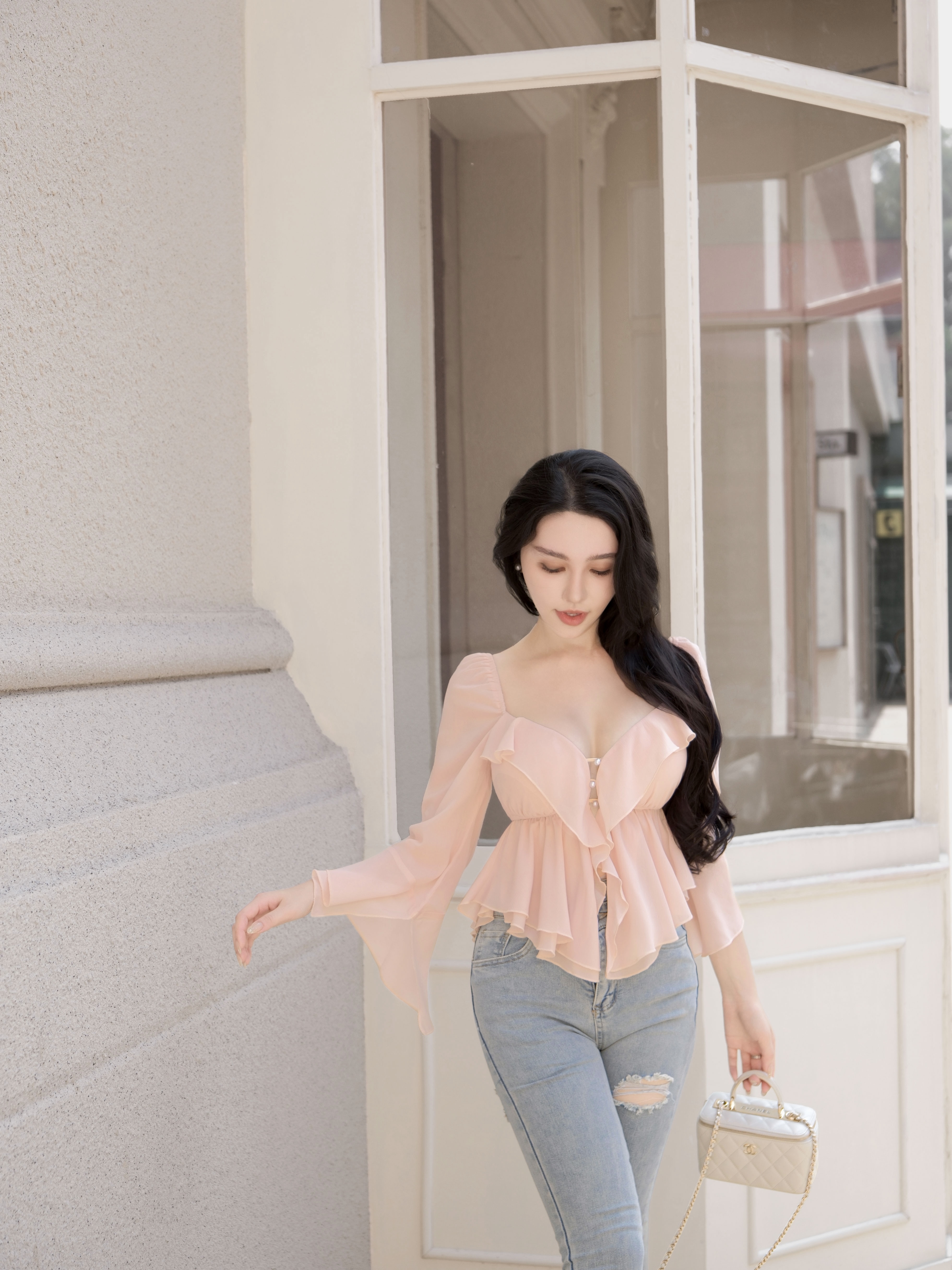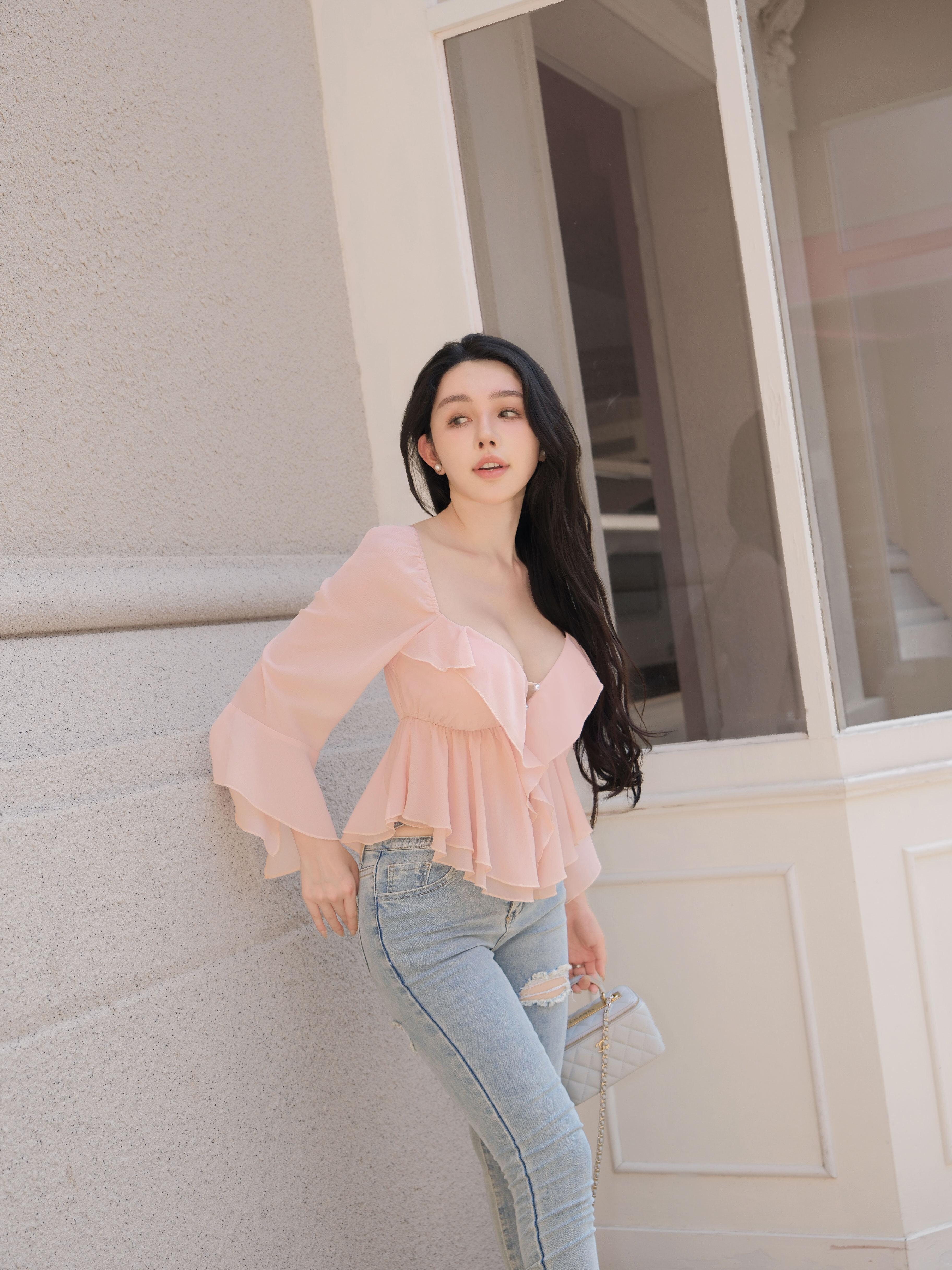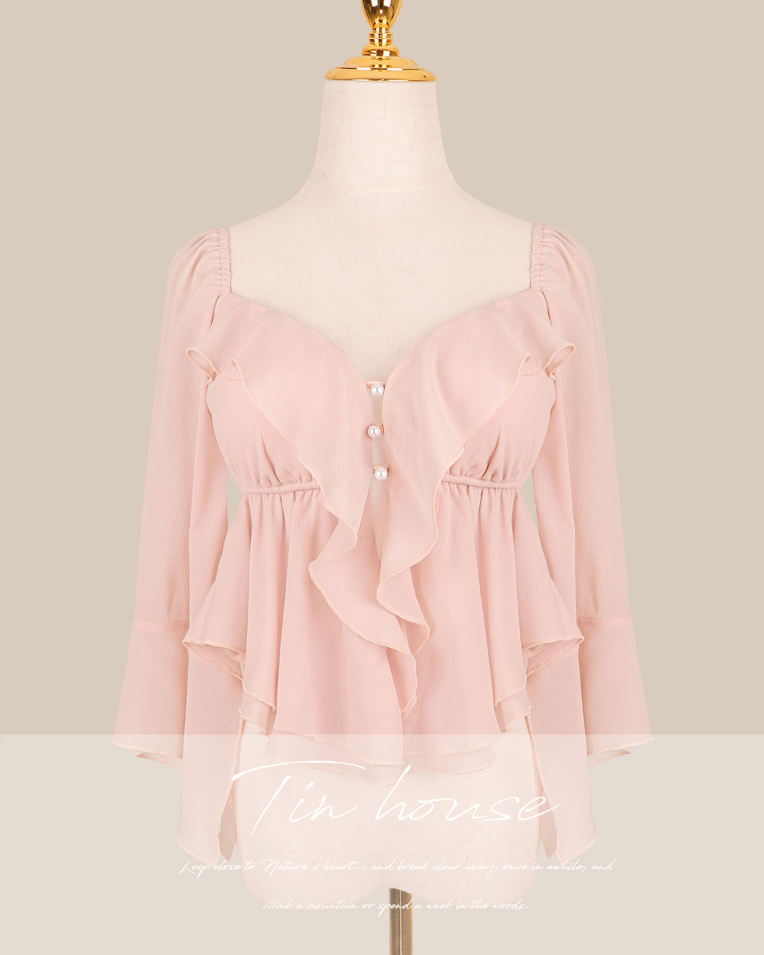 七夕限定-氣質荷葉水袖珍珠釦上衣