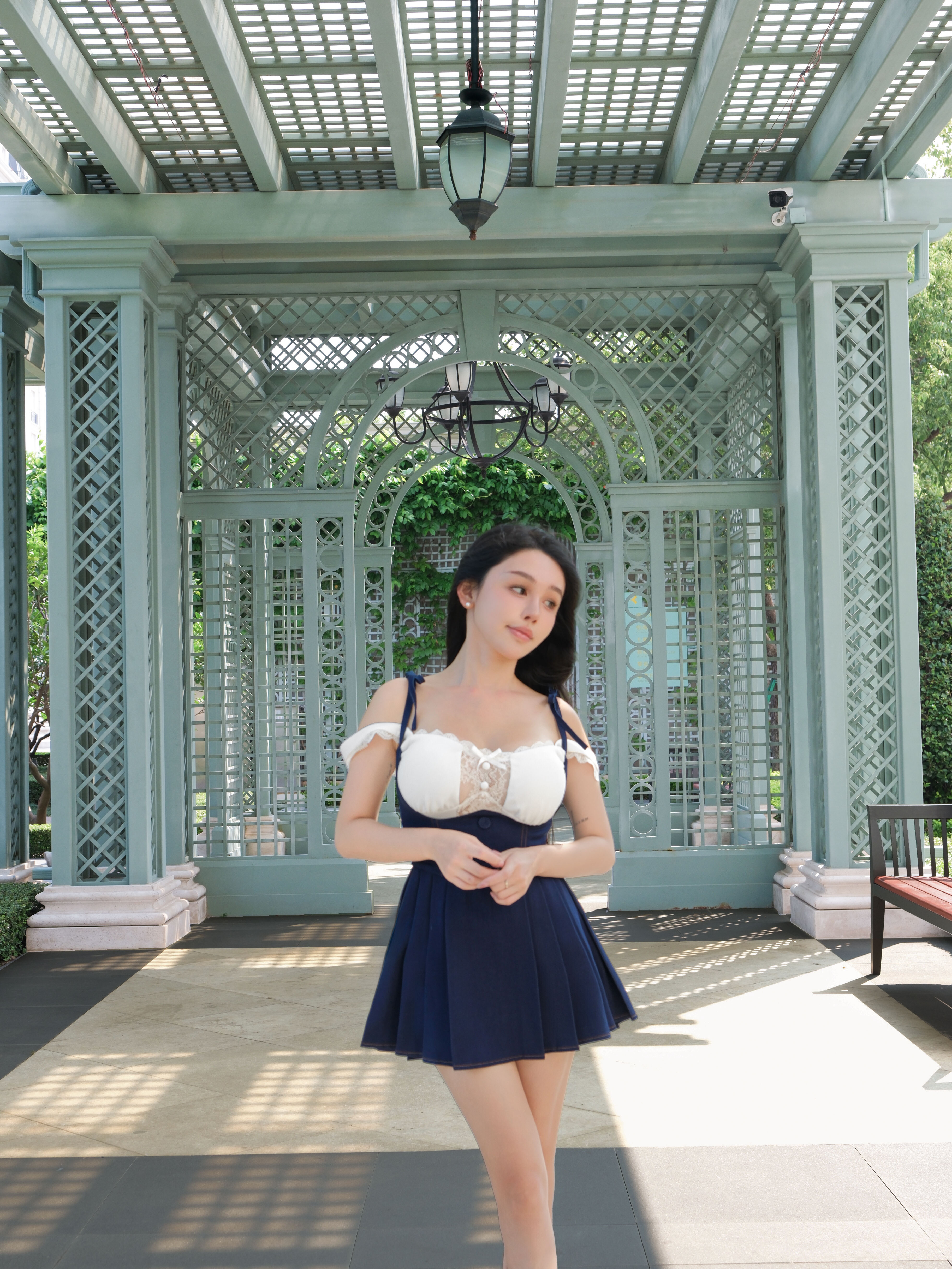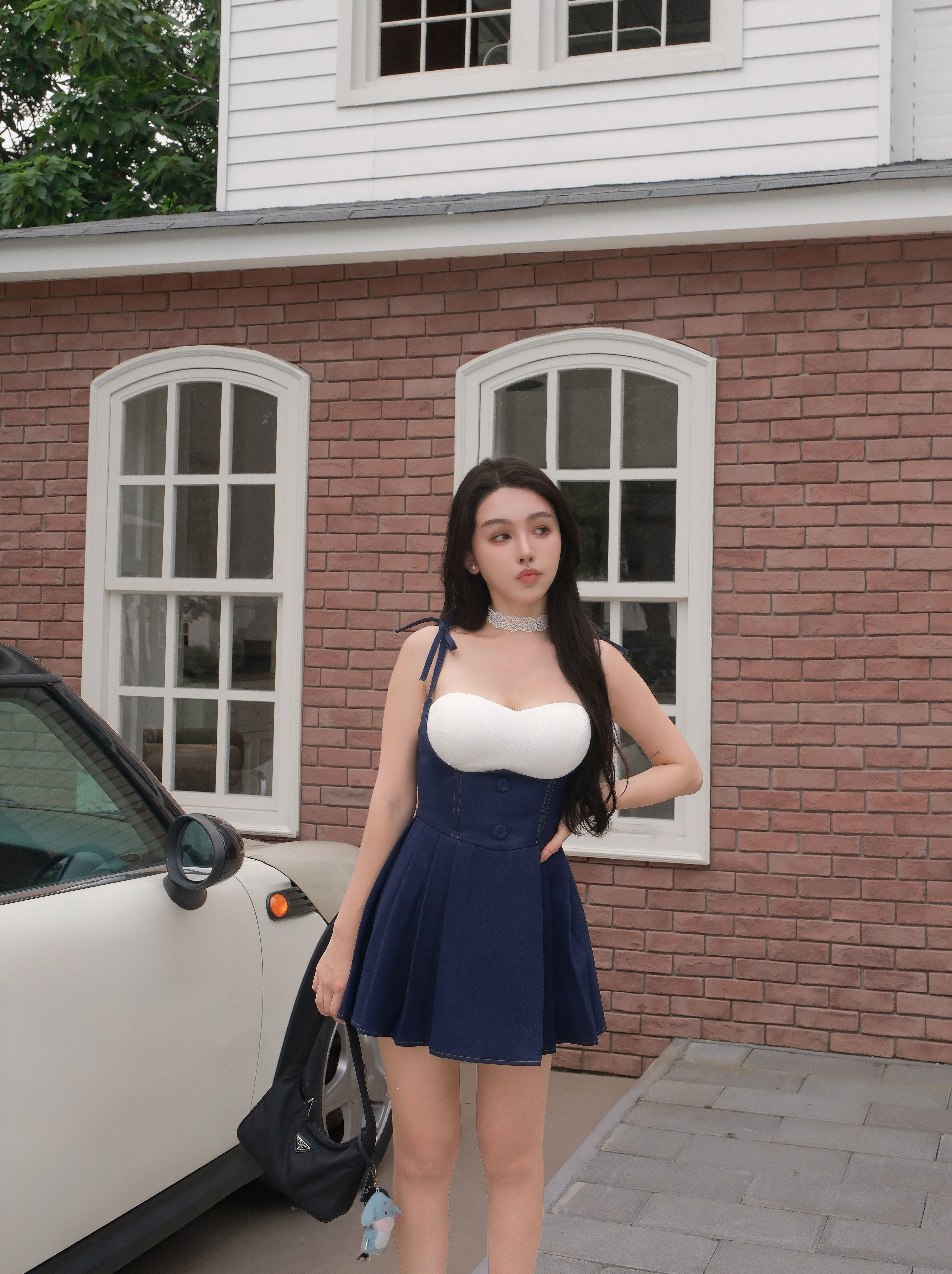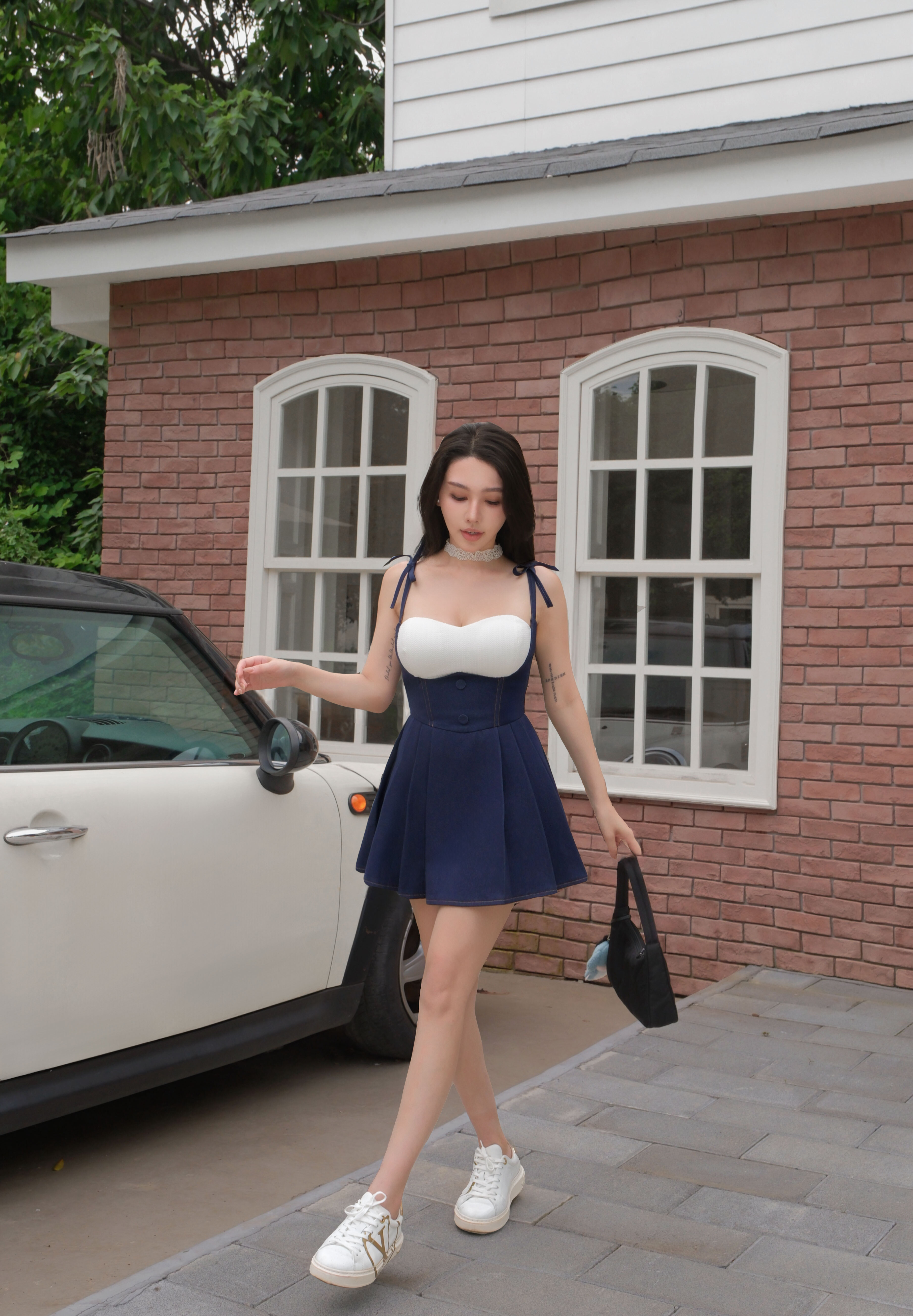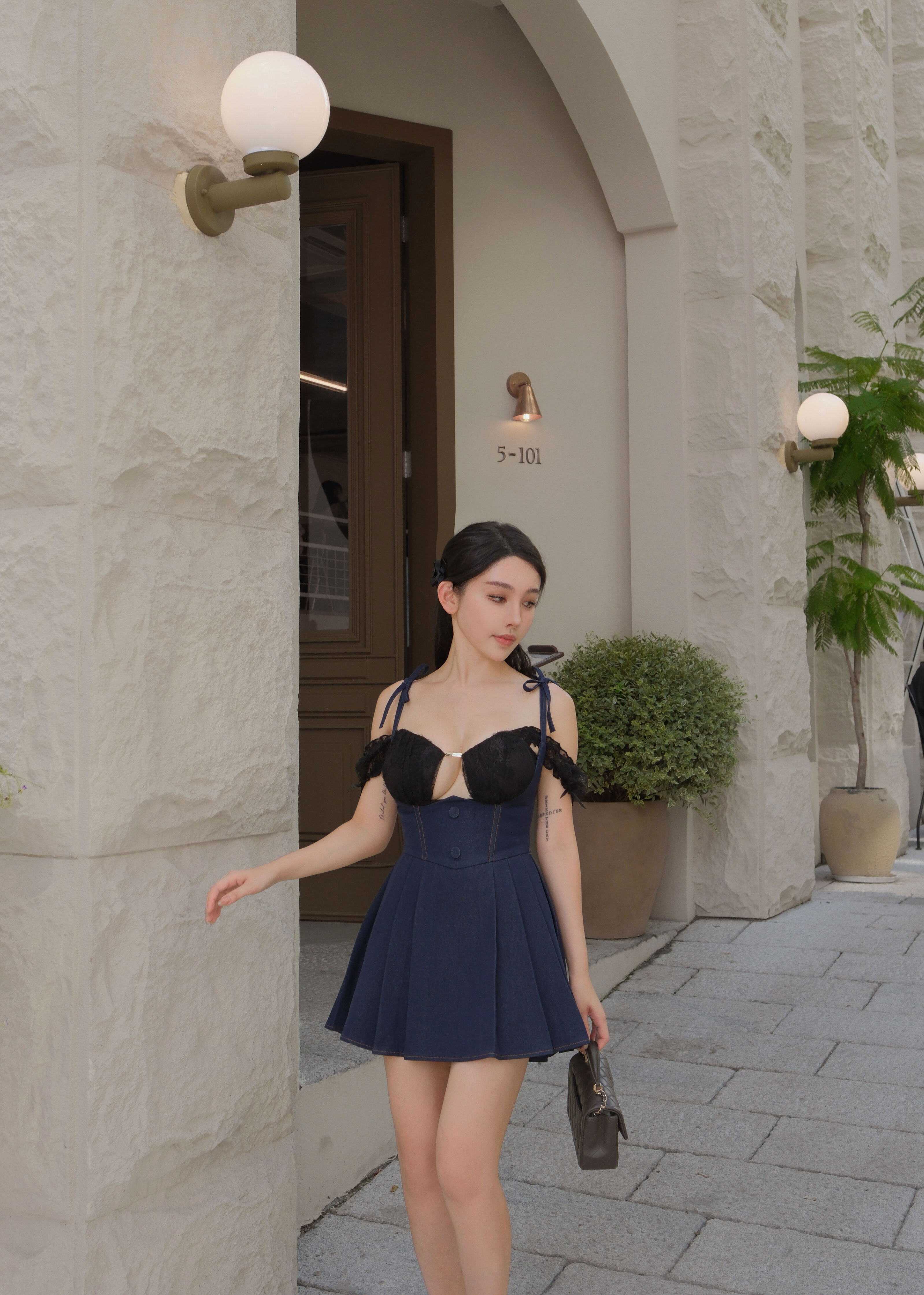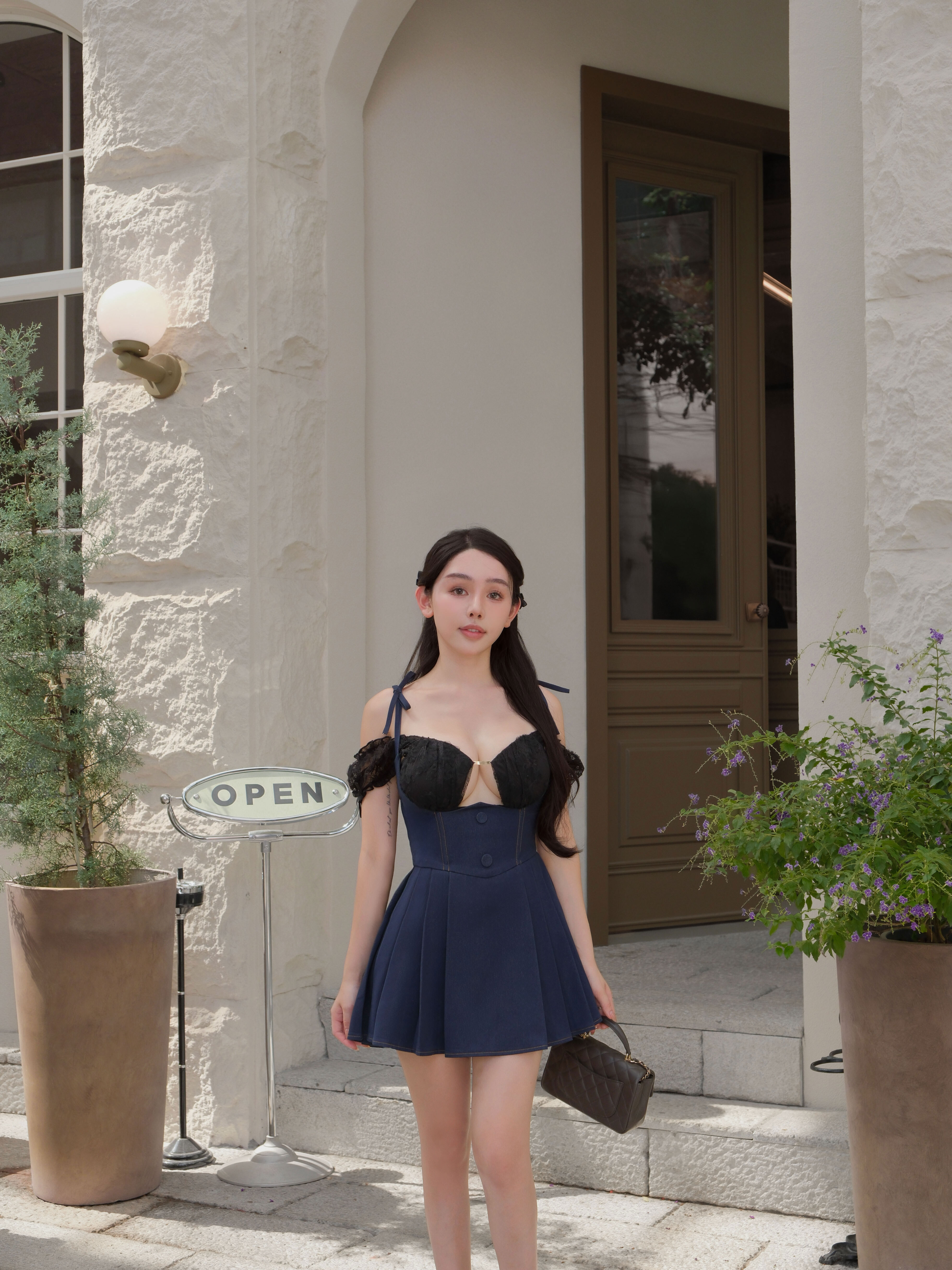 訂製-車線牛仔高腰百褶吊帶褲裙