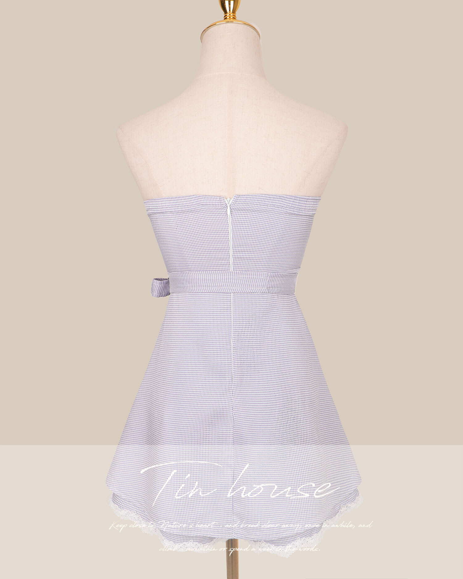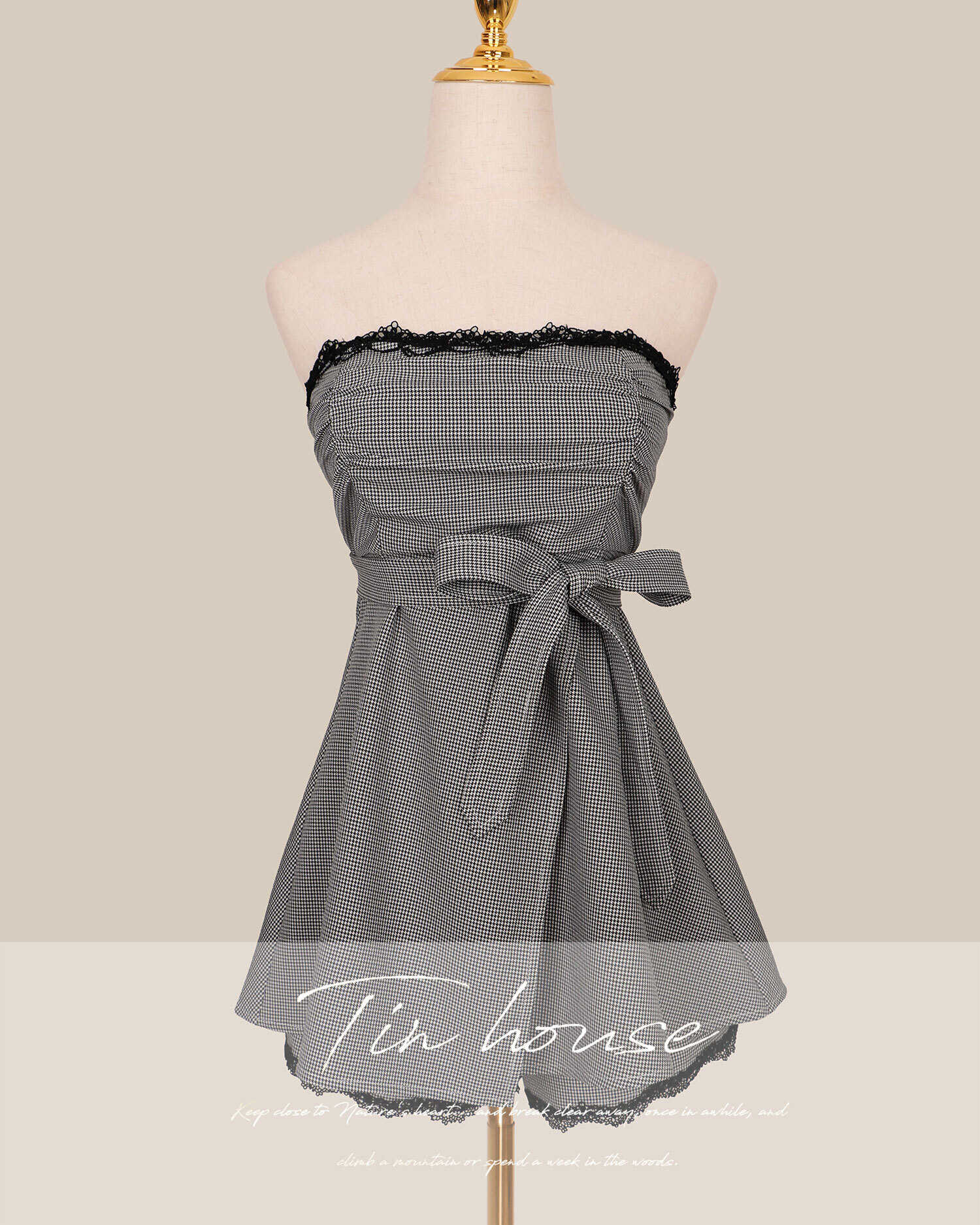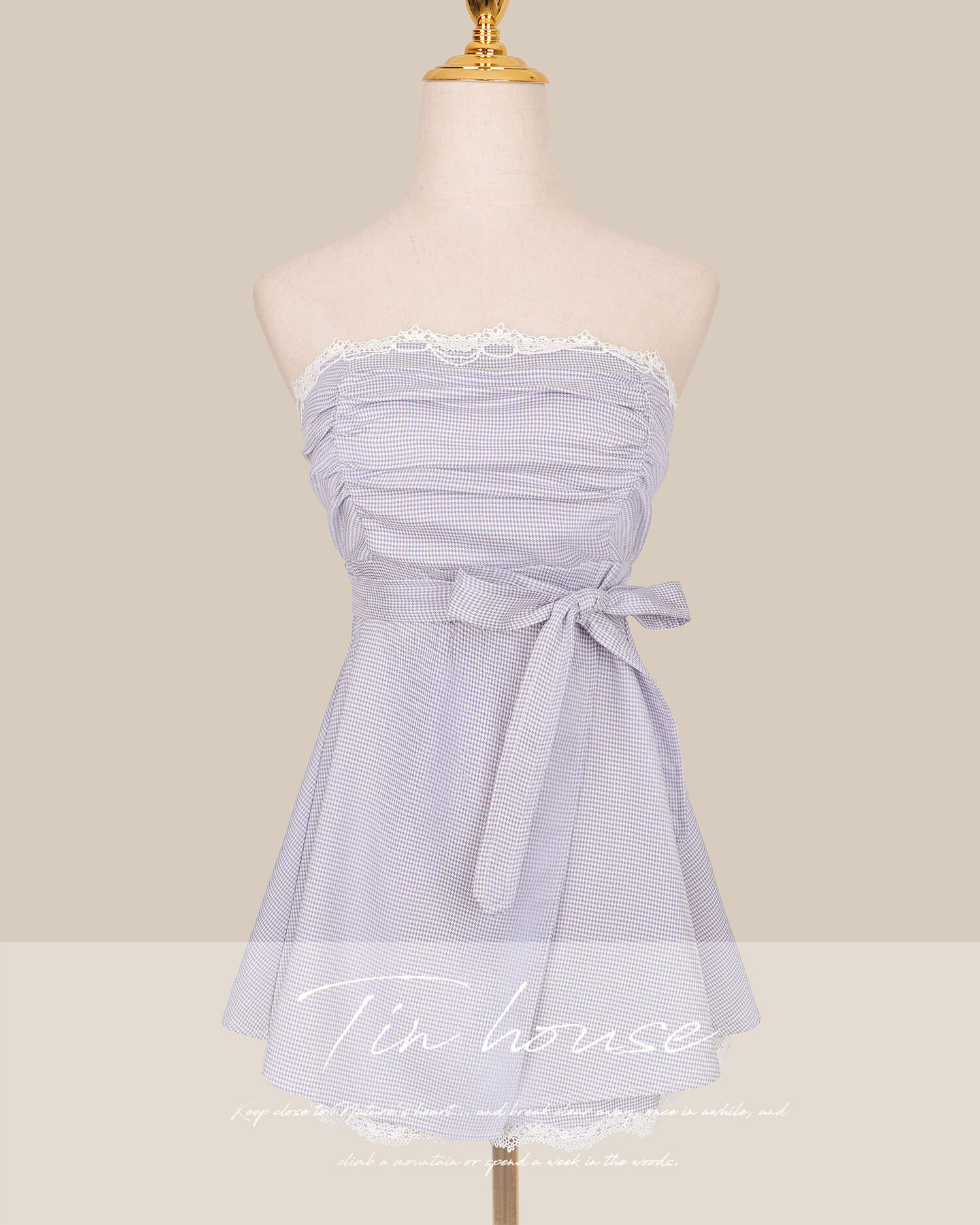 訂製-甜美千鳥格抓皺平口套裝