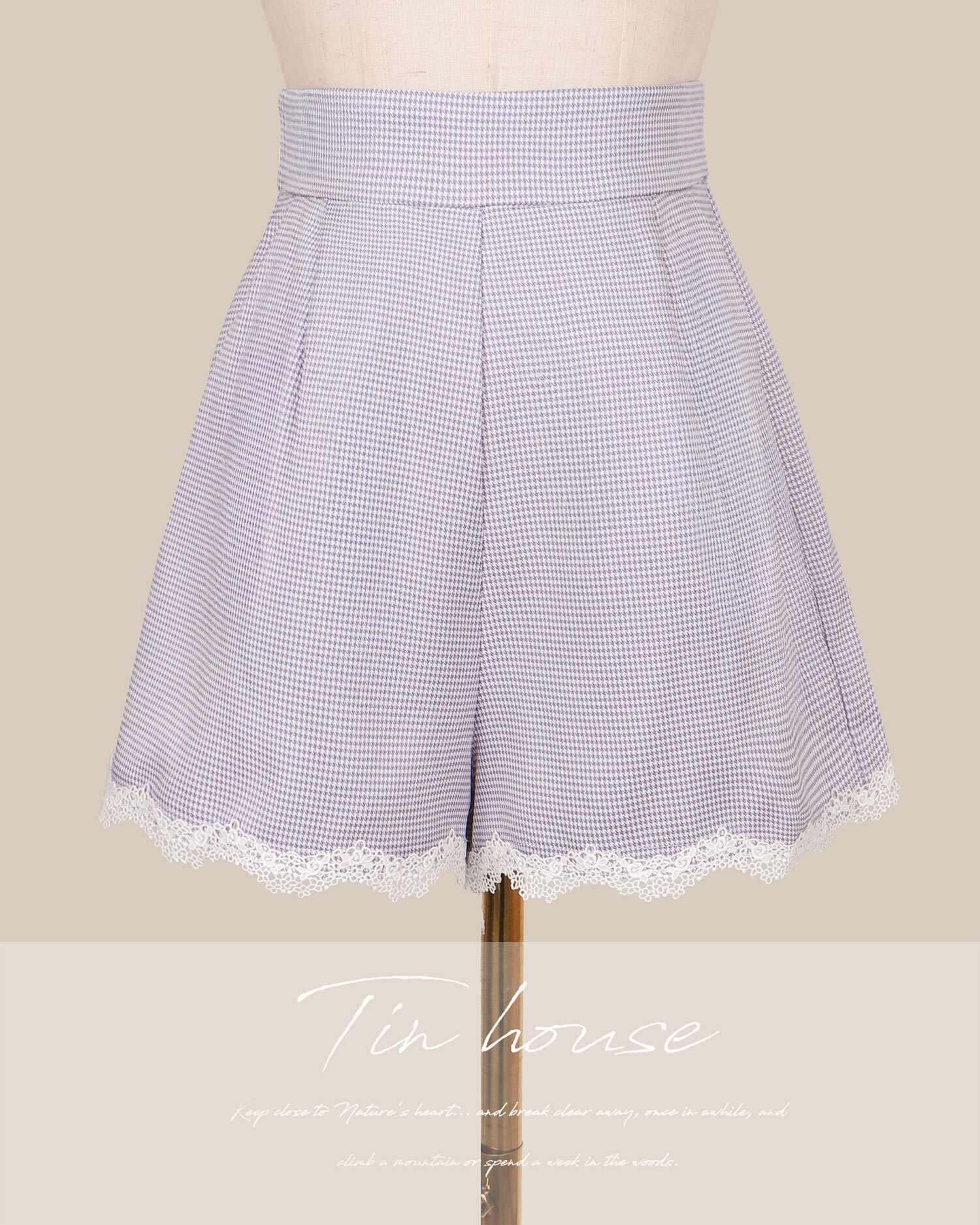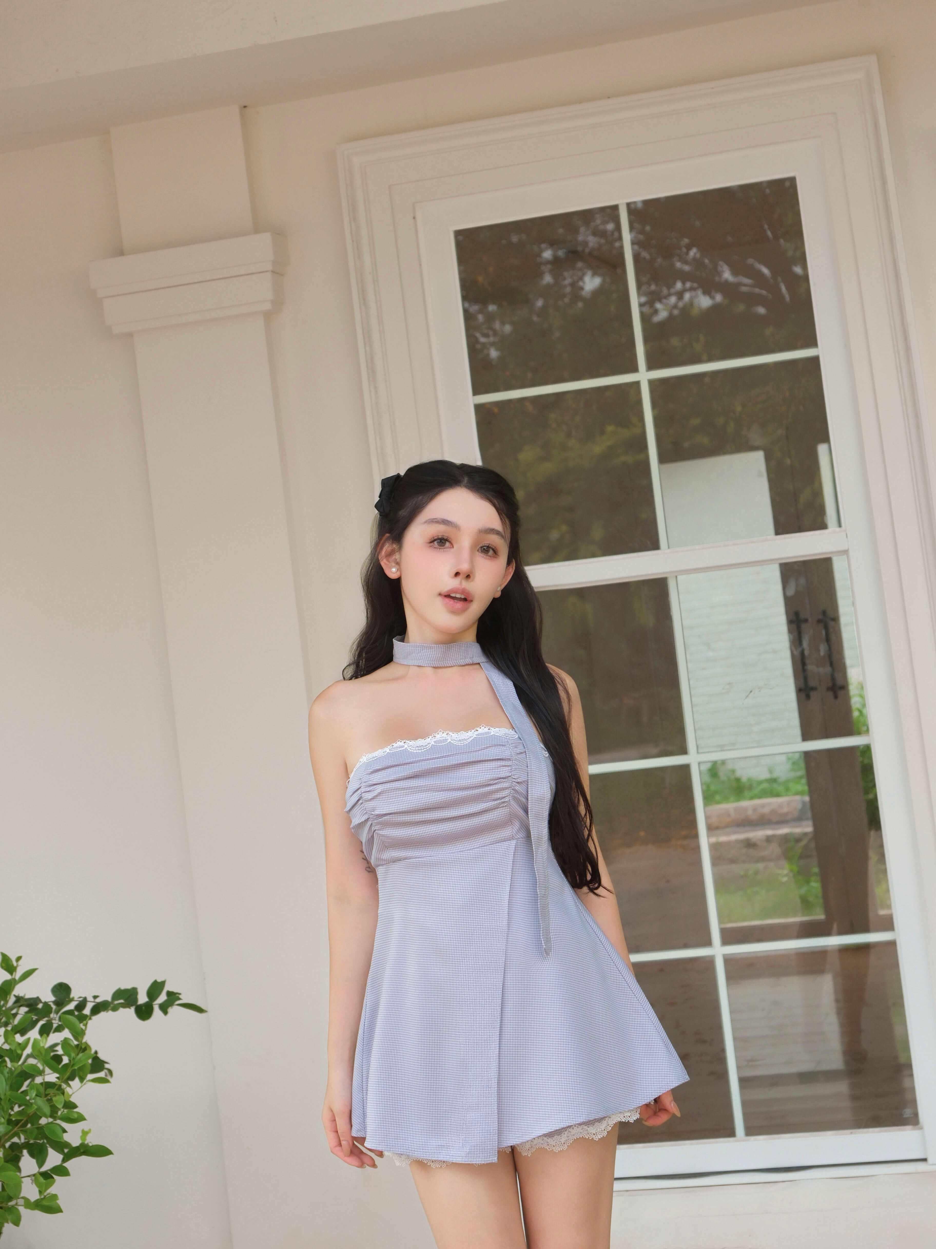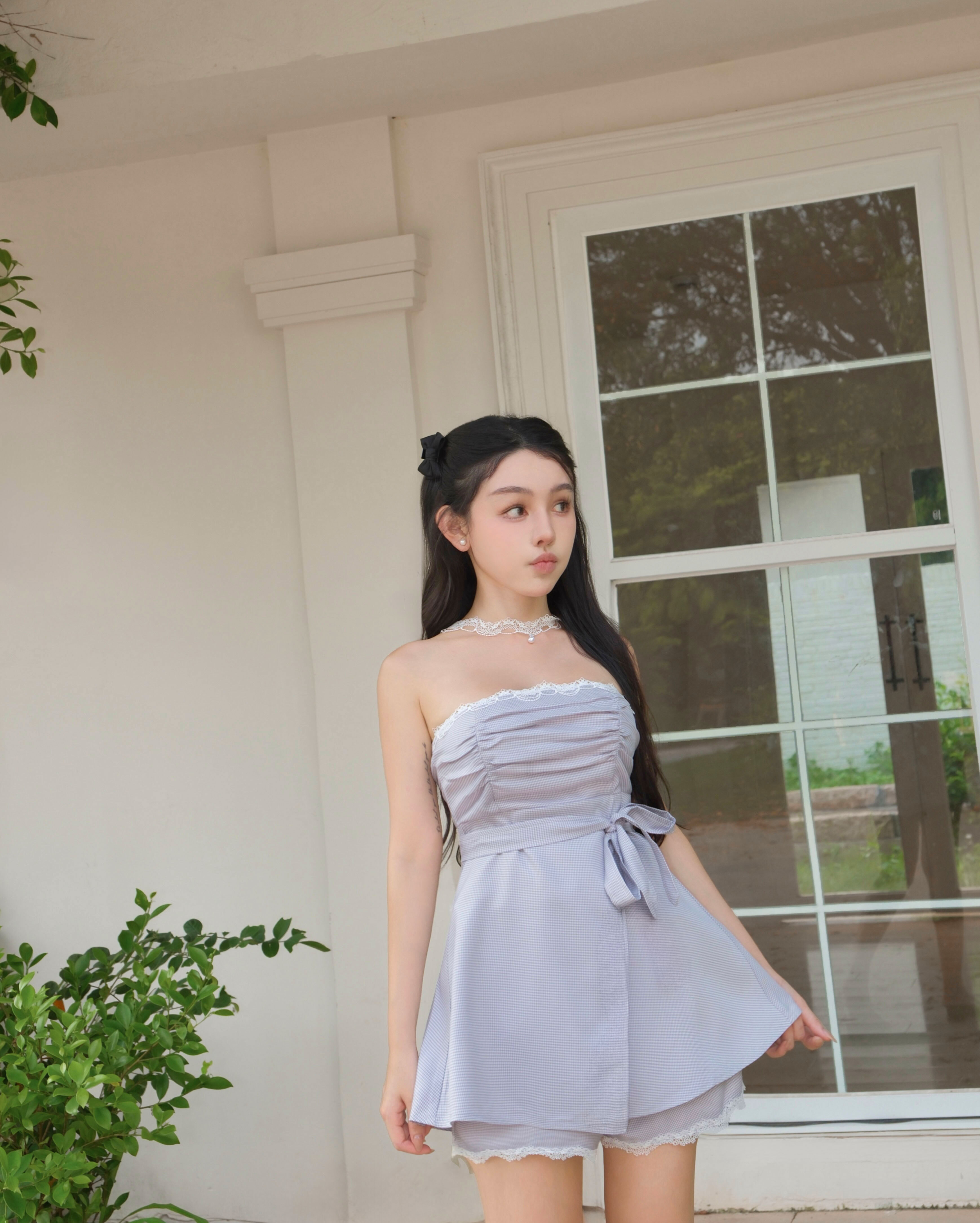 訂製-甜美千鳥格抓皺平口套裝