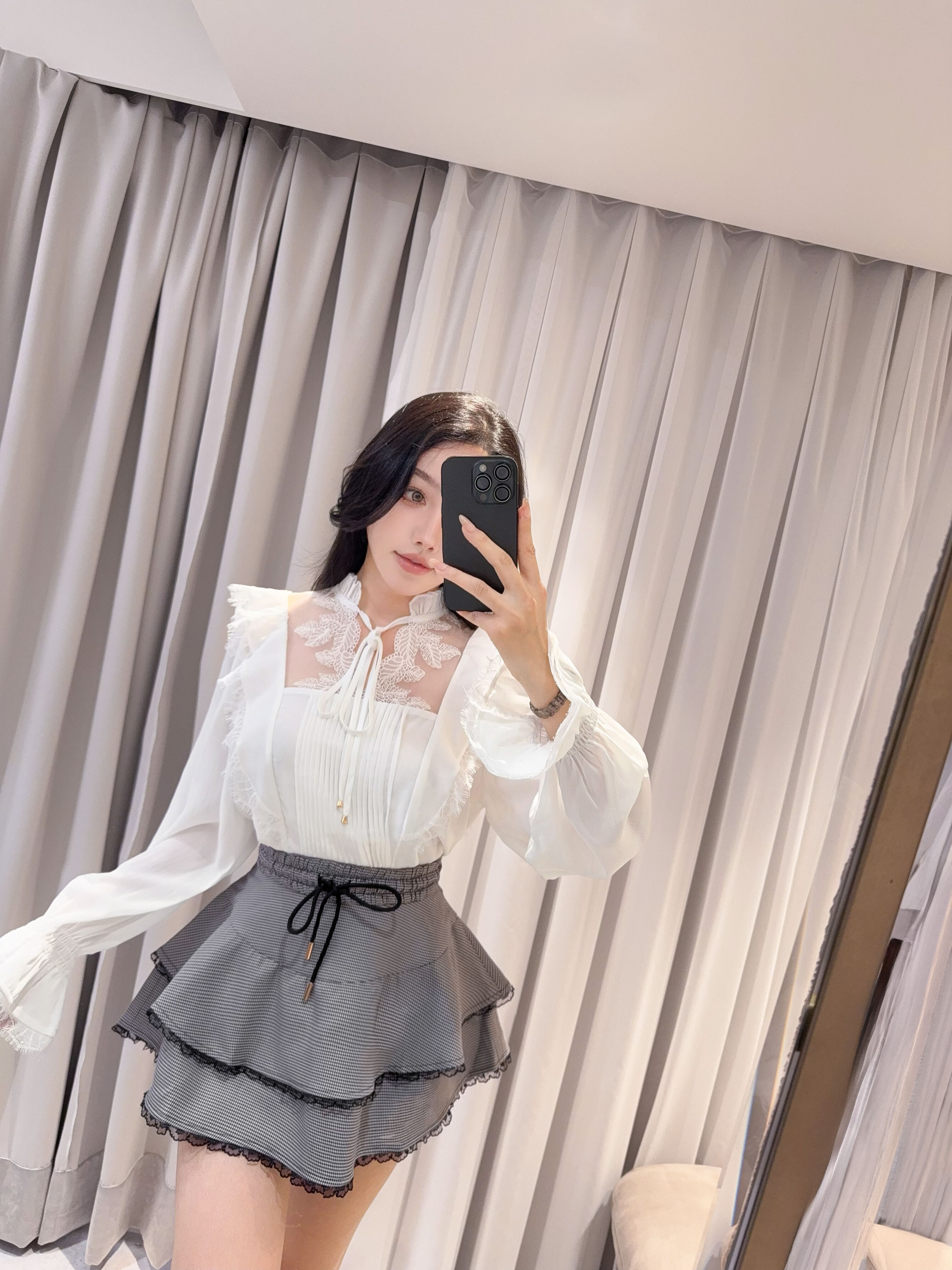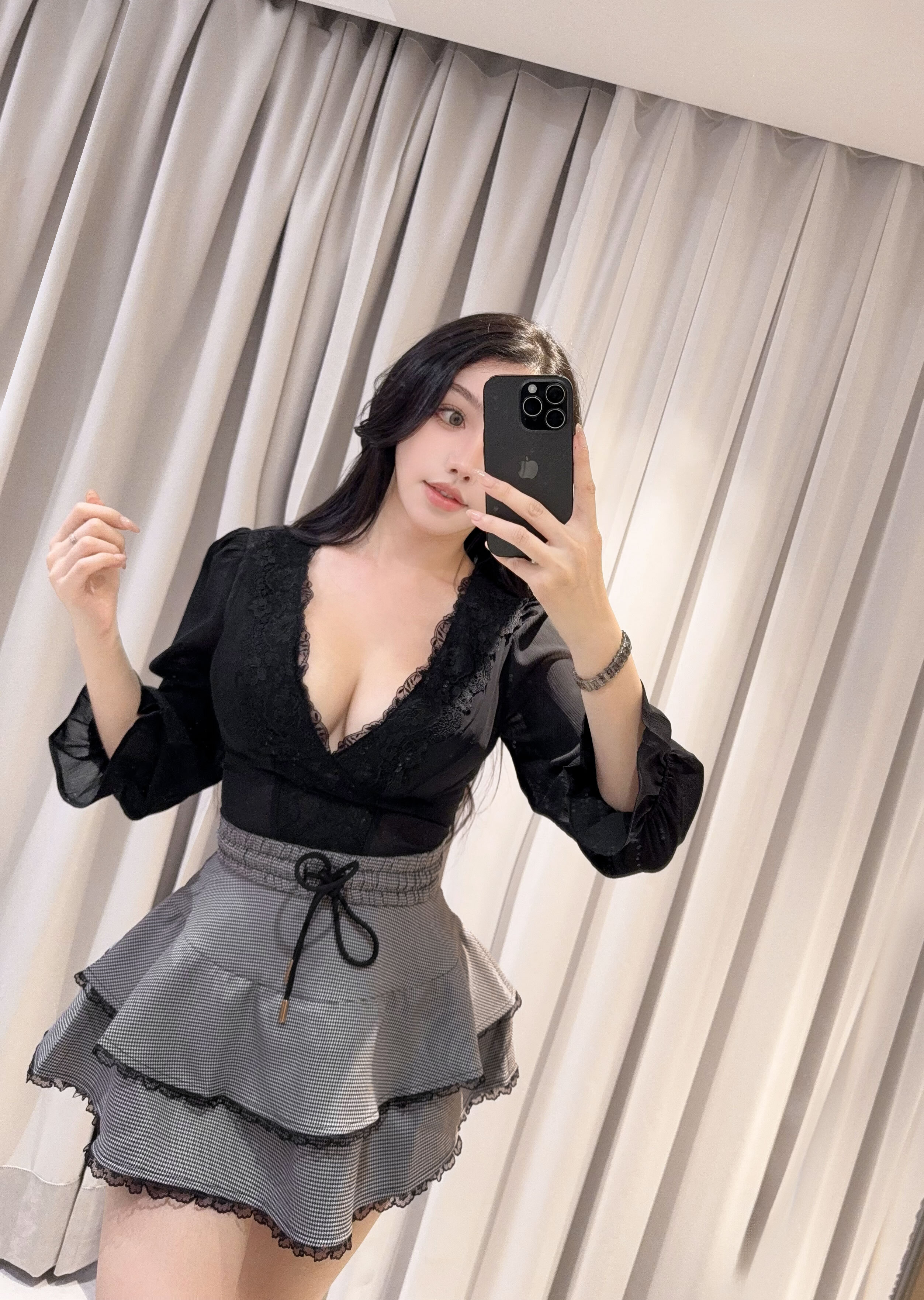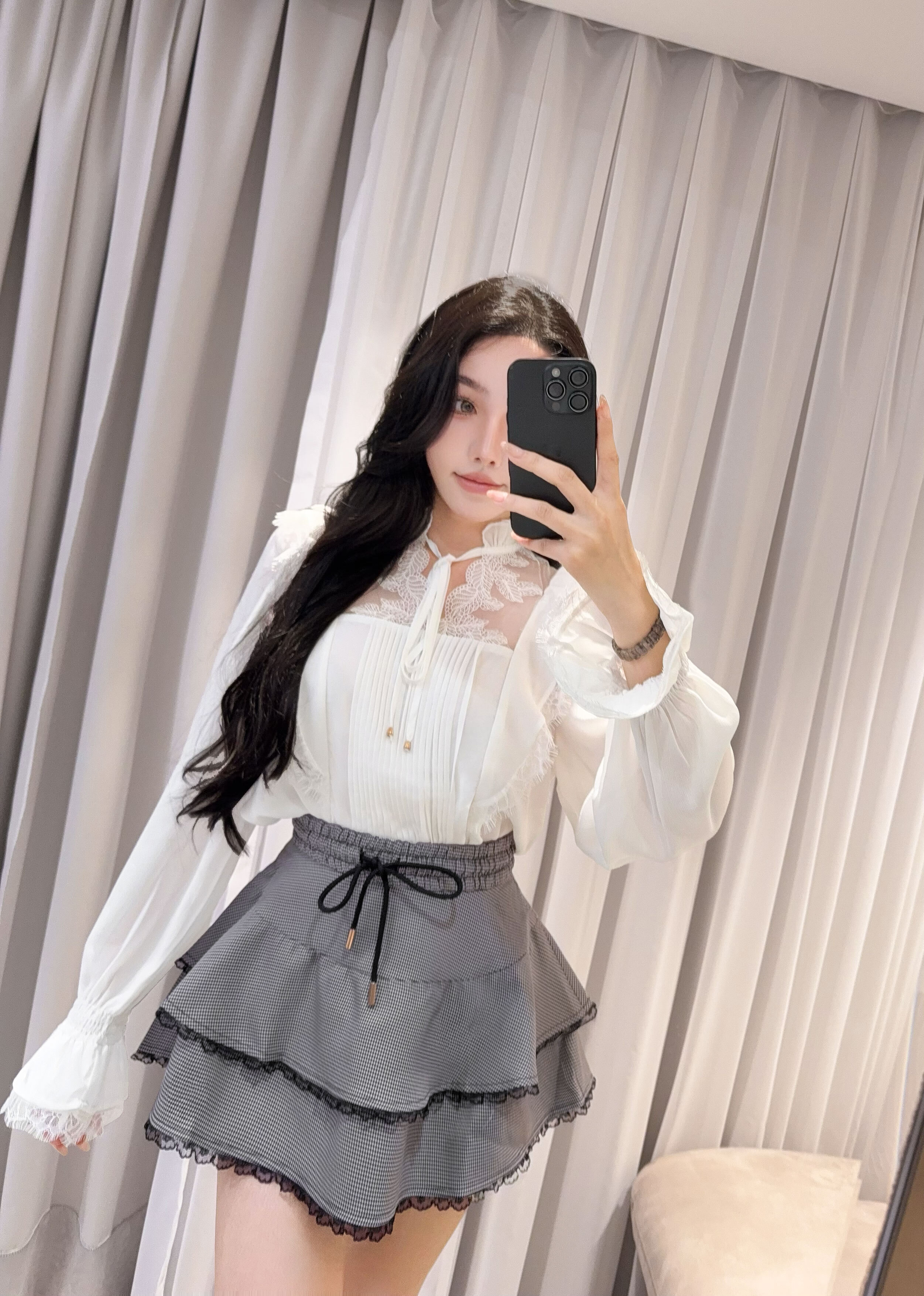 訂製-甜美千鳥格蕾絲雙層荷葉褲裙