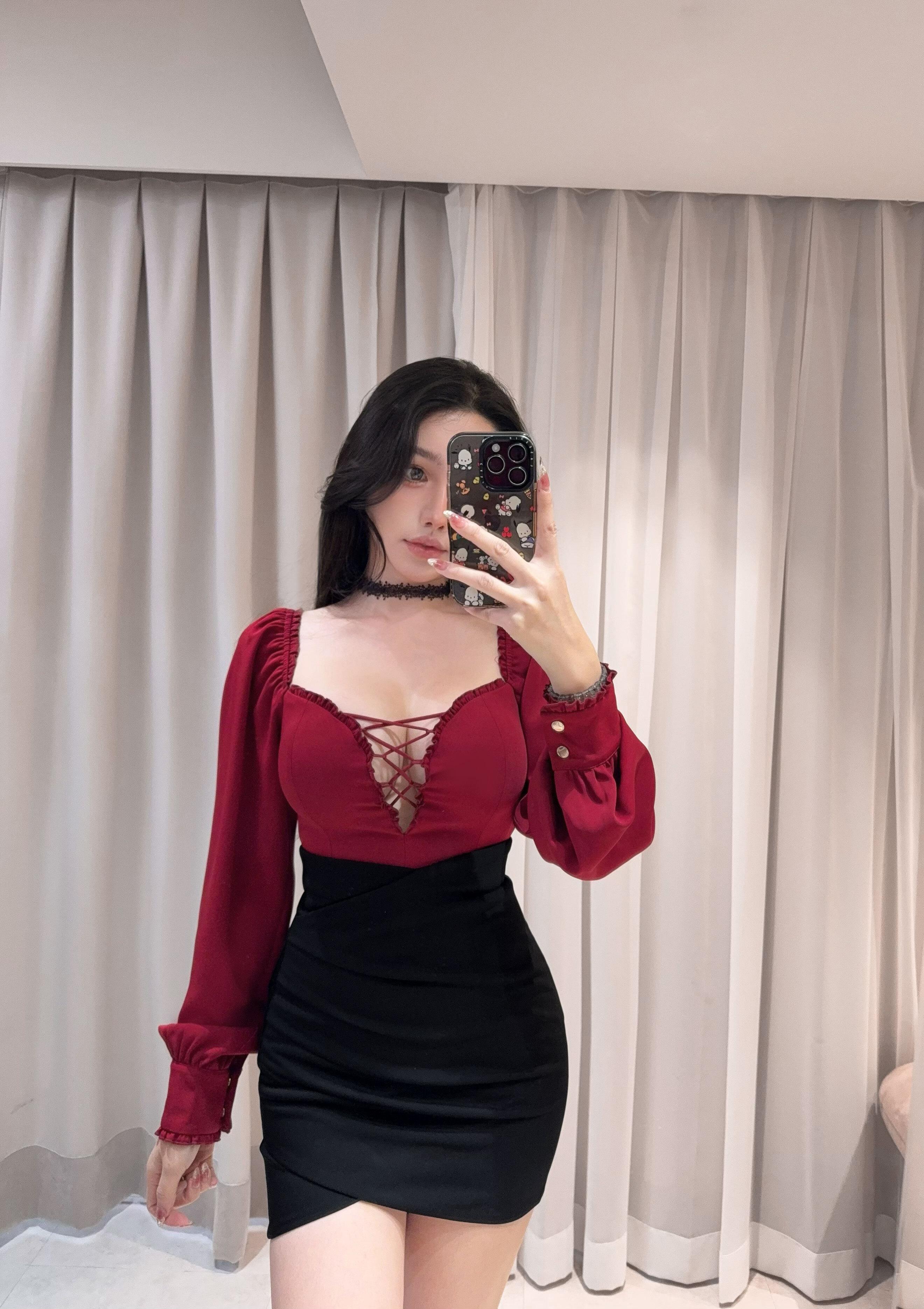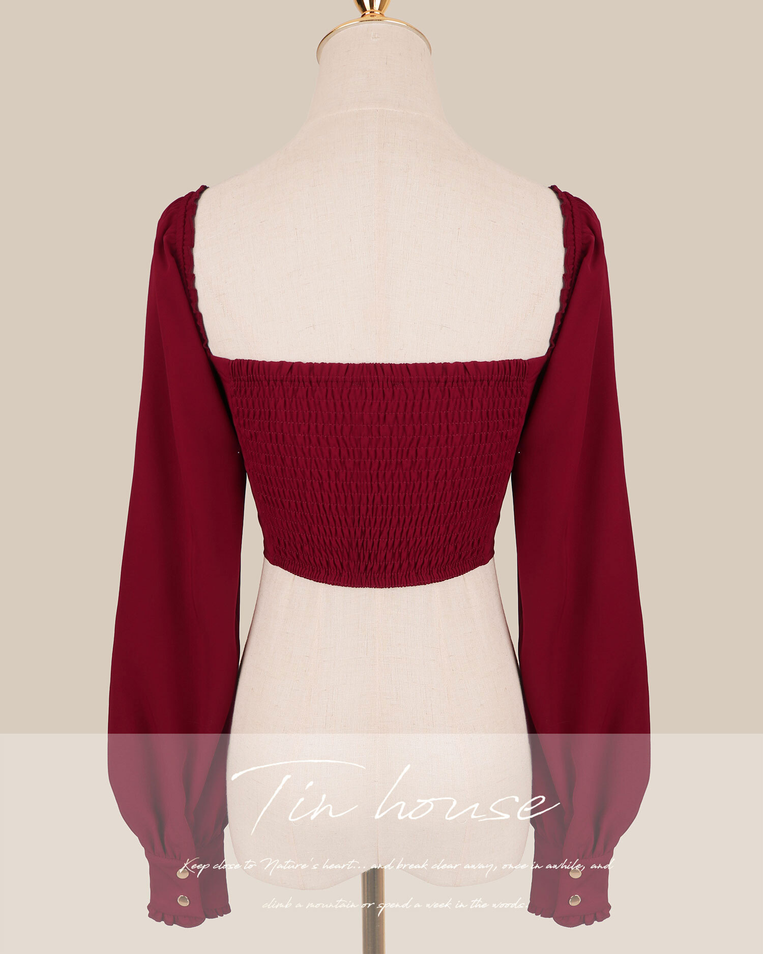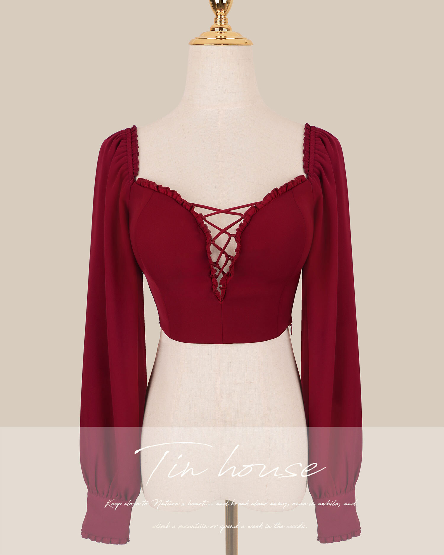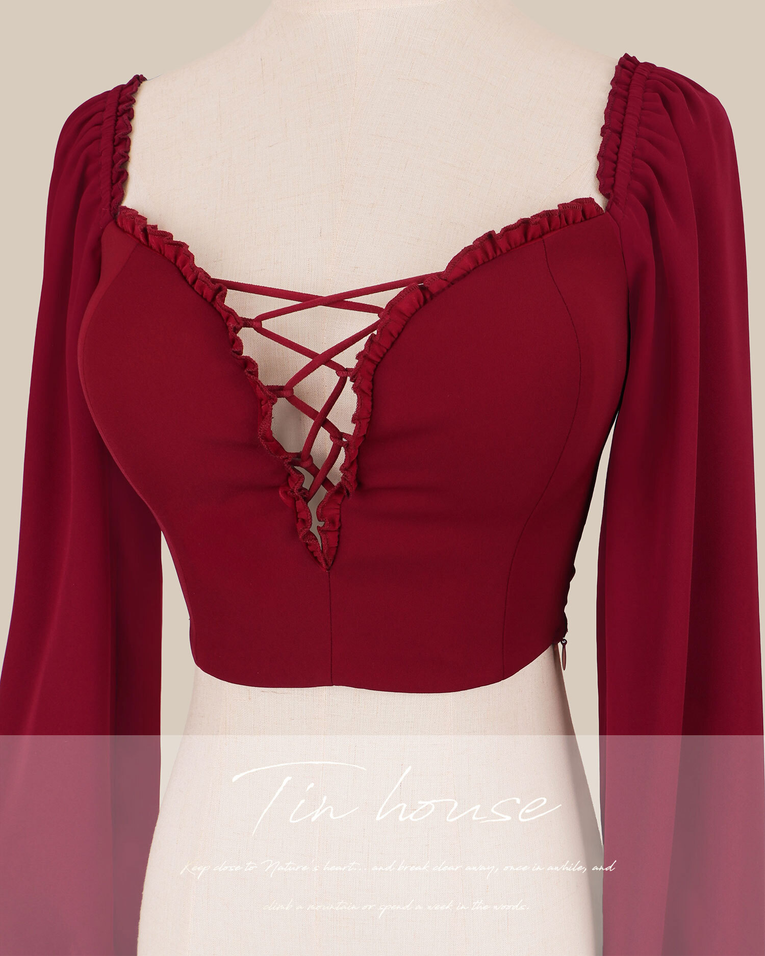 紅色限定-性感穿繩交叉低胸泡泡袖上衣