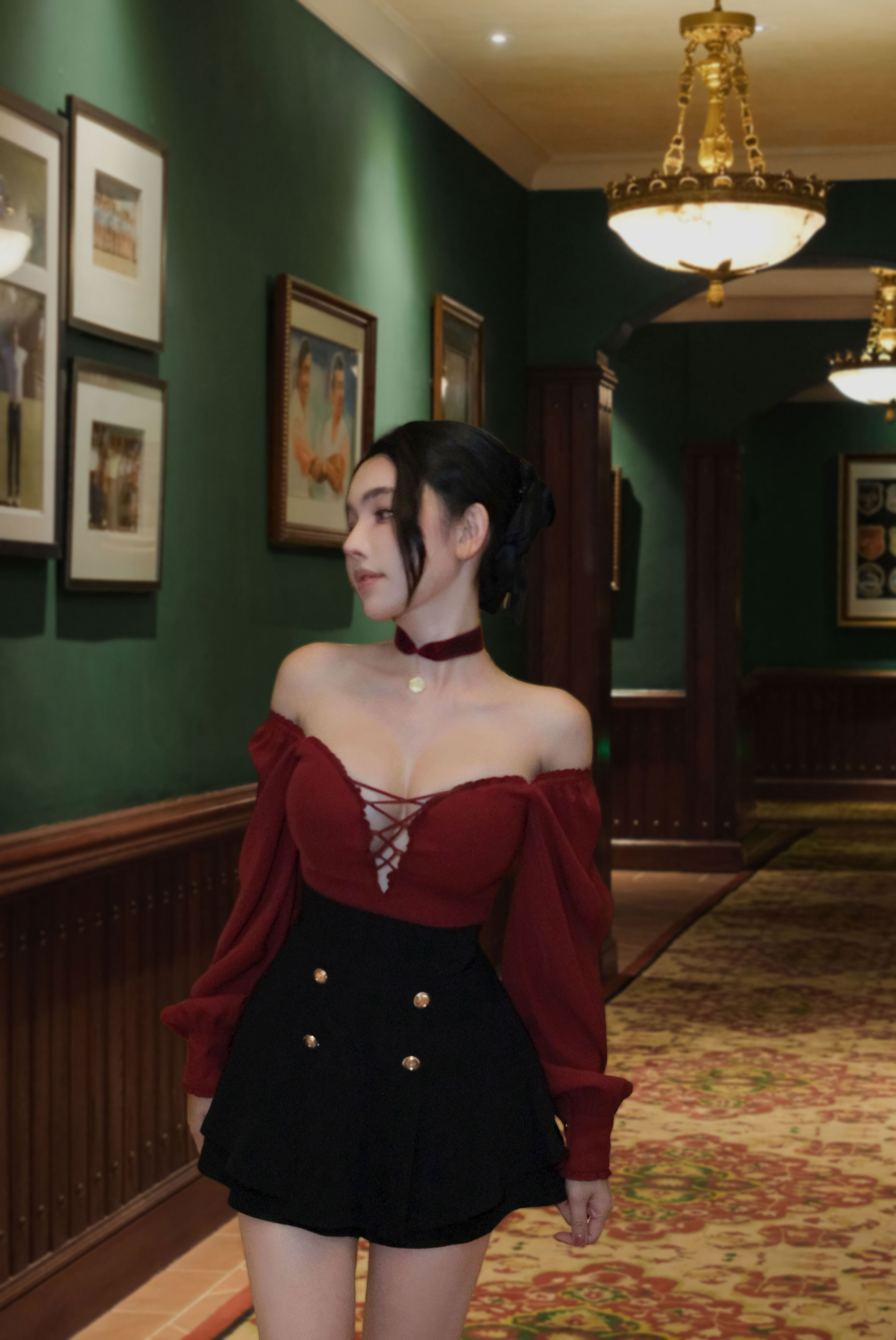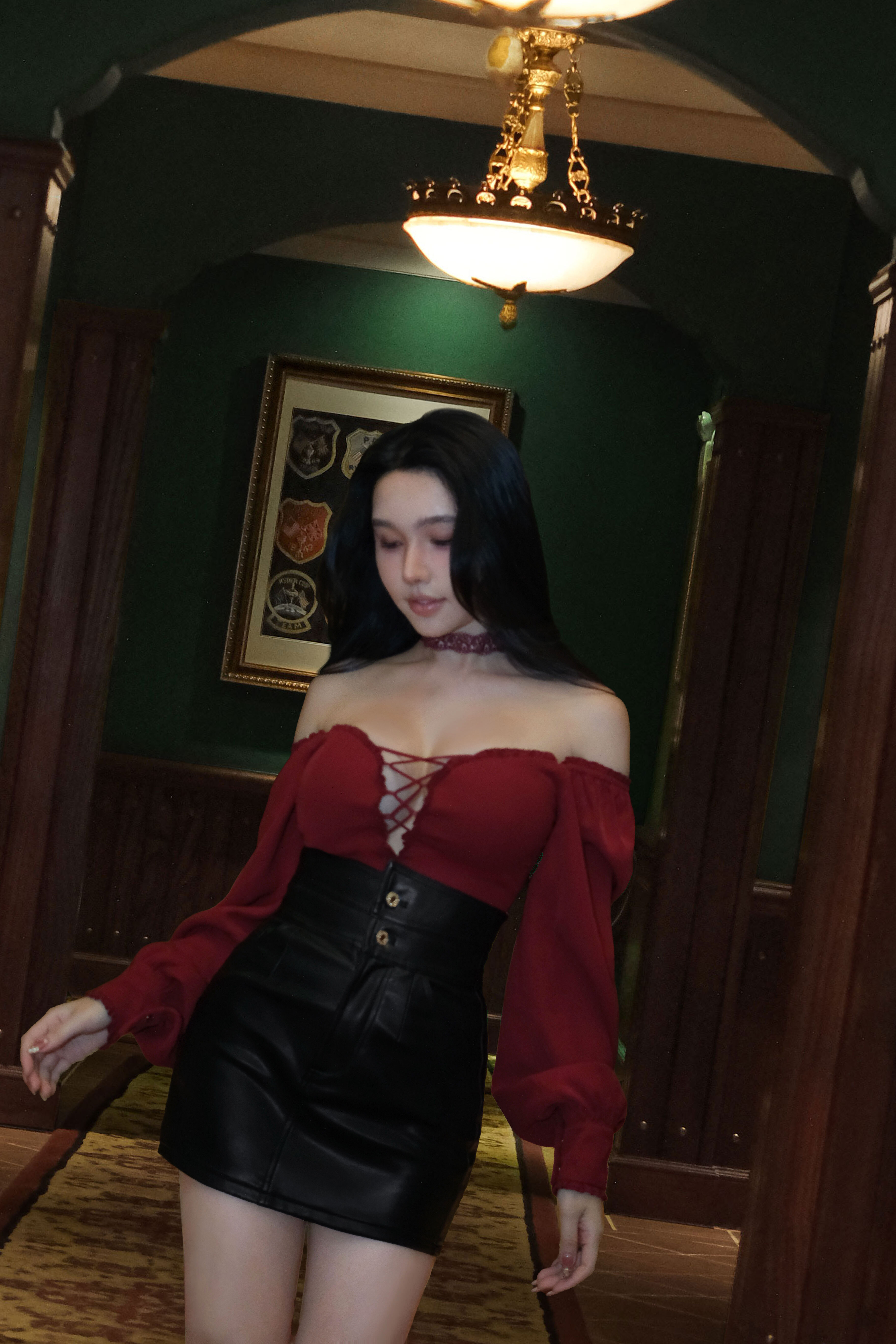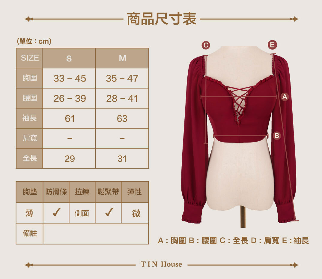 紅色限定-性感穿繩交叉低胸泡泡袖上衣