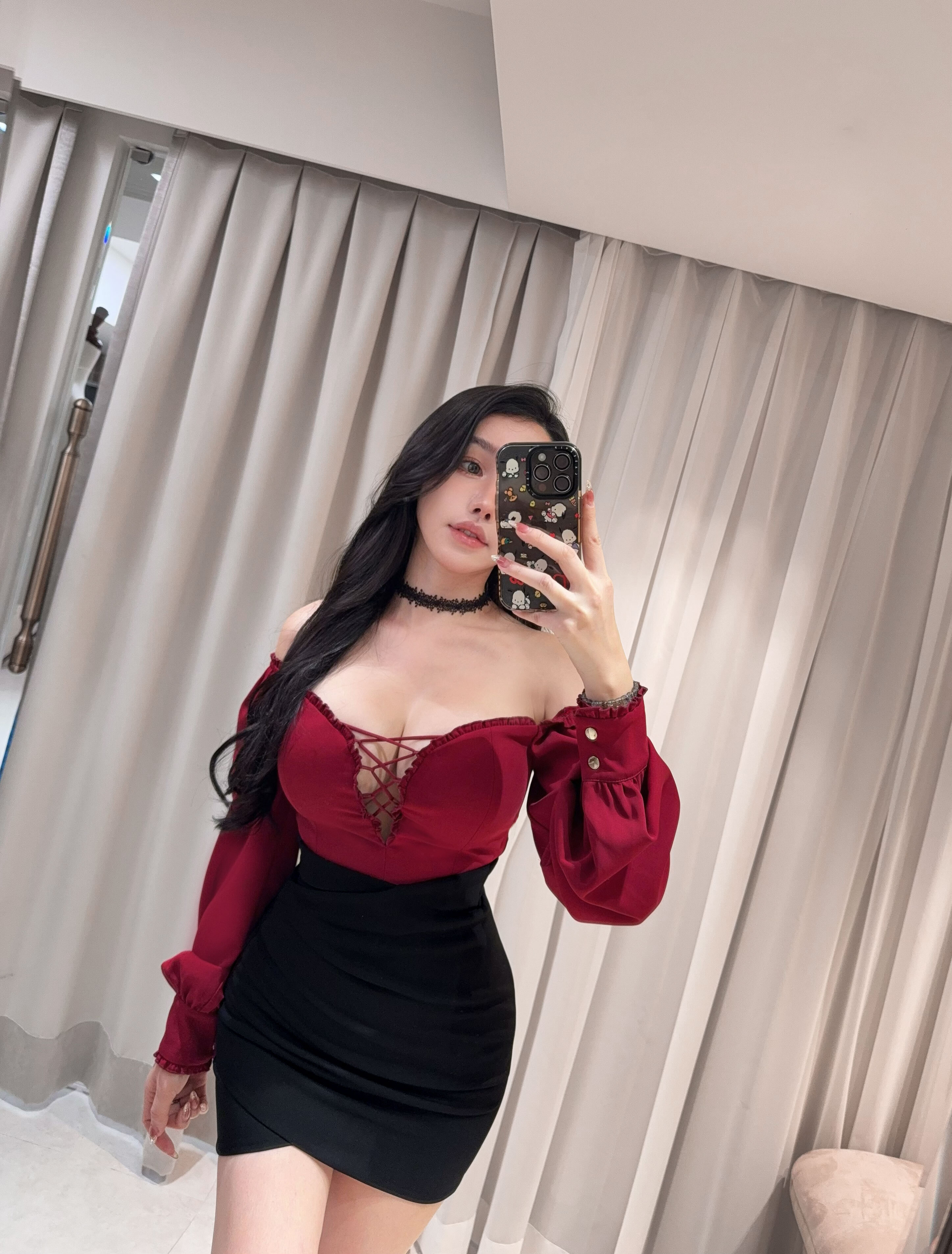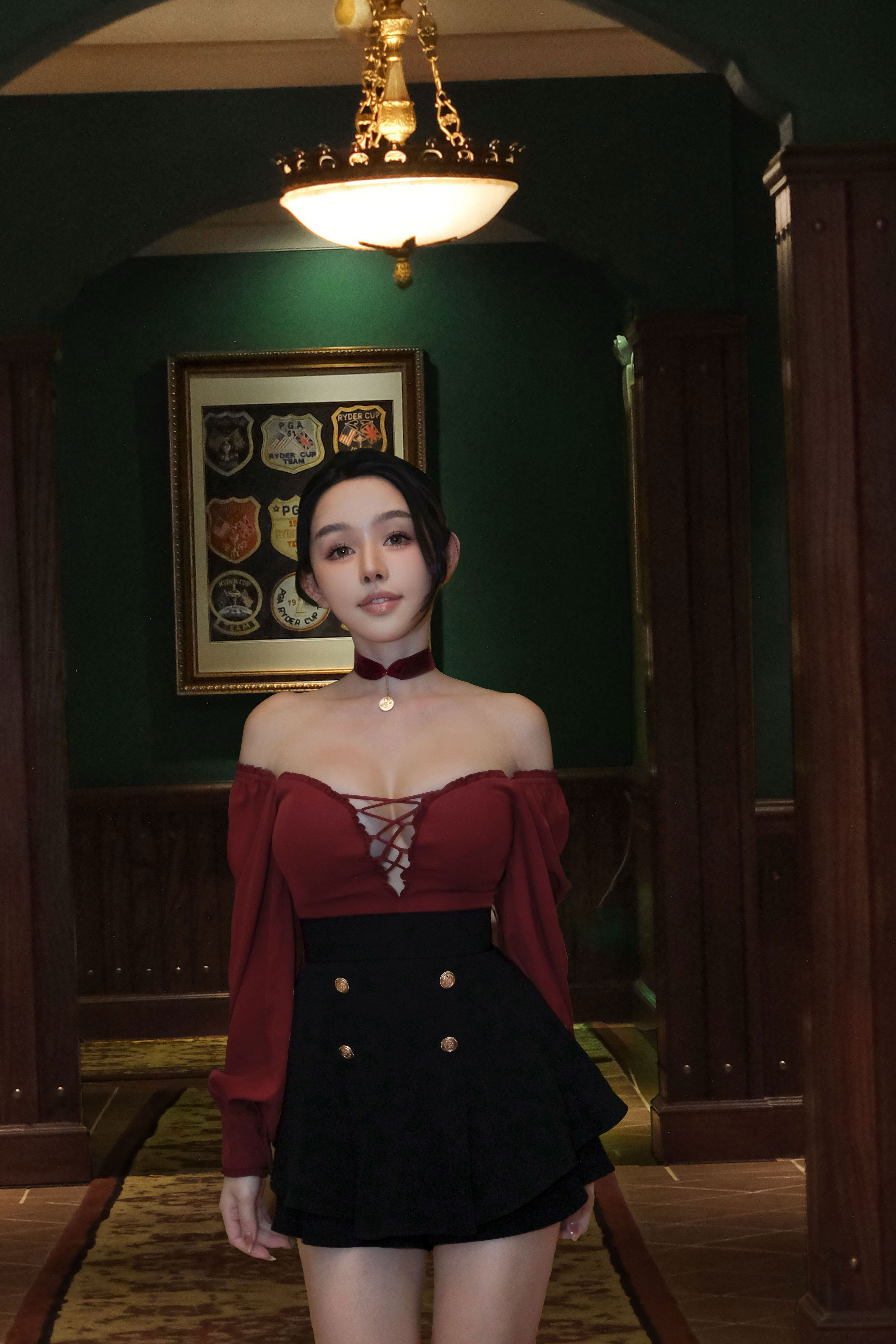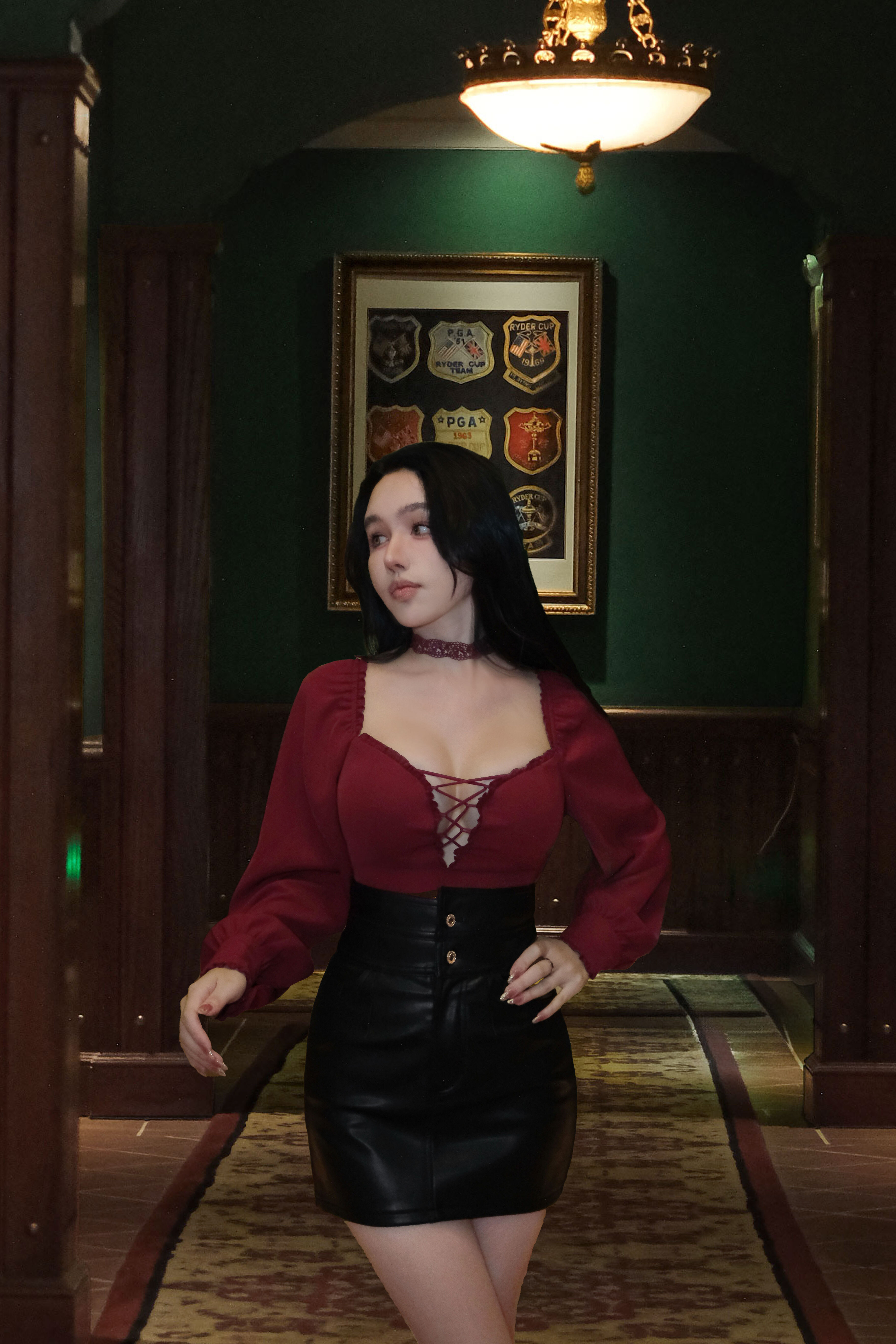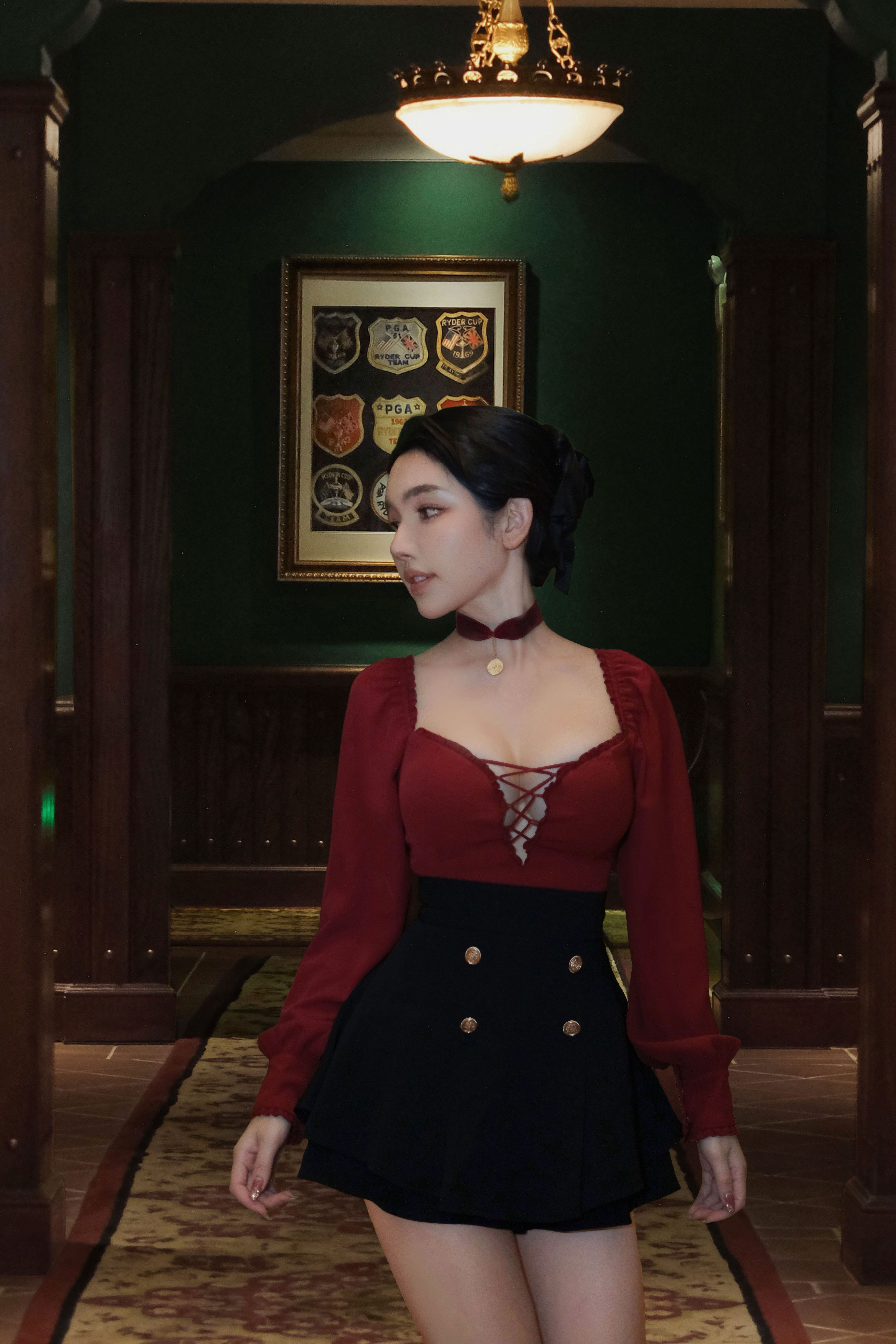 紅色限定-性感穿繩交叉低胸泡泡袖上衣