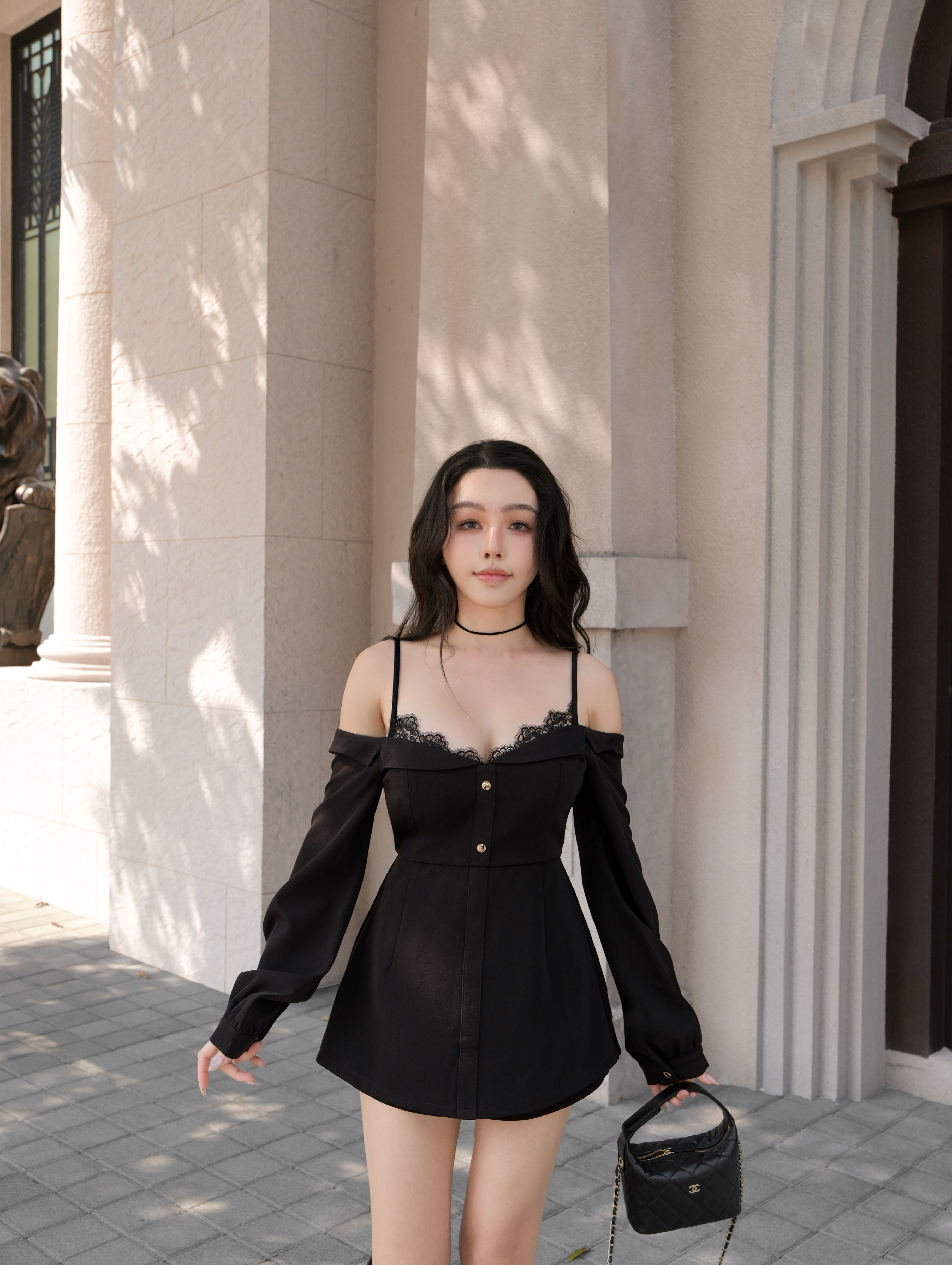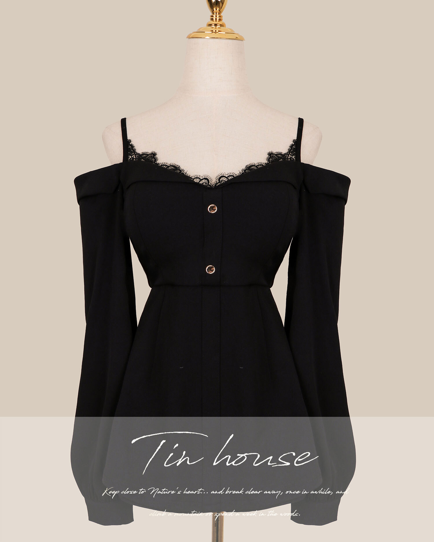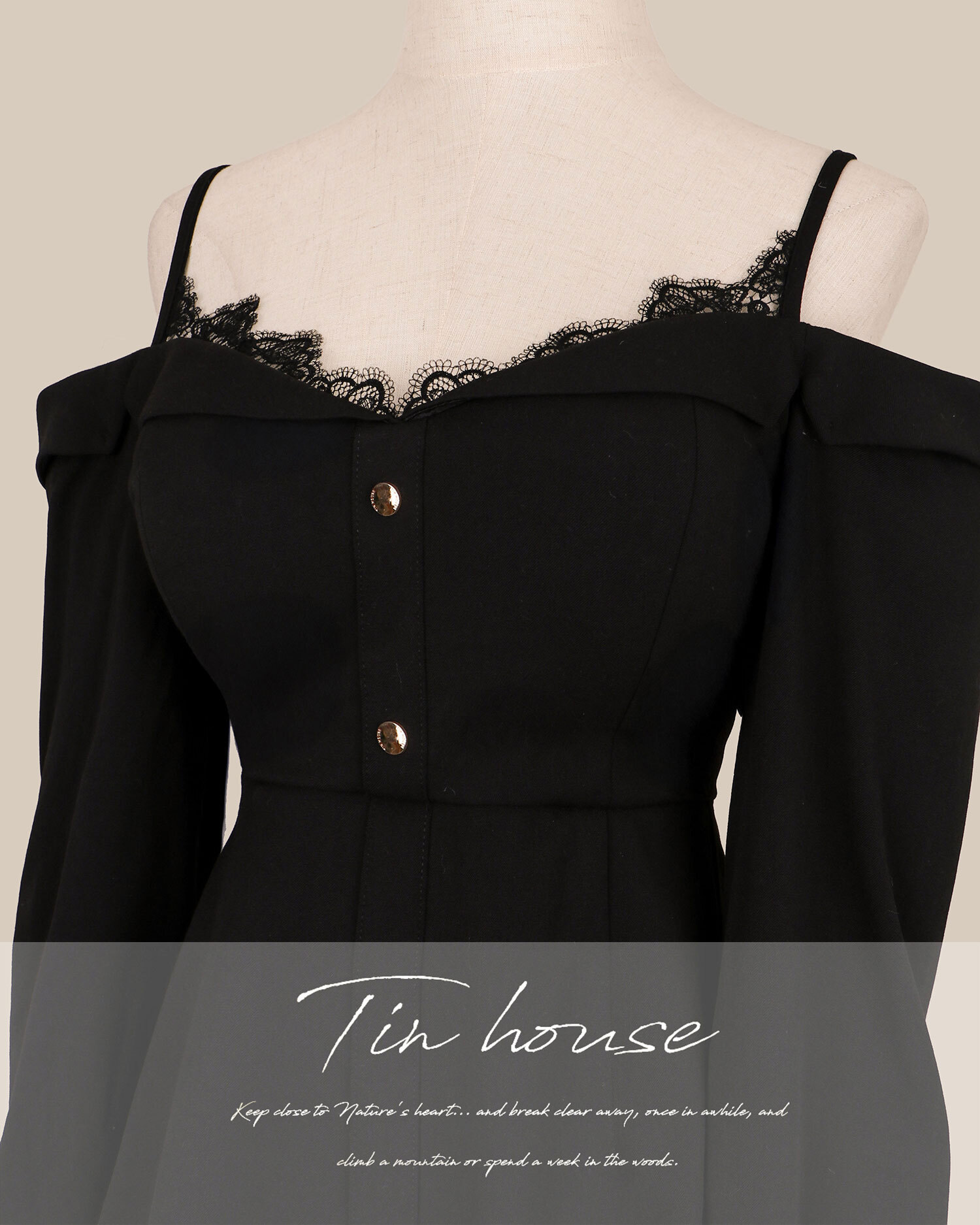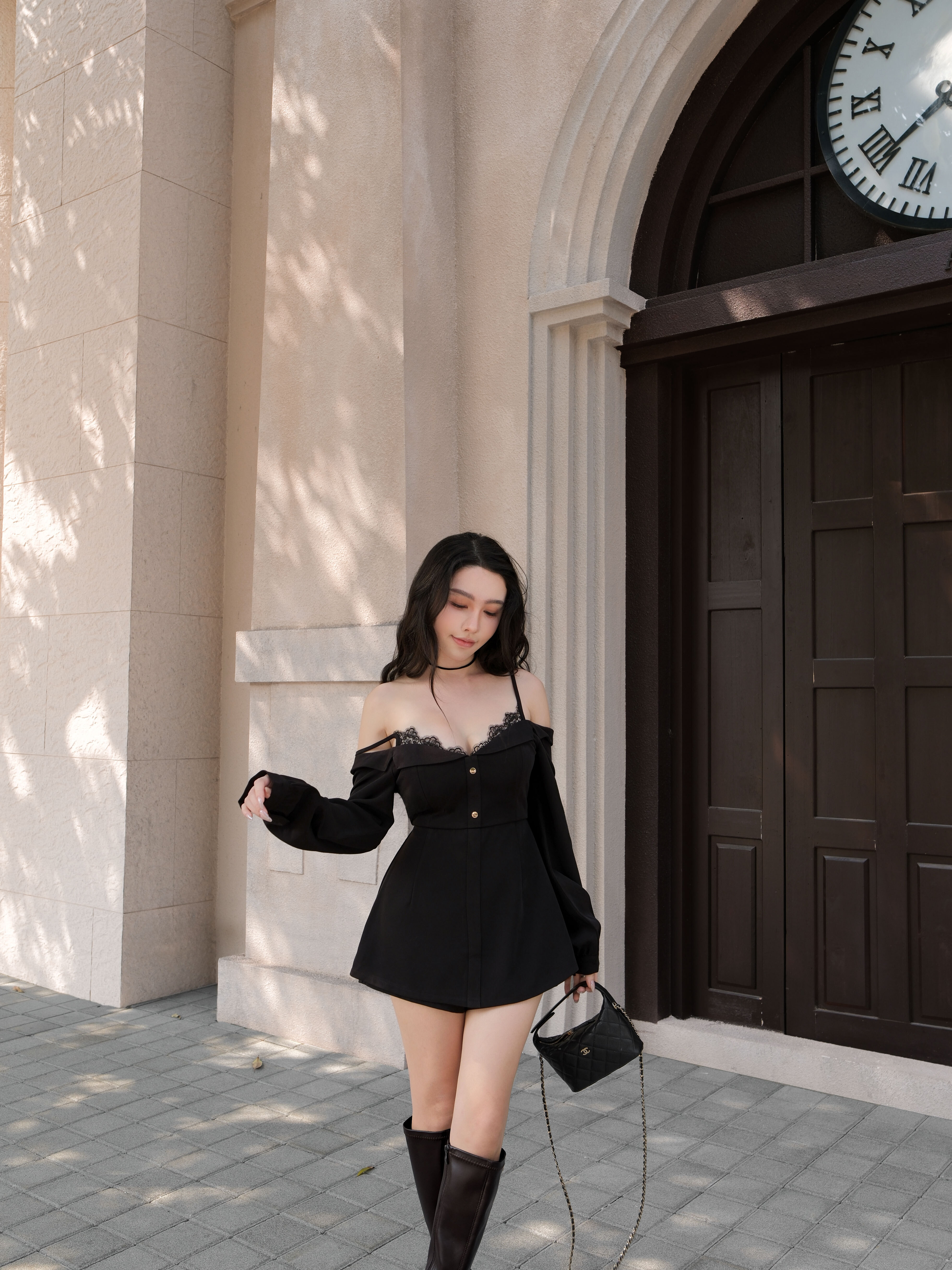 限量-質感細肩蕾絲一字領連身短褲