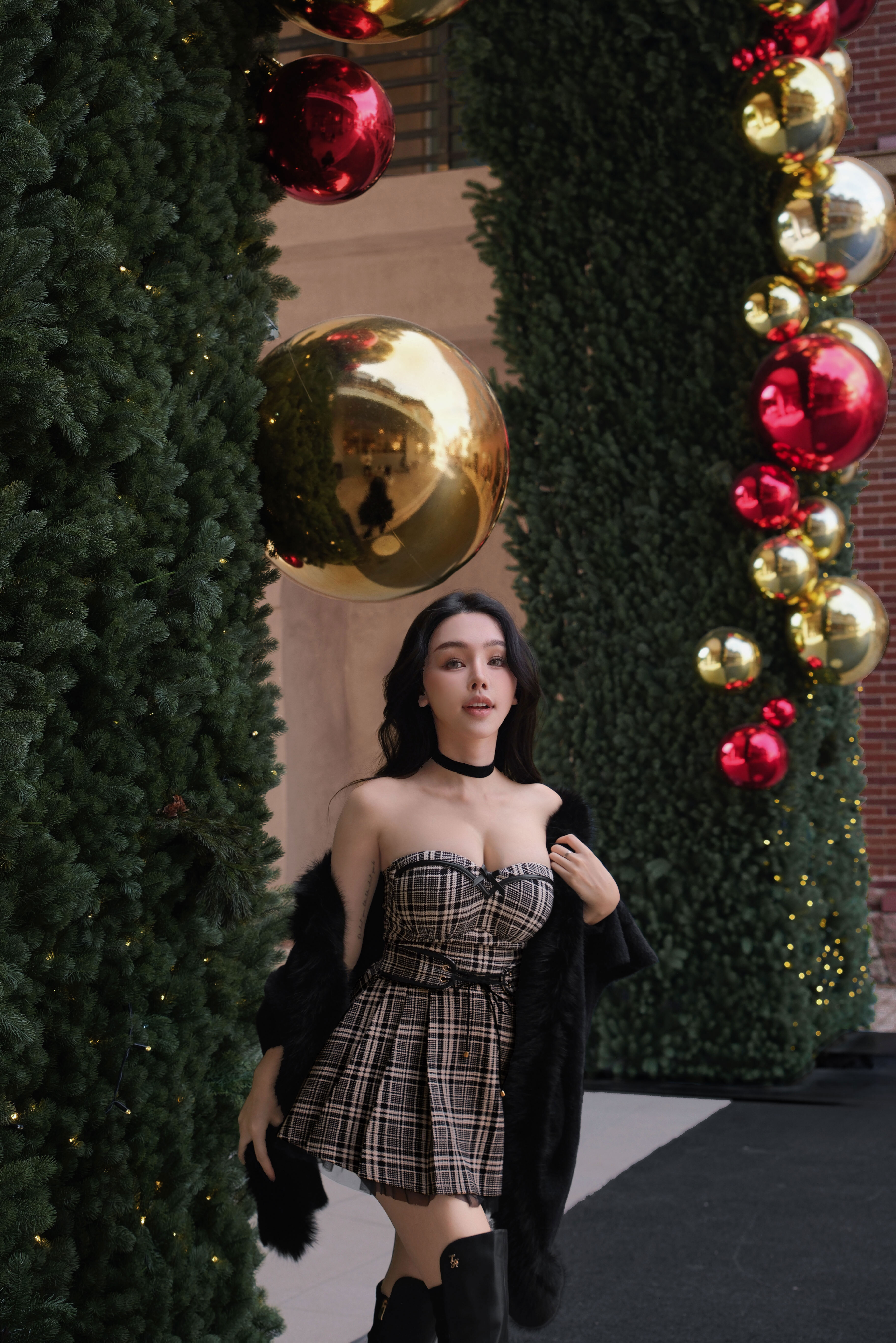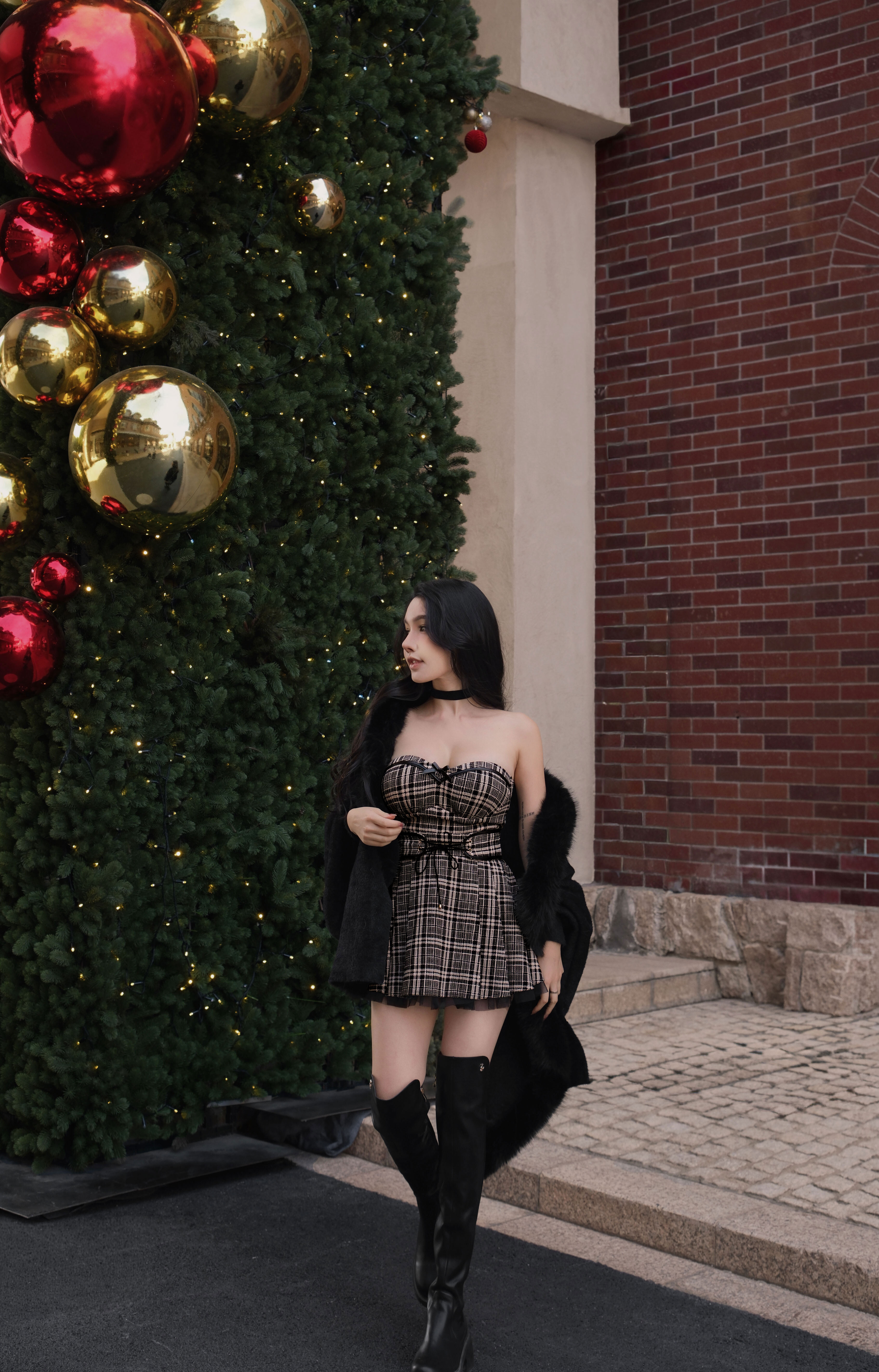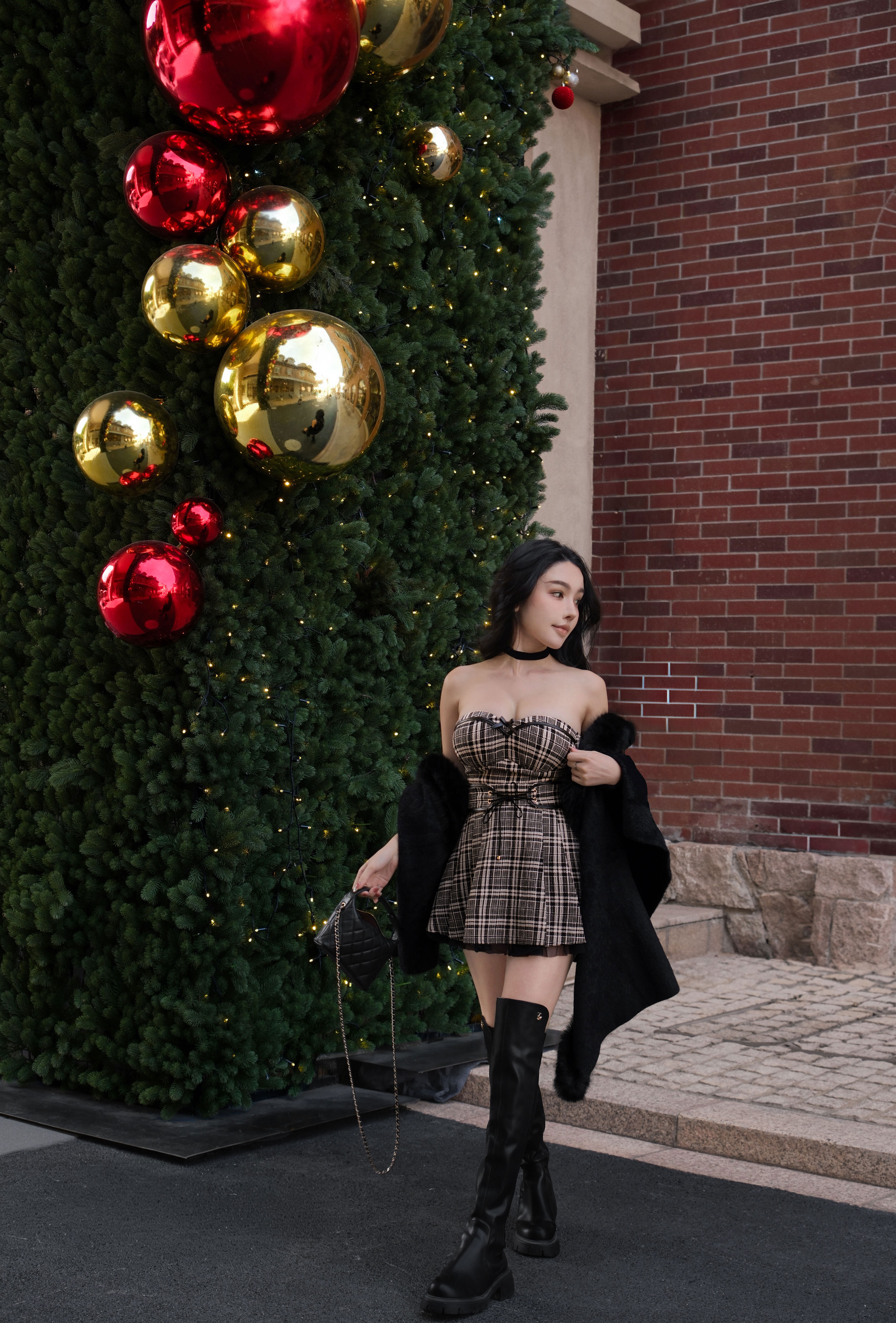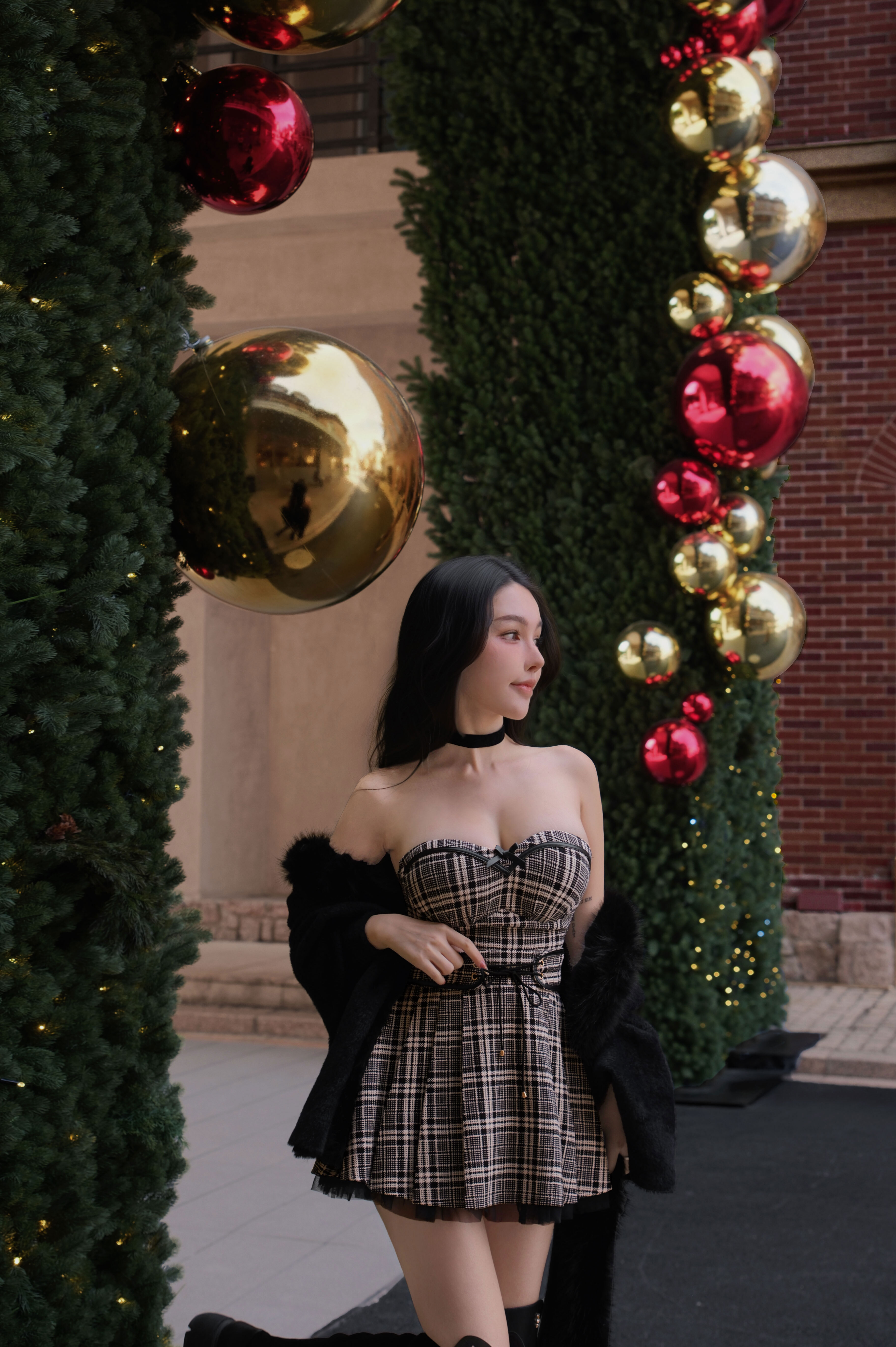 聖誕限定-皮革線條拼接網紗百褶裙