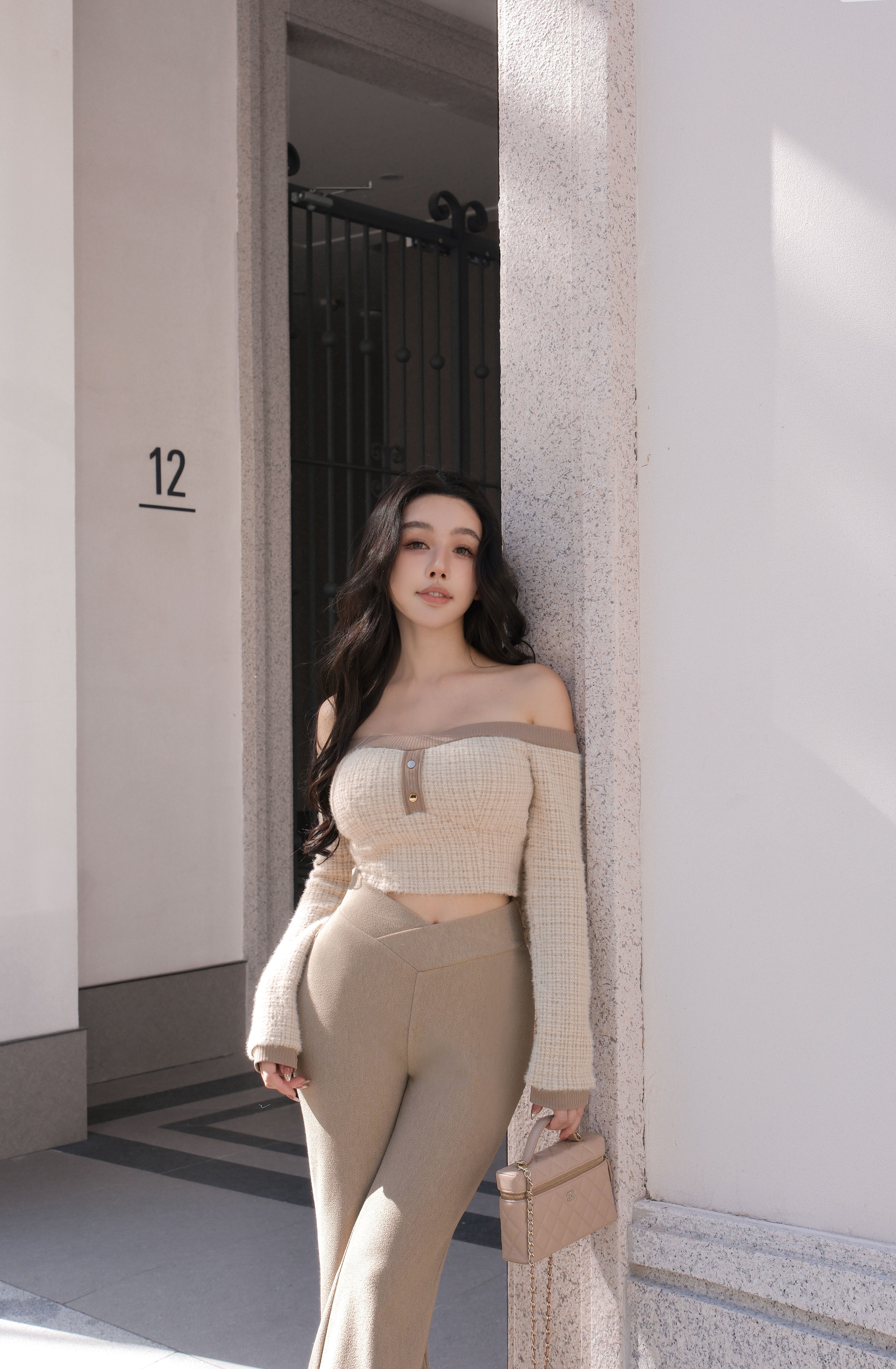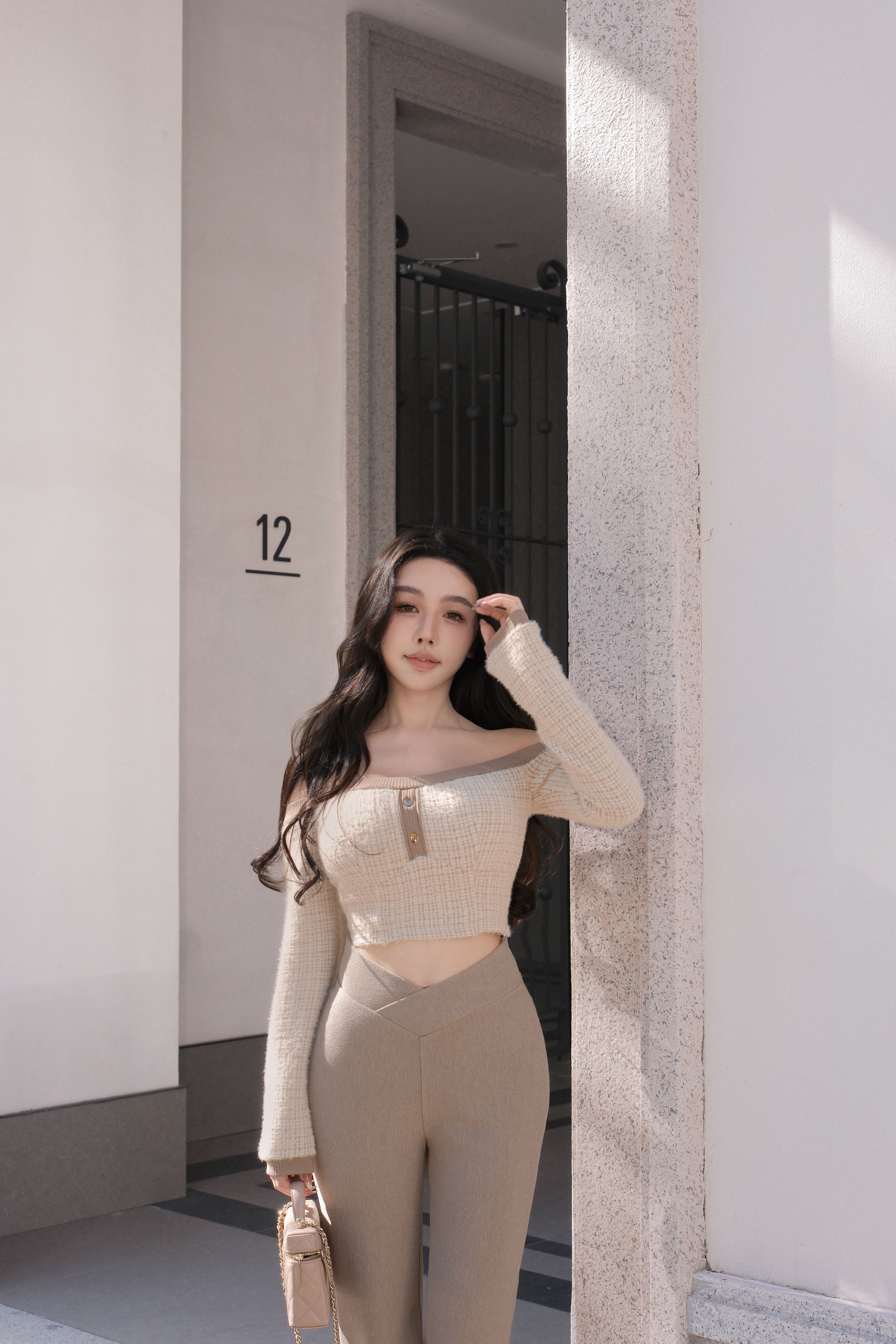 訂製-雙色亮蔥毛海一字領短上衣