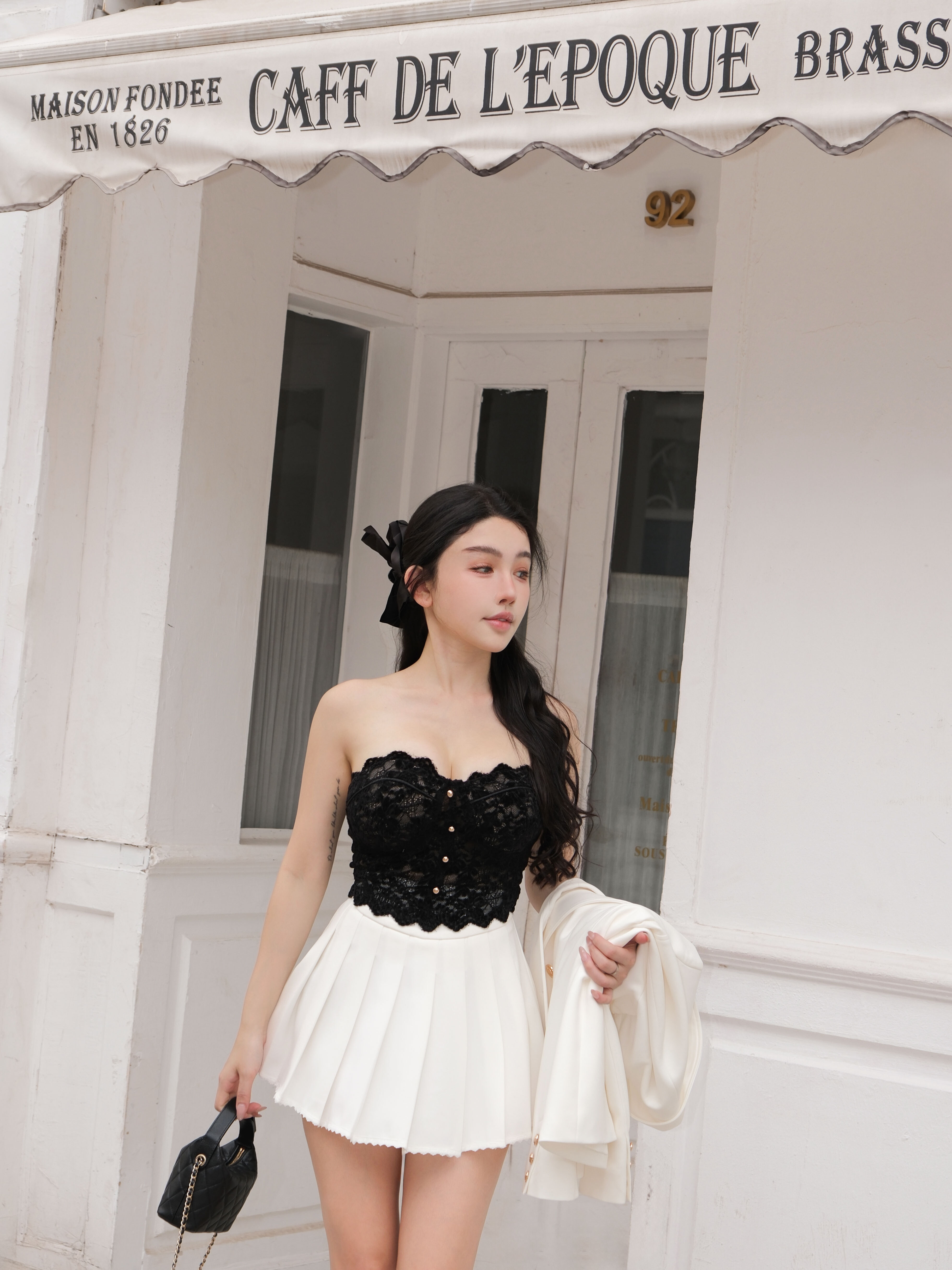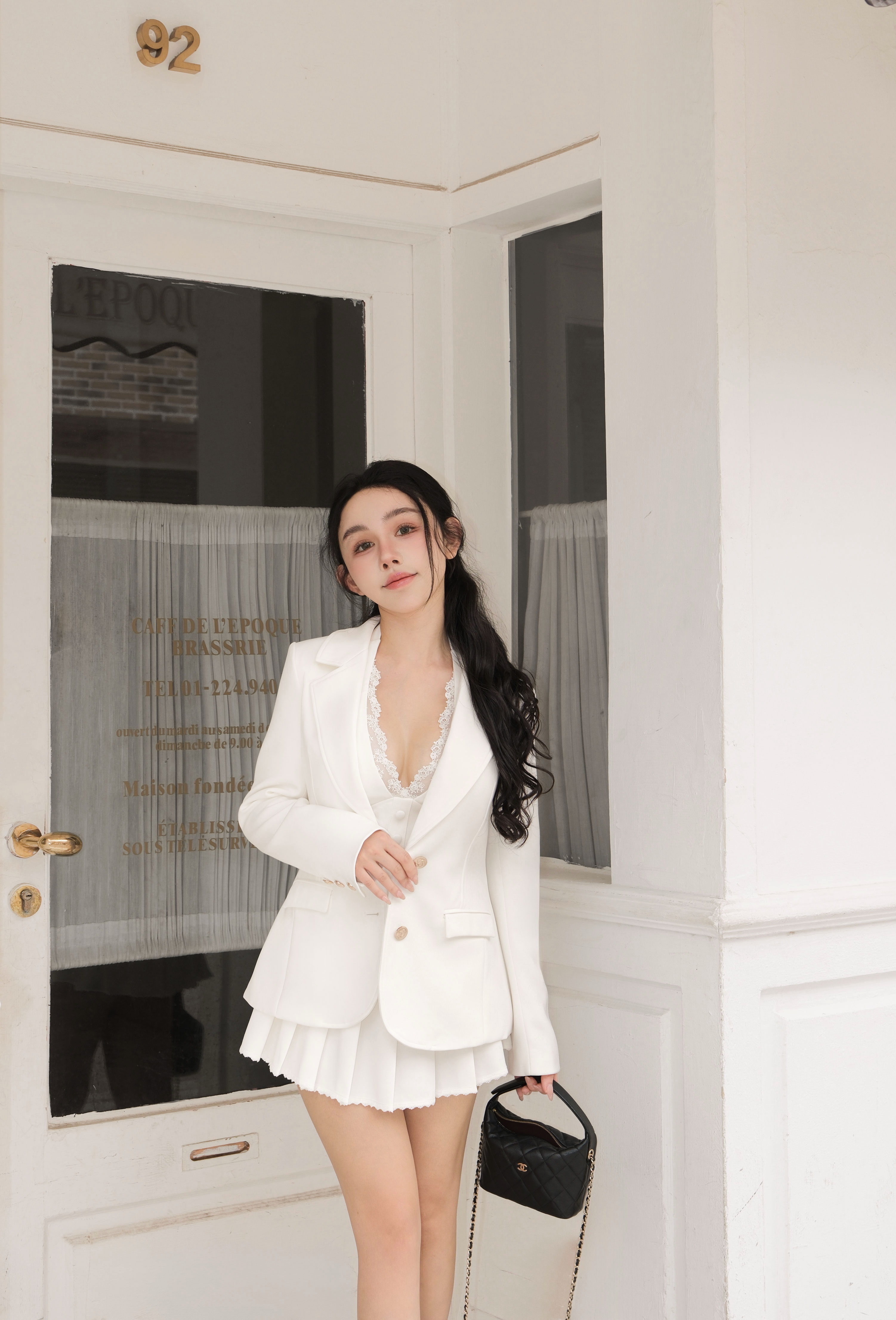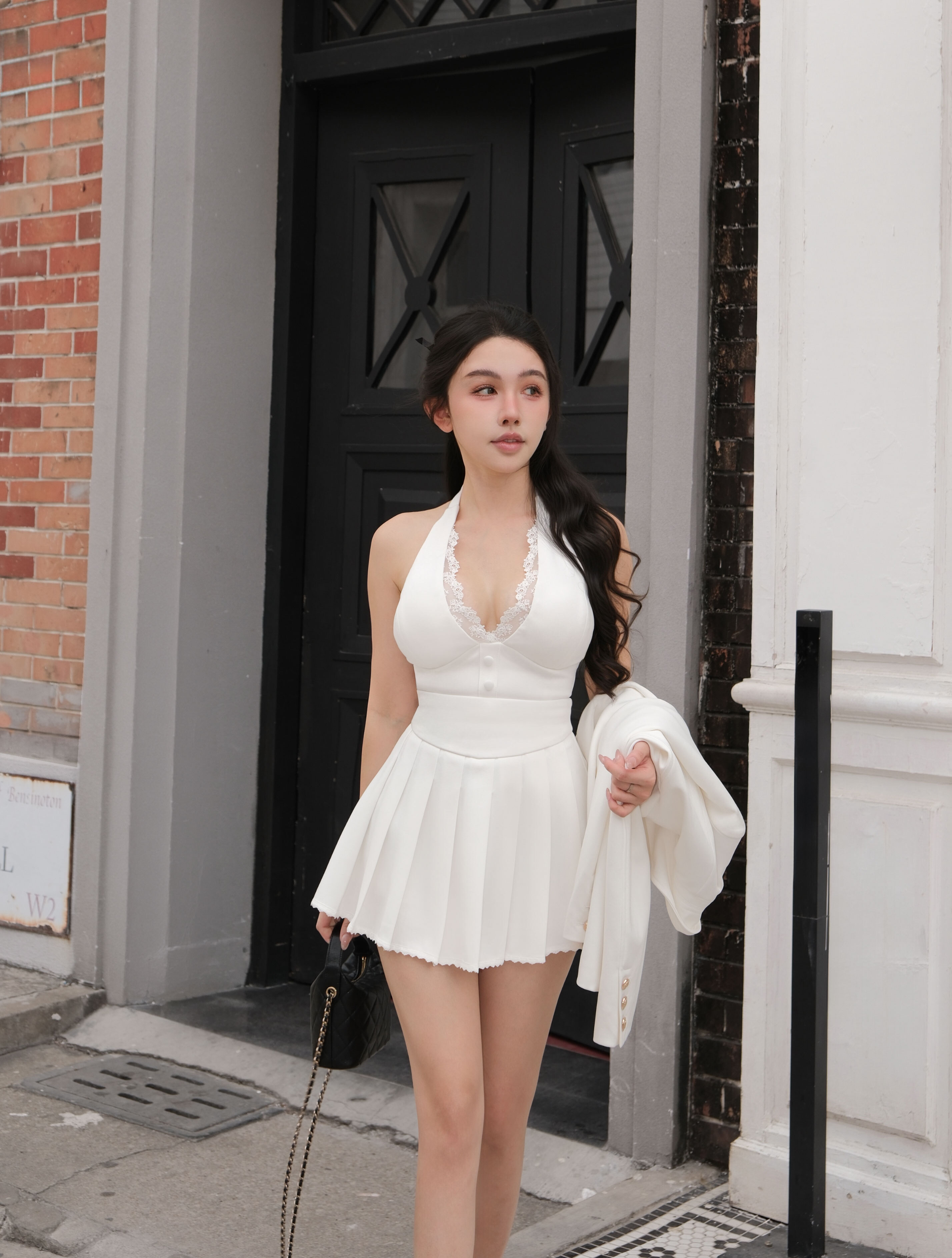 訂製-質感西裝蕾絲百褶短裙