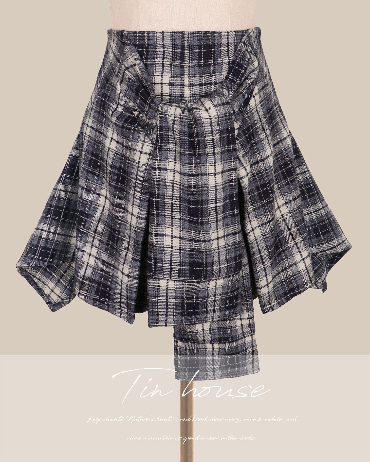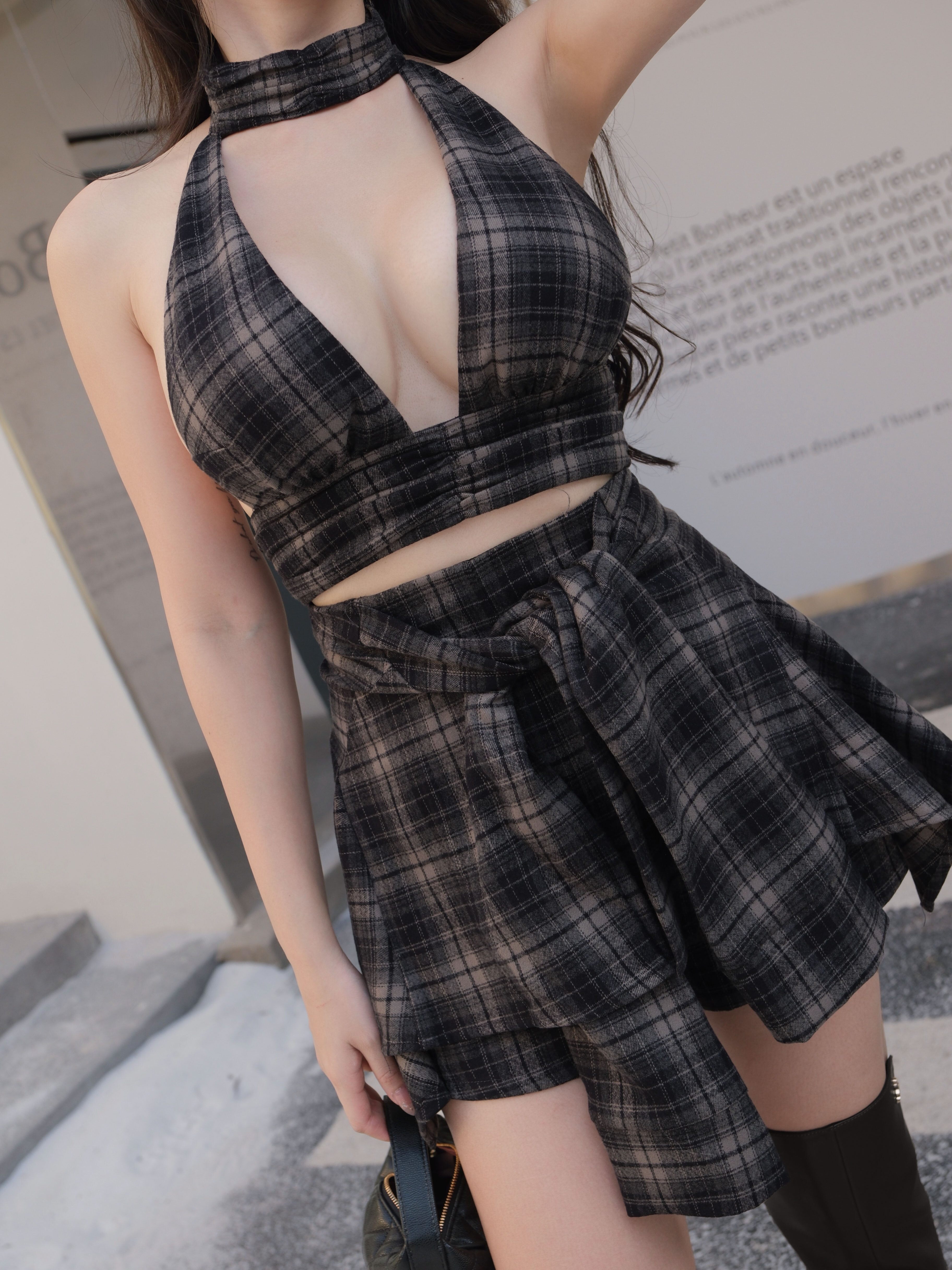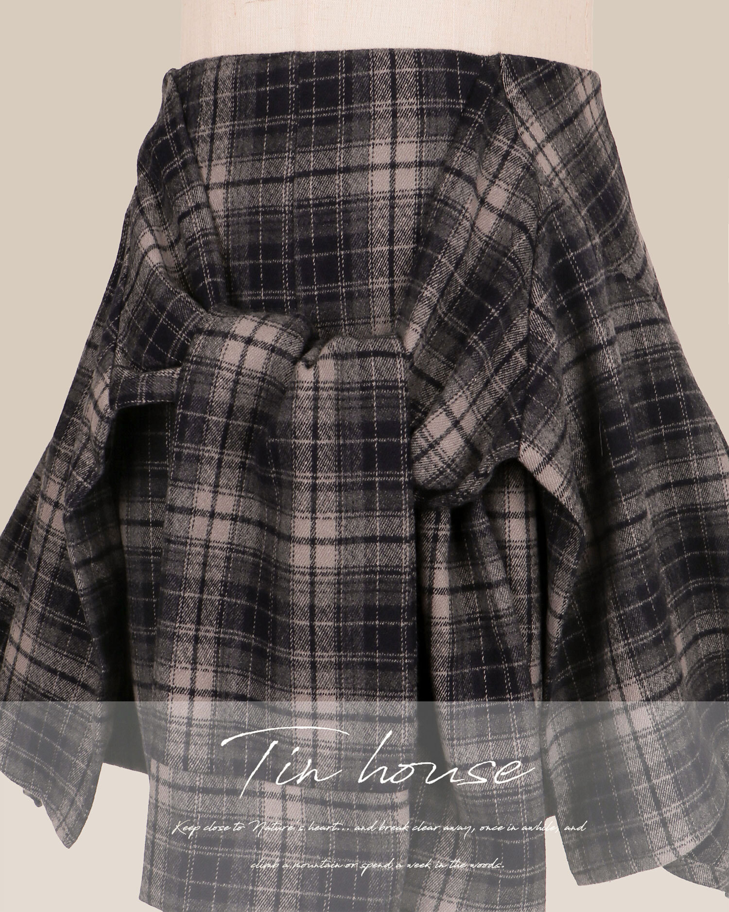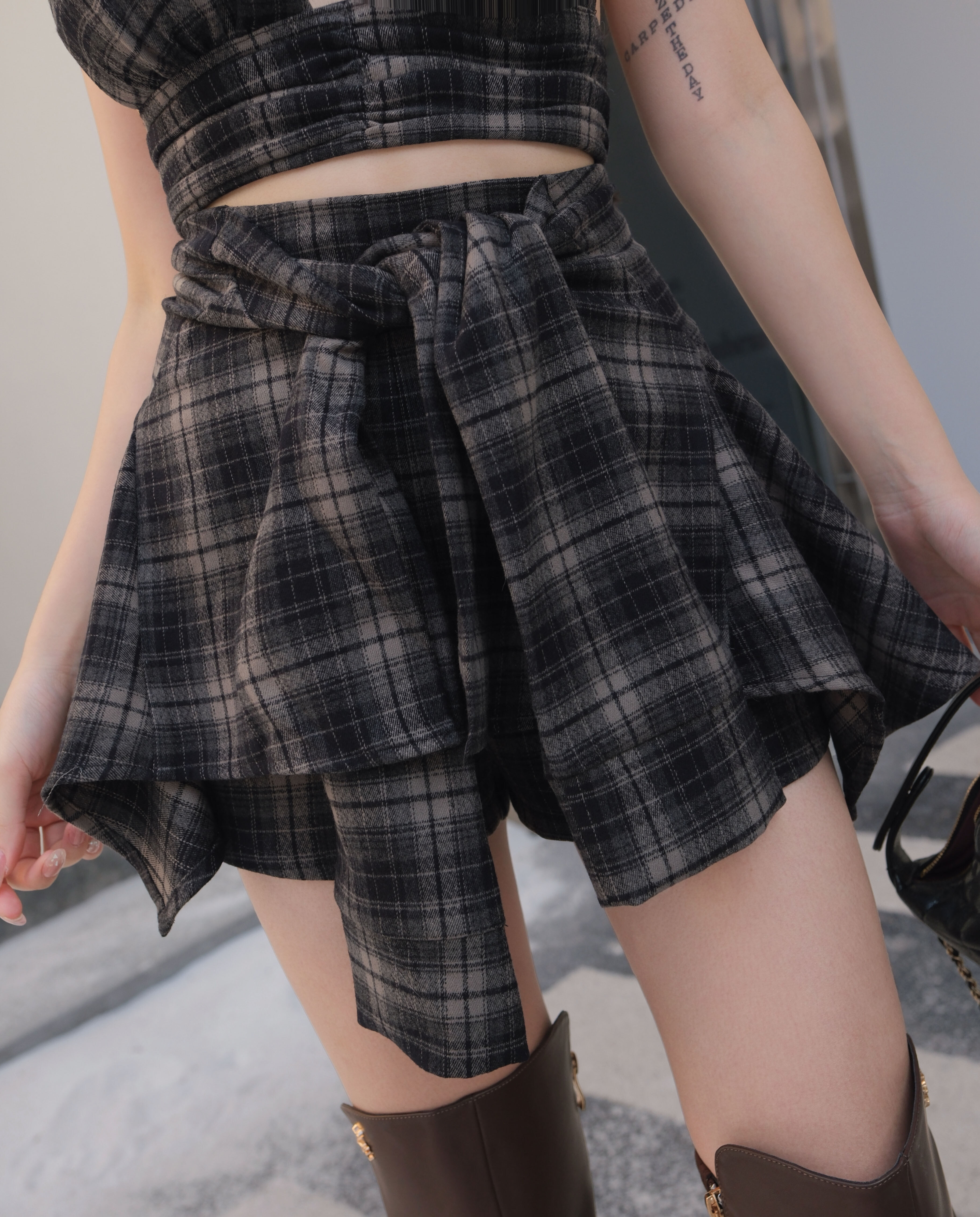 訂製-毛呢格紋假兩件綁帶短褲