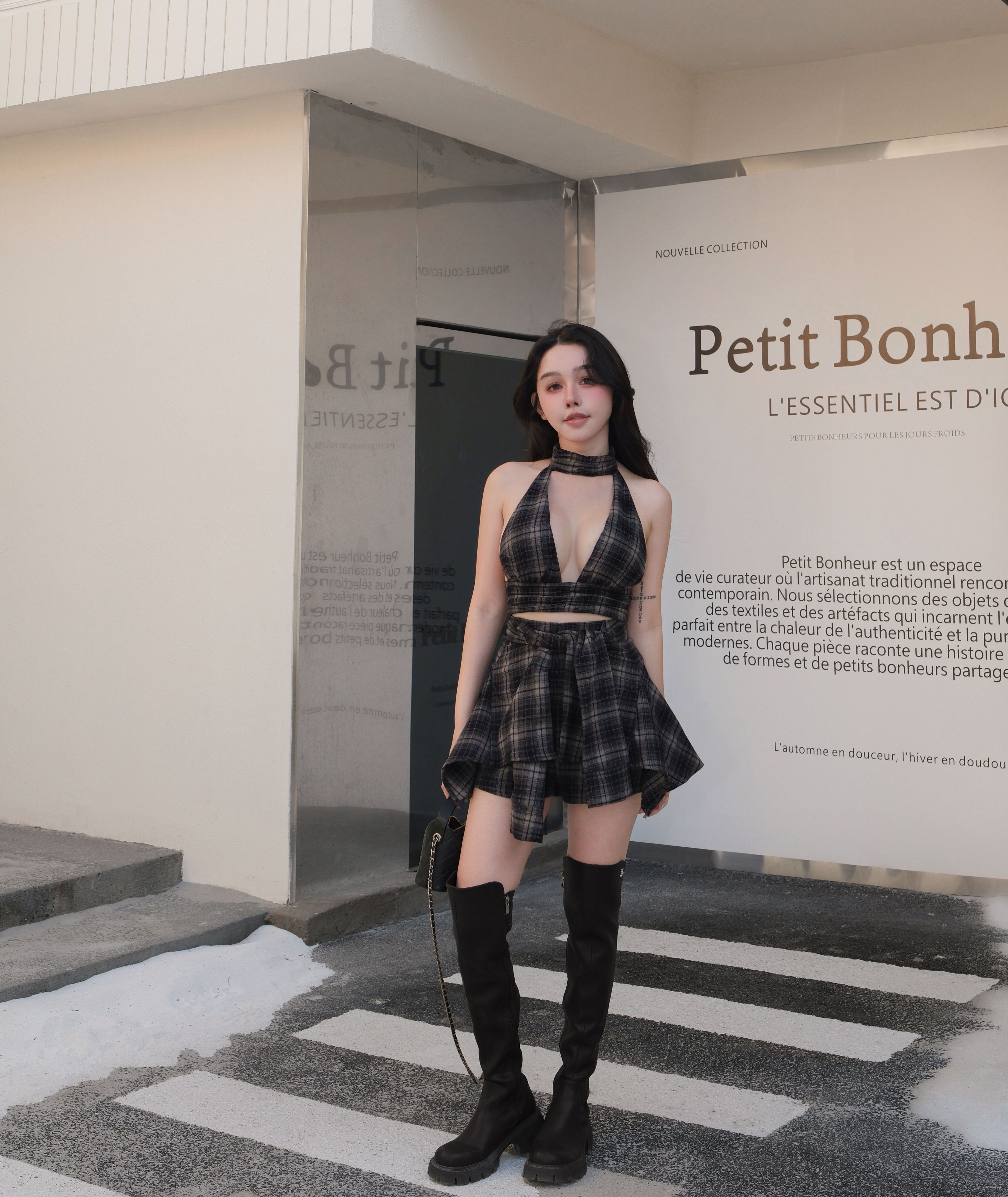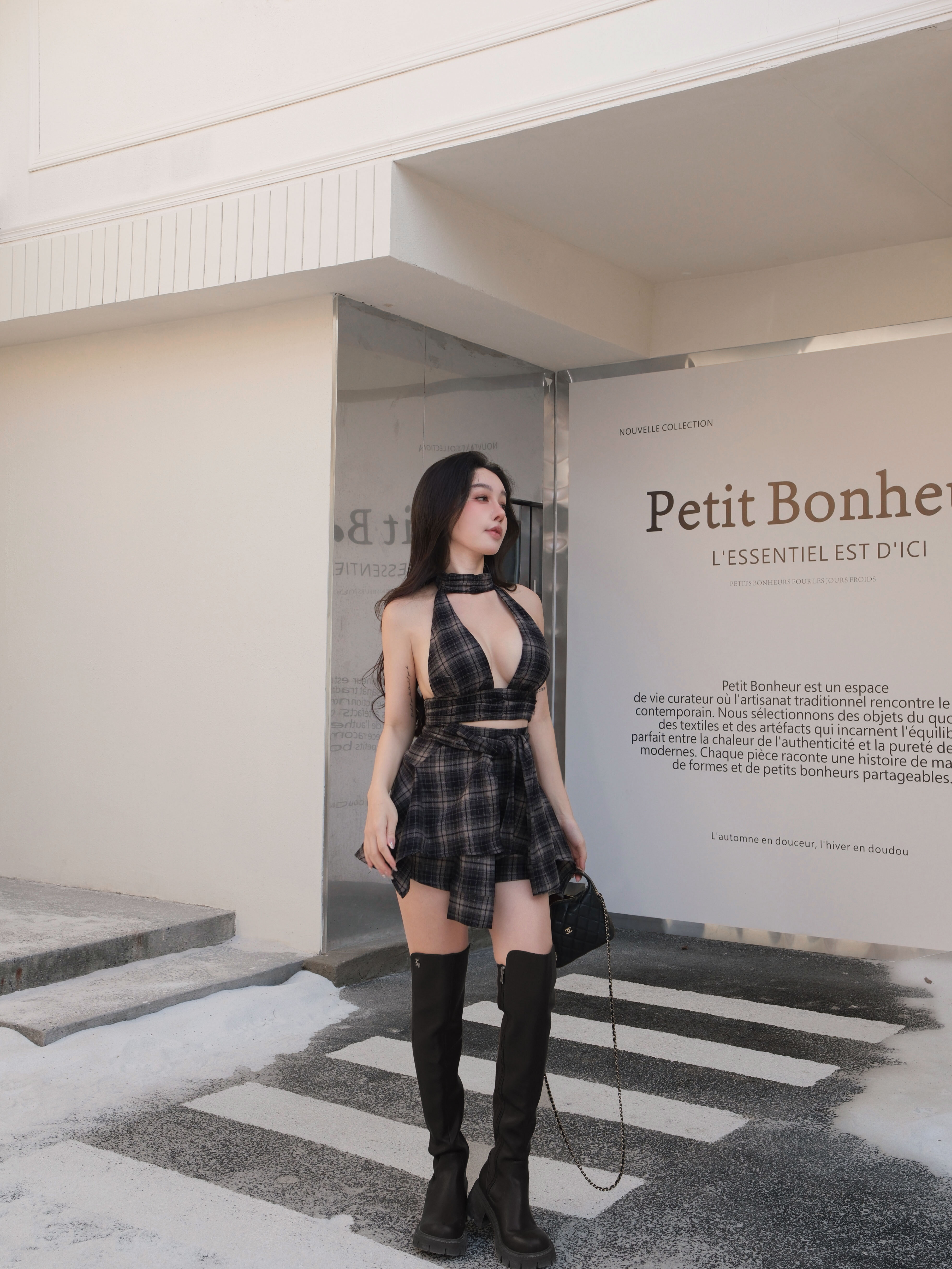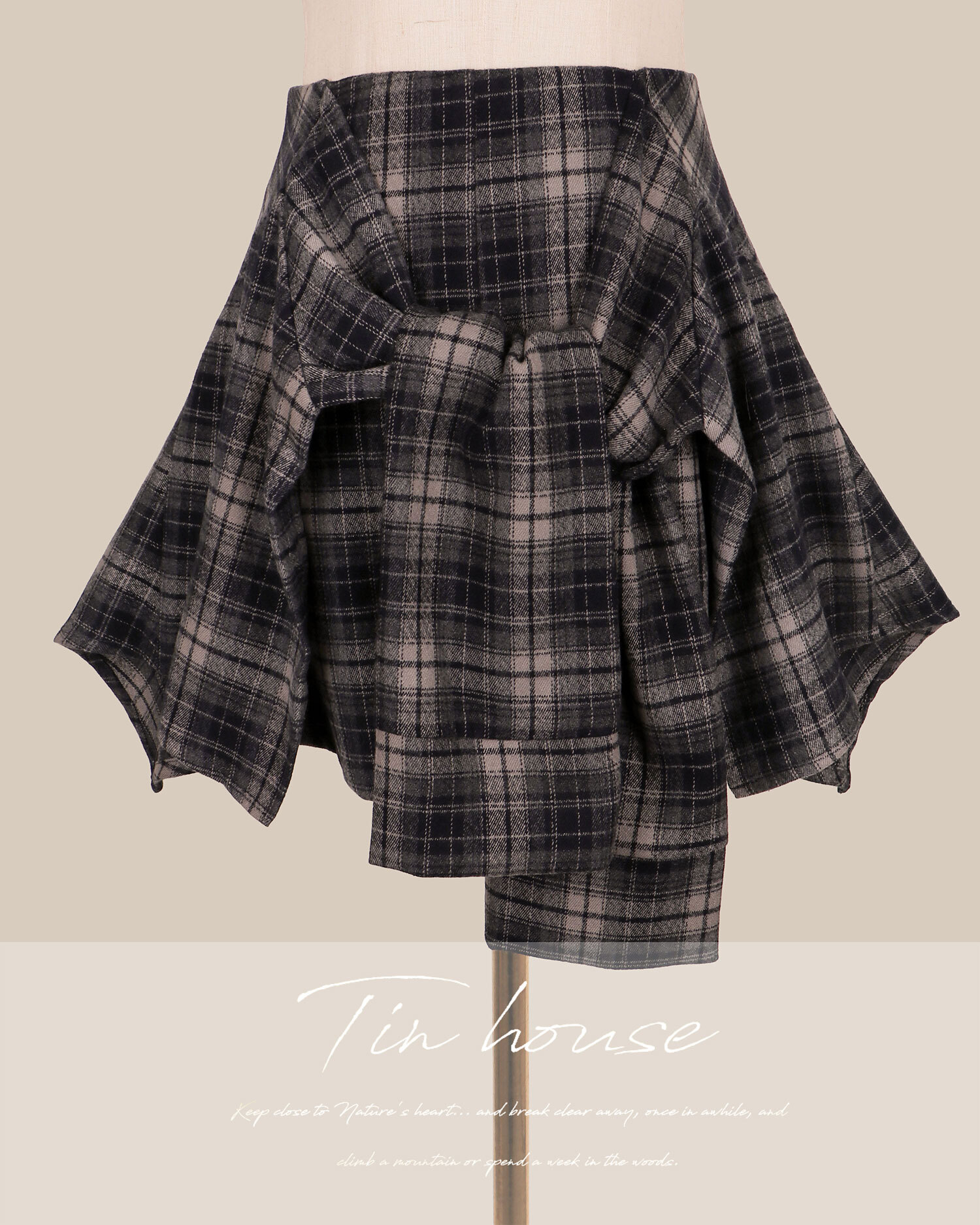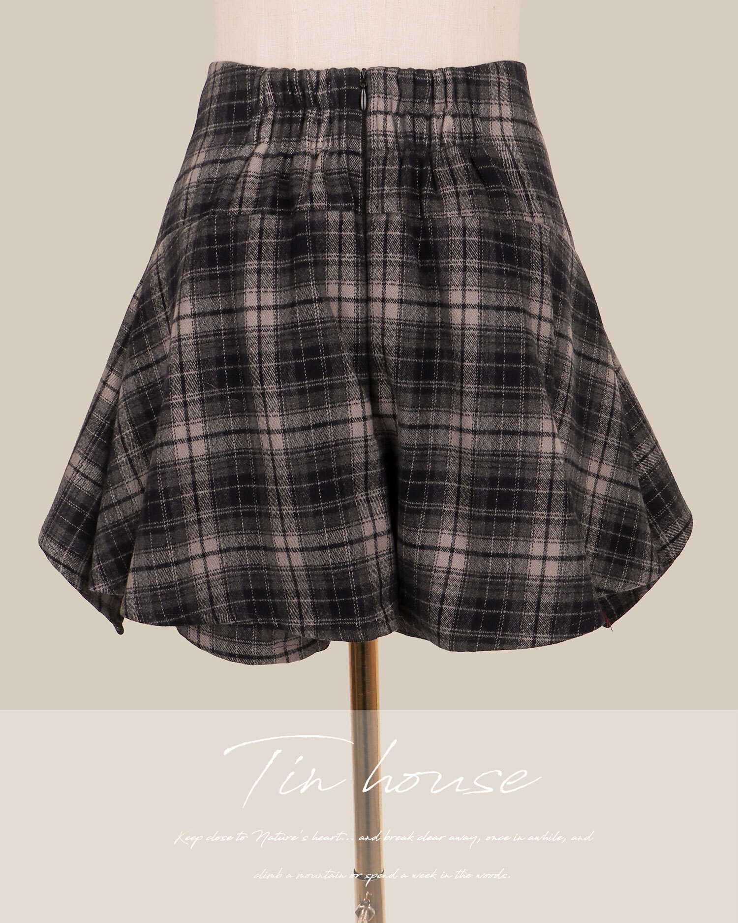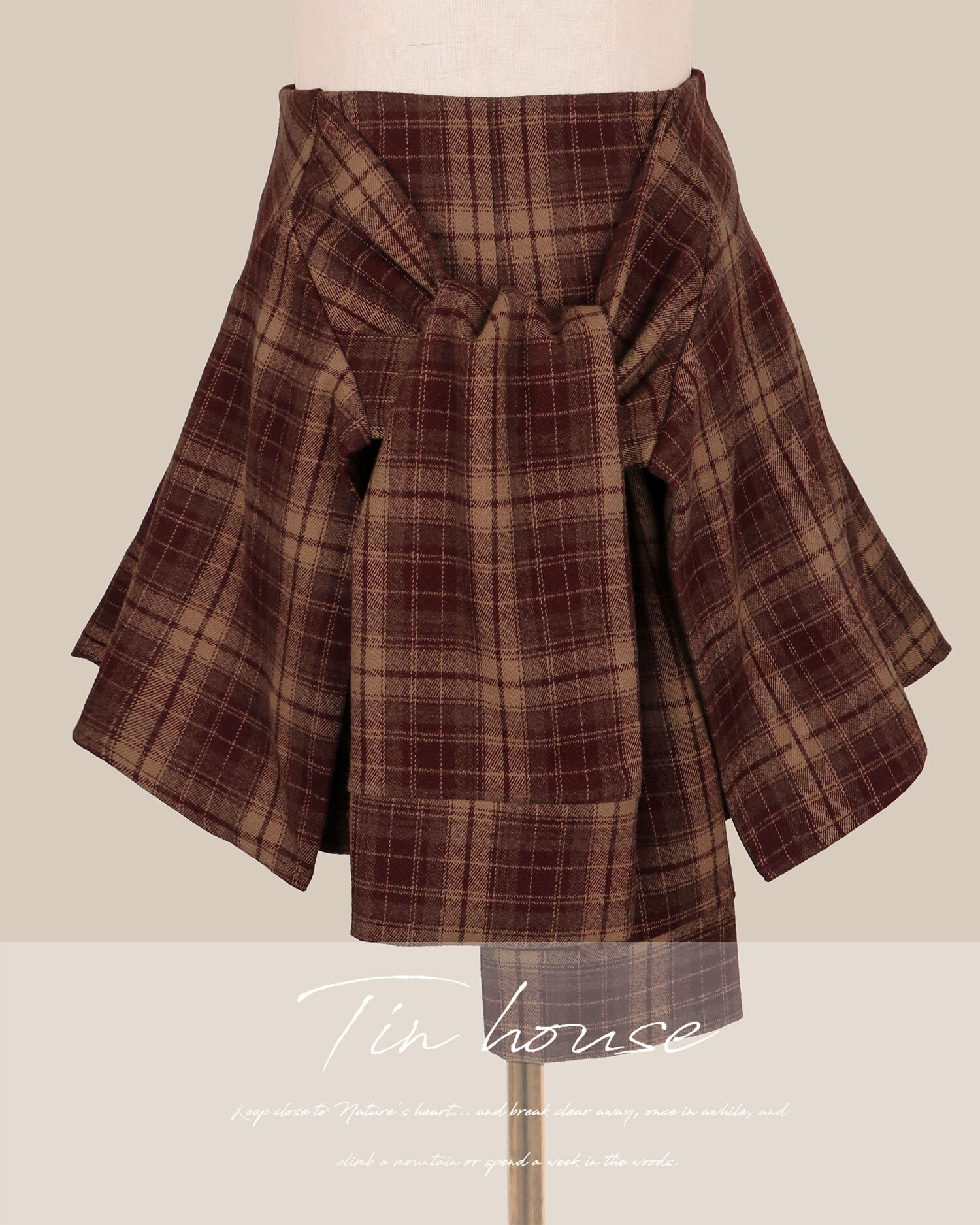 訂製-毛呢格紋假兩件綁帶短褲